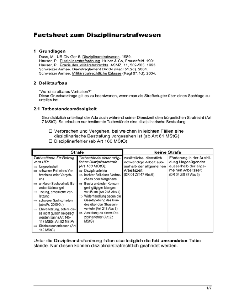 Factsheet zum Disziplinarstrafwesen 1 Grundlagen Duss, M., UR Div Ger 6. Disziplinarstrafwesen. 1989. Hauser, P., Disziplinarstrafordnung. Huber & Co, Frauenfeld. 1991 Hauser, P., Praxis des Militärstrafrechts. ASMZ, 11, 502-503. 1993 Schweizer Armee. Dienstreglement DR 04 (Regl 51.2d). 2004. Schweizer Armee. Militärstrafrechtliche Erlasse (Regl 67.1d). 2004. 2 Deliktaufbau "Wo ist strafbares Verhalten?" Diese Grundsatzfrage gilt es zu beantworten, wenn man als Strafbefugter über einen Sachlage zu urteilen hat. 2.1 Tatbestandesmässigkeit Grundsätzlich unterliegt der Ada auch während seiner Dienstzeit dem bürgerlichen Strafrecht (Art 7 MStG). So erlauben nur bestimmte Tatbestände eine disziplinarische Bestrafung. Verbrechen und Vergehen, bei welchen in leichten Fällen eine disziplinarische Bestrafung vorgesehen ist (ab Art 61 MStG) Disziplinarfehler (ab Art 180 MStG) Strafe Tatbestände für Beizug vom UR: ⇒ Ungewissheit ⇒ schwerer Fall eines Verbrechens oder Vergehens ⇒ unklarer Sachverhalt, Beweismittelmangel ⇒ Tötung, erhebliche Verletzung ⇒ schwerer Sachschaden (ab sFr. 20'000.-) ⇒ Ehrverletzung, sofern diese nicht gütlich beigelegt werden kann (Art 145148 MStG, Art 92 MStP) ⇒ Sichbestechenlassen (Art 142 MStG) Tatbestände einer möglicher Disziplinarstrafe (Art 180 MStG): ⇒ Disziplinarfehler ⇒ leichter Fall eines Verbrechens oder Vergehens ⇒ Besitz und/oder Konsum geringfügiger Mengen von Betm (Art 218 Abs 4) ⇒ Widerhandlung gegen die Gesetzgebung des Bundes über den Strassenverkehr (Art 218 Abs 3) ⇒ Anstiftung zu einem Disziplinarfehler (Art 22 MStG) keine Strafe zusätzliche, dienstlich notwendige Arbeit ausserhalb der allgemeinen Arbeitszeit (DR 04 Ziff 47 Abs 6) Förderung in der Ausbildung Ungenügender ausserhalb der allgemeinen Arbeitszeit (DR 04 Ziff 37 Abs 5) Unter die Disziplinarstrafordnung fallen also lediglich die fett umrandeten Tatbestände. Nur diesen können disziplinarstrafrechtlich geahndet werden. 1/7 2.2 Rechtswidrigkeit Keine Strafe ohne Gesetz: Strafbar ist nur, wer eine Tat begeht, die das Gesetz ausdrücklich mit Strafe bedroht (Art 1 MStG) Rechtfertigungsgründe resp. Schuldausschliessungsgünde für eine Rechtswidrigkeit: Notwehr, Notstand (Art 26 MStG) Unzurechnungsfähigkeit (Art 10 MStG) Handeln auf Befehl (Art 18 MStG), falls dem Untergebenen nicht bewusst war, dass er durch das Befolgen des Befehles an einer strafbaren Handlung mitwirkt. 2.3 Schuld Strafbar ist nur, wer schuldhaft handelt (Art 181 Abs 1 MStG), sei es vorsätzlich oder fahrlässig. Ist eine Tat nur bei Vorsatz strafbar, so darf eine fahrlässige Begehung auch nicht als leichter Fall disziplinarisch bestraft werden (Art 181 Abs 2 MStG) S C H Vorsatz (Art 15 Abs 2 MStG) • Vorsätzlich handelt, wer die Tat mit Wissen und Willen ausübt (Art 15 Abs 2 MStG) • Lehre und Rechtsprechung unterscheiden: Direkter Vorsatz Du wusstest und wolltest, was Du tatest ! Bedingter Vorsatz Du wusstest, was Du tatest, wolltest den Erfolg zwar nicht, hast Dich aber mit seinem möglichen Eintreten innerlich abgefunden ! U L D Fahrlässigkeit (Art 15 Abs 3 MStG) • Fahrlässig handelt, wer die Folgen seines Verhaltens aus pflichtwidrigen Unvorsichtigkeit nicht bedacht oder darauf nicht Rücksicht genommen hat (Ziff 304 Abs 3) • Pflichtwidrig ist die Unvorsichtigkeit, wenn der Täter die Vorsicht nicht beobachtet, zu der er nach den Umständen und nach seinen persönlichen Verhältnissen verpflichtet ist (Art 15 Abs 3 MStG) Du wolltest nicht, hättest aber wissen müssen, was Du tatest ! Eventualvorsatz Du wusstest, was Du tatest, wolltest den Erfolg zwar nicht, nahmst ihn aber auf gut Glück in Kauf ! ("Es wird schon nichts passieren") Factsheet 2/7 3 Strafzumessung Art und Mass der Strafe sind nach dem Verschulden zu bestimmen. Beweggründe, Vorleben, persönliche Verhältnisse und militärische Führung sind zu berücksichtigen (Art 181a Abs 1 MStG) Verschulden Wie hoch ist der in der Tat verkörperte rechtsbrecherische Wille zu veranschlagen? Beweggründe Strafschärfung: Rachsucht, Renitenz, Feigheit, Unkameradschaftlichkeit, Faulheit, Hinterlist, Subversivität und Anstiftung. Strafmilderung: Unbeholfenheit, Müdigkeit, Angst, Irrtum, Übereifer, Verleitung, Aufregung, verminderte Zurechnungsfähigkeit. Vorleben Das militärische Vorleben kann strafmildernd oder straferhöhend wirken. militärische Führung Der Führungsbericht ist unerlässlich und auf diesen ist schwergewichtig abzustellen. Ein positiver Bericht wirkt strafmildernd, ein negativer straferhöhend. weitere Gründe dienstliches Interesse (Sicherheit, geordneter Dienst, Disziplin, …) Wirkung der Strafe auf das Umfeld (Abschreckung) Folgen der Strafe (Nichtanrechnung der Dienstleistung, Verbüssung nach Entlassung, …) Es gilt im Disziplinarstrafwesen das Opportunitätsprinzip: Bei geringem Verschulden kann von einer Bestrafung abgesehen werden (Art 181a Abs 3) Mit anderen Worten: Sind die rechtlichen Grundlagen für eine Disziplinarstrafe gegeben, kann der Strafende bei leichten Fällen von einer Strafe absehen. Dabei hat sich der Strafende über folgende Fragen Rechenschaft abzulegen: 1. Wie reagiert der Täter, wenn ich diesen a) bestrafe b) nicht bestrafe? 2. Wie reagiert die Trp auf einer dieser Entscheide? Factsheet 3/7 4 Strafbefugnis Verweis (Art 186 MStG) Ausgangssperre (Art 187 MStG) 3-15 Tage ohne schlechte Einstel geringfügige lung Disziplinarfehler bei Strafempfindlichkeit ausdrückliche Bezeichnung als Strafe Arrest (Art 190 MStG) 1-10 Tage Disziplinarbusse (Art 188 MStG) max 500.-- innerhalb des Diensts max 1000.-- außerhalb des Diensts verwerfliche Einstellung Andere Sanktionen wie Strafarbeit, Strafkommandierungen, dubiose Geldzahlungen, Liegestützen oder ähnliches als Sanktion, Strafmärsche, Sanktionen durch Strafunbefugte (unteres Kader) sind unzulässig. Solche Handlungen wecken den Verdacht auf Verletzung der Menschenwürde (Ziff 79 Abs 3 DR 04) und andere Straftatbestä