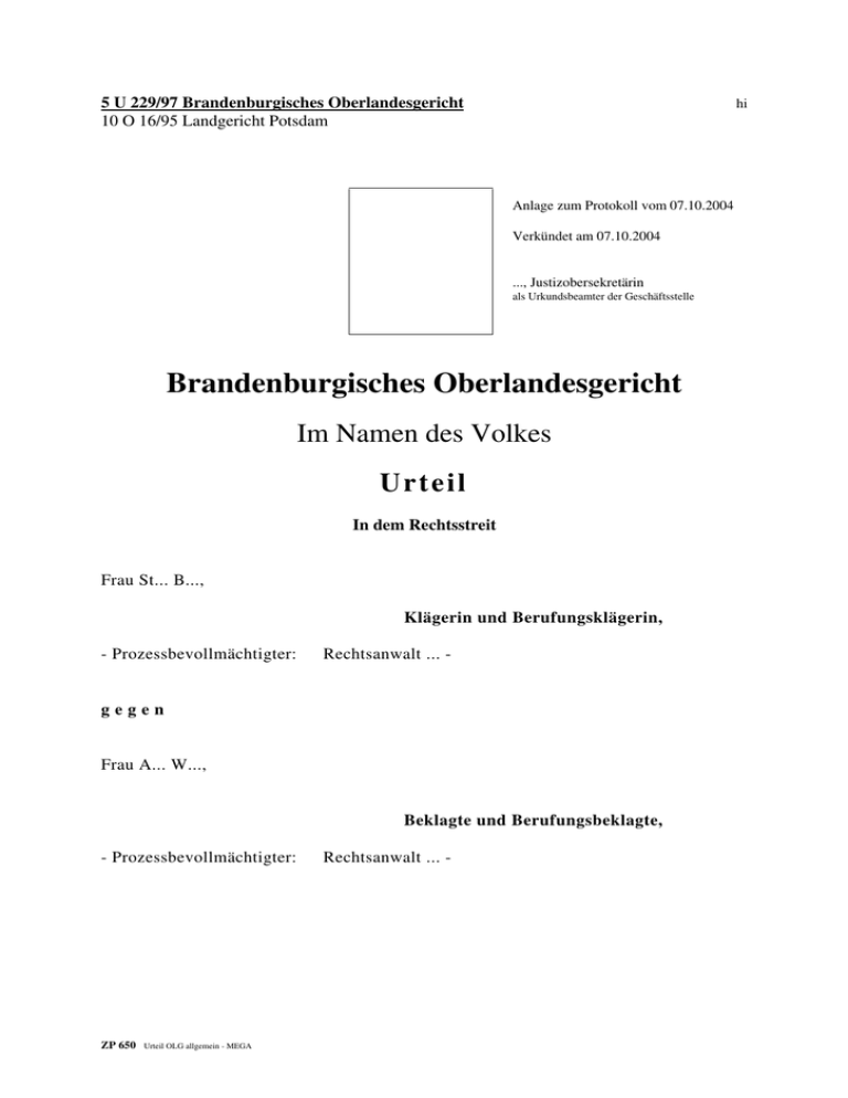 hi 5 U 229/97 Brandenburgisches Oberlandesgericht 10 O 16/95 Landgericht Potsdam Anlage zum Protokoll vom 07.10.2004 Verkündet am 07.10.2004 ..., Justizobersekretärin als Urkundsbeamter der Geschäftsstelle Brandenburgisches Oberlandesgericht Im Namen des Volkes U r t e il In dem Rechtsstreit Frau St... B..., Klägerin und Berufungsklägerin, - Prozessbevollmächtigter: Rechtsanwalt ... - gegen Frau A... W..., Beklagte und Berufungsbeklagte, - Prozessbevollmächtigter: ZP 650 Urteil OLG allgemein - MEGA Rechtsanwalt ... - -2hat der 5. Zivilsenat des Brandenburgischen Oberlandesgerichts auf die mündliche Verhandlung vom 26. August 2004 durch den Richter am Oberlandesgericht ..., den Richter am Oberlandesgericht ... sowie die Richterin am Oberlandesgericht ... für Recht erkannt: Die Berufung der Klägerin gegen das Urteil des Landgerichts Potsdam vom 18. September 1997 - 10 O 16/95 - wird zurückgewiesen. Die Kosten der Berufung sowie des Revisionsverfahrens trägt die Klägerin. Das Urteil ist vorläufig vollstreckbar. Die Klägerin darf die Vollstreckung der Beklagten durch Sicherheitsleistung in Höhe von 32.000,00 abwenden, wenn nicht die Beklagte vor der Vollstreckung Sicherheit in gleicher Höhe leistet. Die Revision wird nicht zugelassen. Tatbestand: Die Klägerin, Erbeserbin nach der am 11. Januar 1994 verstorbenen F... B..., verlangt von der Beklagten Zustimmung zur Grundbuchberichtigung sowie Räumung und Herausgabe eines Grundstücks. Die am 17. November 1910 geborene Erblasserin war nach dem Tode ihres vorverstorbenen Ehemannes im Jahre 1986 Alleineigentümerin des Grundstücks ... in ..., Gemarkung ..., Flur 13, Flurstück 62/2, eingetragen im Grundbuch von ... des Amtsgerichts Potsdam Blatt .... Mit notariellem Vertrag vom 10. September 1993, auf dessen Inhalt Bl. 8 ff. d.A. Bezug genommen wird, schenkte die Erblasserin der Beklagten dieses Grundstück und ließ es an sie auf. Die Beklagte wurde am 17. Dezember 1994 als Eigentümerin im Grundbuch eingetragen. Die Klägerin hat behauptet, die Erblasserin habe sich seit ca. 1987, spätestens jedoch seit einem stationären Krankenhausaufenthalt Ende 1992, als Folge zerebraler Durchblutungsstö- -3rungen und im Alter zunehmenden Alkoholabusus in einem dauernden, die freie Willensbildung ausschließenden Zustand krankhafter Störung der Geistestätigkeit befunden und sei deshalb zum Zeitpunkt des Abschlusses des Schenkungsvertrages geschäftsunfähig gewesen. Schenkungsvertrag und Auflassung seien unwirksam. Die Klägerin hat beantragt, die Beklagte zu verurteilen, 1. ihre Zustimmung zur Berichtigung des Grundbuchs dahingehend zu erteilen, dass nicht sie, sondern die Erben der Frau B... Eigentümer des Grundstücks sind, 2. das Grundstück zu räumen und an sie - die Klägerin - herauszugeben. Die Beklagte hat beantragt, die Klage abzuweisen. Sie hat bestritten, dass die Erblasserin sich am 10. September 1993 in einem die Geschäftsfähigkeit ausschließenden Zustand krankhafter Störung der Geistestätigkeit befunden habe. Mit Urteil vom 18. September 1997 hat das Landgericht Potsdam nach Beweisaufnahme die Klage abgewiesen. Zur Begründung hat es ausgeführt, dass auf der Grundlage des eingeholten Sachverständigengutachtens nicht festgestellt werden könne, dass zum maßgeblichen Zeitpunkt eines krankhafte Störung der Geistestätigkeit vorgelegen habe. Deshalb sei der Schenkungsvertrag wirksam und stehe der Inhalt des Grundbuchs mit der materiellen Rechtslage im Einklang. Wegen der Einzelheiten wird auf das Urteil des Landgerichts Potsdam (Bl. 219 ff. d.A.) Bezug genommen. Die Berufung der Klägerin gegen dieses Urteil hat der Senat nach weiterer Beweisaufnahme mit Urteil vom 9. März 2000 zurückgewiesen. Zur Begründung hat er ausgeführt, nach dem Ergebnis der zweitinstanzlichen Beweisaufnahme könne nicht mit der erforderlichen Sicher- -4heit festgestellt werden, dass sich die Veräußerin B... bei Abschluss des Vertrages am 10. September 1993 in einem die freie Willensbildung ausschließenden Zustand krankhafter Störung der Geistestätigkeit befunden habe, der nicht nur vorübergehender Art gewesen sei. Soweit der Sachverständige die erheblichen Schwierigkeiten der Erblasserin in der Vermögensverwaltung als Betreuungsgrund angesehen und ausgeführt habe, dass eine generelle Geschäftsunfähigkeit nicht sicher sei, in Bezug auf die Finanzen jedoch keine vernünftigen Zweifel bestünden, könne dieser rechtlichen Einordnung nicht gefolgt werden. Auf die Revision der Klägerin hat der Bundesgerichtshof mit Urteil vom 18. Mai 2001 - V ZR 126/00 - das Urteil des Senates vom 9. März 2000 - 5 U 229/97 - aufgehoben und die Sache zur anderweitigen Verhandlung und Entscheidung, auch über die Kosten des Revisionsverfahrens, an den Senat zurückverwiesen. Das Berufungsgericht habe auf der Grundlage der durchgeführten Beweisaufnahme - entgegen dem Sachverständigen - dargelegt, warum dem Gericht Zweifel an einer gegenständlich beschränkten Geschäftsunfähigkeit geblieben seien. Es habe damit bei seiner vom Sachverständigen abweichenden Auffassung die tatsächlichen Umstände anders gewürdigt, ohne die dazu notwendige eigene Sach- und Fachkunde darzulegen. Mit Beschluss vom 5. März 2002 hat das Amtsgericht Leipzig - 10 VI 0305/94 - die Nachlasspflegschaft für die unbekannten Erben nach Frau B... aufgehoben, da der Erbe ermittelt ist. Alleinerbin nach Frau B.. ist Frau H... E... C... L..., ... Straße ..., ... gewesen. Sie ist als Erbin nach Frau B... in den Rechtsstreit eingetreten. Sie ist am 13. Oktober 2003 verstorben und wurde durch ihre Tochter Frau St... B... allein beerbt. Diese hat mit Schriftsatz vom 12. Januar 2004 den Rechtsstreit als Erbin nach Frau L... aufgenommen. Die Parteien streiten darüber, ob die Erblasserin Frau B... bei Abschluss des Vertrages vom 10. September 1993 geschäftsunfähig gewesen sei. Die Klägerin behauptet, die Erblasserin sei zumindest nur beschränkt geschäftsfähig gewesen. Die