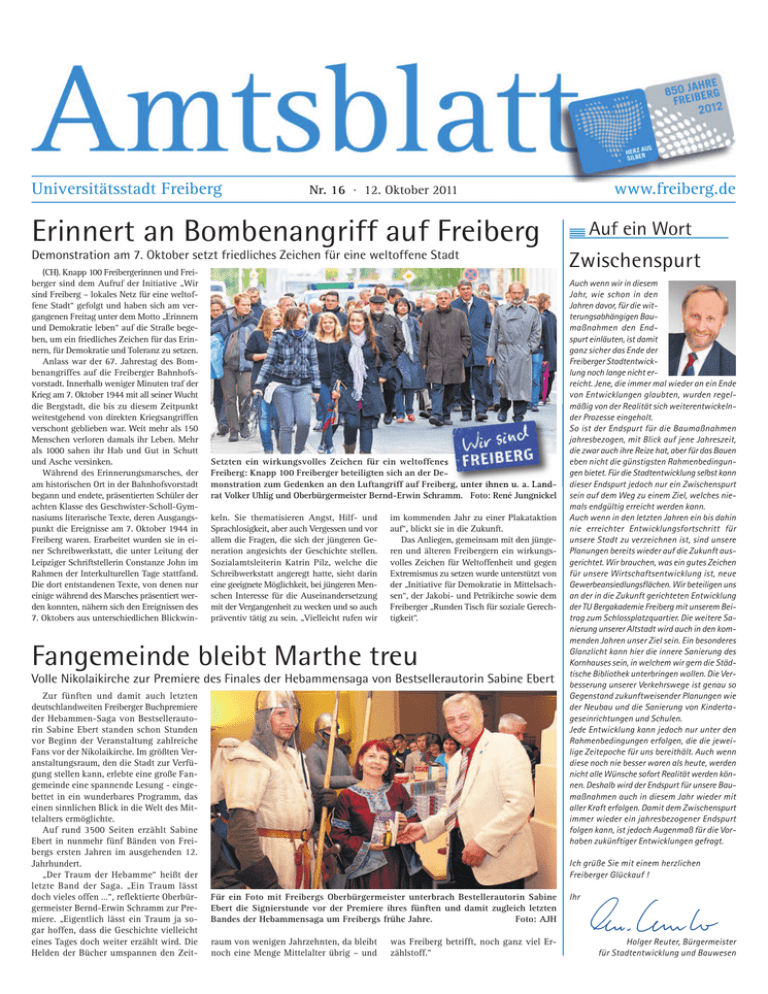 Universitätsstadt Freiberg www.freiberg.de Nr. 16 · 12. Oktober 2011 Erinnert an Bombenangriff auf Freiberg Demonstration am 7. Oktober setzt friedliches Zeichen für eine weltoffene Stadt (CH). Knapp 100 Freibergerinnen und Freiberger sind dem Aufruf der Initiative „Wir sind Freiberg – lokales Netz für eine weltoffene Stadt“ gefolgt und haben sich am vergangenen Freitag unter dem Motto „Erinnern und Demokratie leben“ auf die Straße begeben, um ein friedliches Zeichen für das Erinnern, für Demokratie und Toleranz zu setzen. Anlass war der 67. Jahrestag des Bombenangriffes auf die Freiberger Bahnhofsvorstadt. Innerhalb weniger Minuten traf der Krieg am 7. Oktober 1944 mit all seiner Wucht die Bergstadt, die bis zu diesem Zeitpunkt weitestgehend von direkten Kriegsangriffen verschont geblieben war. Weit mehr als 150 Menschen verloren damals ihr Leben. Mehr als 1000 sahen ihr Hab und Gut in Schutt und Asche versinken. Während des Erinnerungsmarsches, der am historischen Ort in der Bahnhofsvorstadt begann und endete, präsentierten Schüler der achten Klasse des Geschwister-Scholl-Gymnasiums literarische Texte, deren Ausgangspunkt die Ereignisse am 7. Oktober 1944 in Freiberg waren. Erarbeitet wurden sie in einer Schreibwerkstatt, die unter Leitung der Leipziger Schriftstellerin Constanze John im Rahmen der Interkulturellen Tage stattfand. Die dort entstandenen Texte, von denen nur einige während des Marsches präsentiert werden konnten, nähern sich den Ereignissen des 7. Oktobers aus unterschiedlichen Blickwin- Setzten ein wirkungsvolles Zeichen für ein weltoffenes Freiberg: Knapp 100 Freiberger beteiligten sich an der Demonstration zum Gedenken an den Luftangriff auf Freiberg, unter ihnen u. a. Landrat Volker Uhlig und Oberbürgermeister Bernd-Erwin Schramm. Foto: René Jungnickel keln. Sie thematisieren Angst, Hilf- und Sprachlosigkeit, aber auch Vergessen und vor allem die Fragen, die sich der jüngeren Generation angesichts der Geschichte stellen. Sozialamtsleiterin Katrin Pilz, welche die Schreibwerkstatt angeregt hatte, sieht darin eine geeignete Möglichkeit, bei jüngeren Menschen Interesse für die Auseinandersetzung mit der Vergangenheit zu wecken und so auch präventiv tätig zu sein. „Vielleicht rufen wir im kommenden Jahr zu einer Plakataktion auf“, blickt sie in die Zukunft. Das Anliegen, gemeinsam mit den jüngeren und älteren Freibergern ein wirkungsvolles Zeichen für Weltoffenheit und gegen Extremismus zu setzen wurde unterstützt von der „Initiative für Demokratie in Mittelsachsen“, der Jakobi- und Petrikirche sowie dem Freiberger „Runden Tisch für soziale Gerechtigkeit“. Fangemeinde bleibt Marthe treu Volle Nikolaikirche zur Premiere des Finales der Hebammensaga von Bestsellerautorin Sabine Ebert Zur fünften und damit auch letzten deutschlandweiten Freiberger Buchpremiere der Hebammen-Saga von Bestsellerautorin Sabine Ebert standen schon Stunden vor Beginn der Veranstaltung zahlreiche Fans vor der Nikolaikirche. Im größten Veranstaltungsraum, den die Stadt zur Verfügung stellen kann, erlebte eine große Fangemeinde eine spannende Lesung - eingebettet in ein wunderbares Programm, das einen sinnlichen Blick in die Welt des Mittelalters ermöglichte. Auf rund 3500 Seiten erzählt Sabine Ebert in nunmehr fünf Bänden von Freibergs ersten Jahren im ausgehenden 12. Jahrhundert. „Der Traum der Hebamme“ heißt der letzte Band der Saga. „Ein Traum lässt doch vieles offen …“, reflektierte Oberbürgermeister Bernd-Erwin Schramm zur Premiere. „Eigentlich lässt ein Traum ja sogar hoffen, dass die Geschichte vielleicht eines Tages doch weiter erzählt wird. Die Helden der Bücher umspannen den Zeit- Auf ein Wort Zwischenspurt Auch wenn wir in diesem Jahr, wie schon in den Jahren davor, für die witterungsabhängigen Baumaßnahmen den Endspurt einläuten, ist damit ganz sicher das Ende der Freiberger Stadtentwicklung noch lange nicht erreicht. Jene, die immer mal wieder an ein Ende von Entwicklungen glaubten, wurden regelmäßig von der Realität sich weiterentwickelnder Prozesse eingeholt. So ist der Endspurt für die Baumaßnahmen jahresbezogen, mit Blick auf jene Jahreszeit, die zwar auch ihre Reize hat, aber für das Bauen eben nicht die günstigsten Rahmenbedingungen bietet. Für die Stadtentwicklung selbst kann dieser Endspurt jedoch nur ein Zwischenspurt sein auf dem Weg zu einem Ziel, welches niemals endgültig erreicht werden kann. Auch wenn in den letzten Jahren ein bis dahin nie erreichter Entwicklungsfortschritt für unsere Stadt zu verzeichnen ist, sind unsere Planungen bereits wieder auf die Zukunft ausgerichtet. Wir brauchen, was ein gutes Zeichen für unsere Wirtschaftsentwicklung ist, neue Gewerbeansiedlungsflächen. Wir beteiligen uns an der in die Zukunft gerichteten Entwicklung der TU Bergakademie Freiberg mit unserem Beitrag zum Schlossplatzquartier. Die weitere Sanierung unserer Altstadt wird auch in den kommenden Jahren unser Ziel sein. Ein besonderes Glanzlicht kann hier die innere Sanierung des Kornhauses sein, in welchem wir gern die Städtische Bibliothek unterbringen wollen. Die Verbesserung unserer Verkehrswege ist genau so Gegenstand zukunftweisender Planungen wie der Neubau und die Sanierung von Kindertageseinrichtungen und Schulen. Jede Entwicklung kann jedoch nur unter den Rahmenbedingungen erfolgen, die die jeweilige Zeitepoche für uns bereithält. Auch wenn diese noch nie besser waren als heute, werden nicht alle Wünsche sofort Realität werden können. Deshalb wird der Endspurt für unsere Baumaßnahmen auch in diesem Jahr wieder mit aller Kraft erfolgen. Damit dem Zwischenspurt immer wieder ein jahresbezogener Endspurt folgen kann, ist jedoch Augenmaß für die Vorhaben zukünftiger Entwicklungen gefragt. Ich grüße Sie mit einem herzlichen Freiberger Glückauf ! Für ein Foto mit Freibergs Oberbürgermeister unterbrach Bestellerautorin Sabine Ebert die Signierstunde vor der Premiere ihres fü