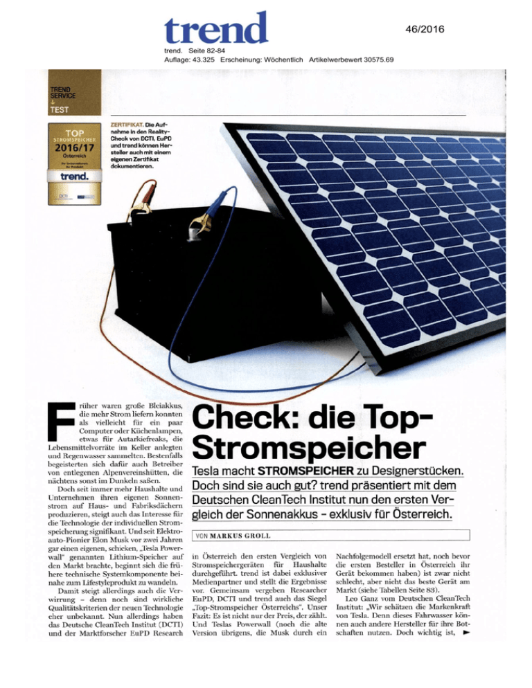 46/2016 trend. Seite 82-84 Auflage: 43.325 Erscheinung: Wöchentlich Artikelwerbewert 30575.69 Früher waren große Bleiakkus, die mehr Strom liefern konnten als vielleicht für ein paar Computer oder Küchenlampen, etwas für Autarkiefreaks, die Lebensmittelvorräte im Keller anlegten und Regenwasser sammelten. Bestenfalls begeisterten sich dafür auch Betreiber von entlegenen Alpenvereinshütten, die nächtens sonst im Dunkeln saßen. Doch seit immer mehr Haushalte und Unternehmen ihren eigenen Sonnenstrom auf Haus- und Fabriksdächern produzieren, steigt auch das Interesse für die Technologie der individuellen Stromspeicherung signifikant. Und seit Elektroauto-Pionier Elon Musk vor zwei Jahren gar einen eigenen, schicken, "Tesla Powerwall" genannten Lithium-Speicher auf den Markt brachte, beginnt sich die frühere technische Systemkomponente beinahe zum Lifestyleprodukt zu wandeln. Damit steigt allerdings auch die Verwirrung denn noch sind wirkliche Qualitätskriterien der neuen Technologie eher unbekannt. Nun allerdings haben das Deutsche CleanTech Institut (DCTI) und der Marktforscher EuPD Research - Check: die TopStromspeicher Tesla macht STROMSPEICHER zu Designerstücken. Doch sind sie auch gut? trend präsentiert mit dem Deutschen CleanTech Institut nun den ersten Vergleich der Sonnenakkus exklusiv für Österreich. - VON MARKUS GROLL Österreich den ersten Vergleich von Stromspeichergeräten für Haushalte durchgeführt, trend ist dabei exklusiver Medienpartner und stellt die Ergebnisse vor. Gemeinsam vergeben Researcher EuPD, DCTI und trend auch das Siegel "Top-Stromspeicher Österreichs". Unser Fazit: Es ist nicht nur der Preis, der zählt. Und Teslas Powerwall (noch die alte in Version übrigens, die Musk durch ein Nachfolgemodell ersetzt hat, noch bevor die ersten Besteller in Österreich ihr Gerät bekommen haben) ist zwar nicht schlecht, aber nicht das beste Gerät am Markt (siehe Tabellen Seite 83). Leo Ganz vom Deutschen CleanTech Institut: "Wir schätzen die Markenkraft von Tesla. Denn dieses Fahrwasser können auch andere Hersteller für ihre Botschaften nutzen. Doch wichtig ist, Lithium-Hausspeicher über 5 kWh Lithium-Kleinspeicher unter 5 kWh SENEC/DEV SENEC.Home Li 5.0 sonnen Sonnenbatterie Eco 2 BYD B-Box 5.0 Fenecon SENEC.Home Li 2.5 SENEC/DEV sonnen Sonnenbatterie Eco 4 Fenecon BYD B-Box 2.5 B-Box 5.0 BYD Mercedes Benz Energy Home 2.5 RESU 3.3 LG Chem BYD B-Box 2,5 Garamanta GARABAT 4.2 0.08 0,09 0.10 0.11 0,11 0,11 0.11 0,12 0.13 0.13 0,27 ET SolarPower (Nano DC; Nano DCI), Solarworld (SunPac LiOn 4). LG Electronics (ED46C03KE00). E3/DC (S10 E All in One), Varta (VARTA home 4.15 kWh), Hoppecke (sun | powerpack premium 5.0/48), Varta (VARTA home 3.69 kWh; 3.23 kWh, 2.77 kWh), Energy Depot Deutschland (ESS PILUM 3.0), E.ON Energie (E.ON Aura 500), Fenecon (Mini Hybrid 3-3) Varta (VARTA home 4.61 kWh,) Fenecon (Mini 3-3), Kostal (PIKO Battery Li 4.8), Peus-Testing (Li 1.9; Li 2.0), Varta (VARTA element 3), Kostal (PIKO Battery Li 3.6), Peus-Testing (Li 2.5), Neovoltaic (neoStore flex), Solutronic (fünf Modelle) * in Euro je nutzbarer Kilowattstunde. Die angeführten Geräte kosten je nach Speicherkapazität zwischen 5.000 und 15.000 Euro. Nähere Infos unter: www.trend.atsowie www.dcti.de. SolarWorld (SunPac LiOn 10). BYD (B-Box 10.0), BYD (B-Box 7.5), sonnen (Sonnenbatterie Eco 14, Eco 12), Varta (VARTA home 6.92 kWh; 6.45 kWh; 5.99 kWh), ads-tech (SRS0006; SRS0009), Varta (VARTA home 5.53 kWh; 5.07 kWh), Energy Depot Bleiakkumulatoren Deutschland (ESS PILUM 9.0), Varta (VARTA element 6), Fenecon (Mini Hybrid 3-6), Energy Depot Deutschland (ESS PILUM 6.0), Kostal (PIKO Battery Li 9.6; PIKO Battery Li 8.4), Energy Depot Deutschland (ESS OPTIO 9.0), Garamanta (GARABAT 8.4) Mercedes Benz Energy (Home 12.5), LG Chem (RESU 7H), Solarworld (SunPac LiOn 6). Varta (VARTA family 11.54 kWh; GNB Industrial Power (Sonnenschein@home SH48V8.0-S), Hoppecke (sun | powerpack classic 8,0/24; 6,4/48; 5,5/24). keine Geräte in der Wertung BEWERTUNG. | Kfi 14DIEParameter: Die | " | ? ö Platzierung ergab sich aus der (gewichteten) Gesamtpunkteanzahl für 14 Vergleichsparameter: Speichervolumen, Preis, Lebensdauer, Autarkie, Notstromfähigkeit, Wetterprognose, Händlerzertifizie- 11.08 kWh; 10.62 kWh; 10.15 kWh; 9.69 kWh; 9.23 kWh; 8.77 kWh; 8.31 kWh; 7.85 kWh). Fenecon (Mini 3-6), Varta (VARTA family 7.39 kWh), innogy SE (Storage flex 6), Varta (VARTA family 6.93 kWh; 6.47 kWh; 6.01 kWh; 5.54 kWh; 5.08 kWh), Hoppecke (sun | powerpack premium 7.5/48), Varta (VARTA element 9), Akasol (Akasol neeoRack; Akasol neeoQube), Fronius (Fronius Solar Battery 10.5; 9.0; 7.5; 6.0). Zerlegbarkeit, Gewicht, mit unterdurchschnittlicher Gröfee, Hotline, Onlinekommunika- Bewertung ausgeschieden. Die rung, tion, Vor-Ort-Präsenz, Garantie. Daher können auch scheinbar teurere Geräte bessere Bewertungen erreichen. Vergleich untereinander: Von 225 Produkten am Markt wurde die Hälfte bessere Hälfte wurde noch einmal sortiert (nach 67 %- bzw. 84 %Quantilen): Das oberste Drittel (gesamt also das beste Sechstel) erhielt Gold-, das mittlere Silber-, und das drittbeste Bronze-Status. Preisje nutzbarer Kilowattstunde (Lebenszykluskosten): Ein berechneter Spezialwert (ohne Wechselrichter), der neben dem Speichervolumen auch jahrelange Nutzungsparameter berücksichtigt (Entladeraten, maximale Leistung, Lebensdauer). TREND SERVICE das beste Preis-Leistungs-Verhalten herauszufiltern. Die persönliche Kaufentscheidung sollte jedenfalls nicht nur an den Kosten je Kilowattstunde festgemacht werden." DER HAKEN AN DER SACHE: Beinahe jeder Produzent sucht in dem eben aufkommenden Markt seine Positionierung und versucht, die unterschiedlichsten Kennwerte als Erfolgskriterium herauszustellen. Jeder dieser Werte hat aber wiederum eine Einschränkung. So sagt etwa die Menge an speicherbarem Strom noch nichts darüber aus, wie viel davon auch abgerufen werden kann, ohne den Speicher zu schädigen ("Entladerate"), oder w