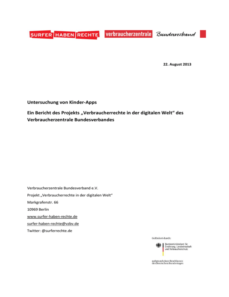 22. August 2013 Untersuchung von Kinder-Apps Ein Bericht des Projekts „Verbraucherrechte in der digitalen Welt“ des Verbraucherzentrale Bundesverbandes Verbraucherzentrale Bundesverband e.V. Projekt „Verbraucherrechte in der digitalen Welt“ Markgrafenstr. 66 10969 Berlin www.surfer-haben-rechte.de [email protected] Twitter: @surferrechte.de Untersuchungsbericht – Kinder-Apps 22. August 2013 I. Einleitung Die Nutzung von internetfähigen Handys steigt rasant. Im Jahr 2013 werden in Deutschland voraussichtlich 28 Millionen Smartphones verkauft. Einher mit dieser Entwicklung geht der AppMarkt. Apps (Applikationen) sind kleine Anwendungsprogramme mittels deren der Nutzer spezielle Dienste wie beispielsweise Nachrichten, Wetterinformationen oder Unterhaltung auf sein Smartphone herunter laden kann. In Deutschland nutzen 83 Prozent der Smartphone-Besitzer Apps. Weltweit gibt es mehr als 1,8 Millionen Apps. Allein in Deutschland wurden im Jahr 2012 1,7 Milliarden Apps heruntergeladen.1 42,6 Prozent der Smartphonebesitzer nutzen ihr Gerät, um darauf zu spielen. 2 Mit dem Kauf von Apps wurden 2012 in Deutschland 430 Millionen Euro umgesetzt, mehr als doppelt so viel wie 2011. 3 Laut BITKOM, dem Branchenverband der Informationswirtschaft, sind „Apps zu einem echten Wirtschaftsfaktor geworden“.1 Dieser Boom geht auch nicht an Kindern vorbei. Schließlich verfügt jedes zweite Kind zwischen 6 und 13 Jahren über ein Handy oder Smartphone 4. Auch hier zeichnet sich ein klarer Trend zur Nutzung von Apps ab: Bereits 26 Prozent der 6-13-jährigen Kinder installieren sich Apps auf ihr Mobilfunkgerät. 5 Bei den 12-13-jährigen Kindern zählt jeder zweite App-Nutzer Spiele zu seinen drei wichtigsten Apps.6 Die Kehrseite dieses Wirtschaftsbooms und damit der Medaille, zeichnet sich dort ab, wo Kinder durch die Nutzung von Apps in Kostenfallen geraten oder im Hinblick auf ihr Alter mit unangemessener Werbung oder nicht kindgerechten Inhalten konfrontiert werden. Demgegenüber steht das wirtschaftliche Interesse der App-Entwickler und Anbieter. Insbesondere kostenlose Apps finanzieren sich entweder durch Werbung oder lassen sich den Dienst mit den Daten der Nutzer bezahlen oder durch In-App-Käufe. Zielend auf die wirtschaftliche Kaufkraft der Kinder richten sich App-Angebote zunehmend auch an diese und zwar ungeachtet dessen, dass Kinder im Umgang mit der Nutzung von Apps weniger kritisch sind, mögliche Fallstricke und Kostenfallen in den Apps oder die dort eingebundene Werbung nicht erkennen. 1 Zahlenmaterial vom BITKOM: (Bundesverband Informationswirtschaft, Telekommunikation und neue Medien e.V.) http://www.bitkom.org/de/presse/8477_76094.aspx und http://www.bitkom.org/de/themen/54866_74940.aspx 2 http://de.statista.com/statistik/daten/studie/241672/umfrage/nutzung-von-apps-in-deutschland-nach-app-kategorien 3 BITKOM: http://www.bitkom.org/de/presse/8477_76182.aspx 4 "SCHAU HIN!": http://schau-hin.info/handy-smartphone-tablet/klare-regeln-fuer-die-smartphonenutzung-bei-kindern-1.html 5 KIM-Studie 2012: http://www.mpfs.de/fileadmin/KIM-pdf12/KIM_2012.pdf 6 JIM-Studie 2012: http://www.mpfs.de/fileadmin/JIM-pdf12/JIM2012_Endversion.pdf Seite | 2 Untersuchungsbericht – Kinder-Apps 22. August 2013 II. Untersuchung Das Projekt „Verbraucherrechte in der digitalen Welt“ des Verbraucherzentrale Bundesverbands (vzbv) hatte im Juni 2013 eine Reihe von Apps überprüft, die sich von ihrer Art und inhaltlichen Gestaltung her offenkundig speziell an Kinder richten. Gegenstand der Untersuchung waren die in einzelnen Apps eingebundene Werbung, Kaufaufforderungen und In-App-Käufe. Überprüft wurden auch die Nutzerinformationen und die Maßnahmen zur Sicherstellung des Jugendmedienschutzes. Insgesamt wurden die Inhalte von 32 Apps, die sich speziell an Kinder richten und aus den Bereichen der Unterhaltung und der Spiele stammen, überprüft. Der Fokus lag dabei auf kostenlosen Apps, da sich diese in der Regel über Werbung und sogenannte „In-App-Käufe“ finanzieren und insbesondere letztere in den vergangenen Monaten verstärkt in die öffentliche Kritik geraten waren. Da auch diese Apps stetig durch Updates weiter- und fortentwickelt werden, stellt die Untersuchung nur eine Momentaufnahme dar. Aus diesem Grund wurden exemplarisch in drei Fällen gegen die Anbieter der beanstandeten Spiele-Apps Unterlassungsverfahren eingeleitet. III. Problemfelder im Überblick 1. Werbung mit kostenlosen Apps 2. In-App-Käufe 3. Wartezeiten in Spielen 4. Kaufaufforderungen und Sonderangebote 5. Freischaltung eingeschränkter Versionen 6. Bezahlmöglichkeiten 7. Werbung 8. Einbindung von externen Social-Media-Tools 9. Allgemeine Geschäftsbedingungen und Impressum Seite | 3 Untersuchungsbericht – Kinder-Apps 22. August 2013 IV. Problemfelder im Einzelnen 1. Werbung mit kostenloser App Bekanntlich kriegt man in dieser Welt fast nichts umsonst. Das gilt auch für viele der ansonsten als kostenlos angepriesenen Apps. Denn wo kostenlos drauf steht, muss nicht kostenlos drin sein. Den meisten erwachsenen Nutzern mag noch klar sein, dass sich solche Apps in irgendeiner Form, sei es durch Werbung, durch eine gewerbliche Nutzung anfallender Kundendaten oder durch In-App-Käufe refinanzieren. Kinder hingegen durchschauen diese Art von Geschäftsmodell nicht. Wenn „gratis“ oder „kostenlos“ drauf steht, dann sollte die Apps gemäß der kindlichen Erwartung auch ohne Bezahlung frei spielbar sein, und zwar nicht nur über wenige Minuten. Genau das ist aber der Knackpunkt bei derartigen Spielen, die sowohl als herkömmliches OnlineAngebot im Internet, als auch per App genutzt werden können. Eine Praxis aber, bei der eine als kostenlos beworbene App schon nach vergleichsweise kurzer Spieldauer nur noch nutzbar ist, wenn In-App-Käufe getätigt werden, hält der vzbv für unzulässig. Da reicht auch nicht der bloße Hinweis, dass innerhalb der App „zusätzliche In-App-Käufe“ möglich sind. Entscheidend ist, das