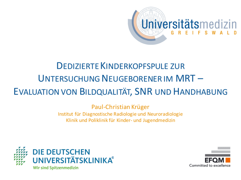 DEDIZIERTE KINDERKOPFSPULE ZUR UNTERSUCHUNG NEUGEBORENER IM MRT – EVALUATION VON BILDQUALITÄT, SNR UND HANDHABUNG Paul-­‐Christian Krüger Institut für Diagnostische Radiologie und Neuroradiologie Klinik und Poliklinik für Kinder-­‐ und Jugendmedizin Gliederung • Einleitung • Zielsetzung • Material und Methoden • Ergebnisse • Fälle • Limitationen • Schlussfolgerung • Fazit Folie 2 04.09.15 Dr. m ed. Paul-­‐Christian Krüger / Institut für Diagnostische R adiologie und Neuroradiologie Einleitung • MRT essentielles Verfahren in Diagnostik unterschiedlicher Erkrankungen des Früh-­‐ und Neugeborenen • Wichtige Fragestellungen der Schädelbildgebung: • Ischämie • Blutung • Fehlbildung • Herausforderungen: • Niedriges SNR durch • Kleines FOV • Bewegungsartefakte • Erschwerte Lagerung • Untersuchung nach Möglichkeit ohne Vollnarkose Folie 3 04.09.15 Dr. m ed. Paul-­‐Christian Krüger / Institut für Diagnostische R adiologie und Neuroradiologie Zielsetzung Evaluation einer dedizierten pädiatrischen Kopfspule mit einer speziellen Lagerungsvorrichtung zur Untersuchung Neugeborener bis 18 Monate im Vergleich zu einer etablierten Kopfspule für Erwachsene Folie 4 04.09.15 Dr. m ed. Paul-­‐Christian Krüger / Institut für Diagnostische R adiologie und Neuroradiologie Material und Methoden • 40 Kinder zw. 0-­‐18 Monate mit klinischer Indikation für eine Schädelbildgebung • 20 Kinder 1.5T MRT Siemens Kopfspule • 8-­‐Kanäle • Durchmesser 25 cm • 20 Kinder 1.5T MRT Siemens Kinderkopfspule • 16-­‐Kanäle • Durchmesser 15cm • Spezielle Lagerungsvorrichtung • Dokumentation • Lagerungszeit • Untersuchungszeit • Auffälligkeiten • Auswertung / Beurteilung • Bildqualität • Artefakte • SNR Folie 5 04.09.15 Dr. m ed. Paul-­‐Christian Krüger / Institut für Diagnostische R adiologie und Neuroradiologie Material und Methoden Wichtige Frage: Untersuchung in Narkose vs keine Narkose • Kinder unter 12 Monate Versuch ohne Narkose nach Nahrungsaufnahme • „Essnarkose“ • Kinder zw. 1 und 6 Jahren meist Narkose notwendig Sequenzen • • • • • • Folie 6 T2w ax / sag T1w ax DWI FLAIR ax Hemo ax Ggf KM T1 3 Ebenen 04.09.15 Dr. m ed. Paul-­‐Christian Krüger / Institut für Diagnostische R adiologie und Neuroradiologie Material und Methoden Folie 7 04.09.15 Dr. m ed. Paul-­‐Christian Krüger / Institut für Diagnostische R adiologie und Neuroradiologie Material und Methoden Folie 8 04.09.15 Dr. m ed. Paul-­‐Christian Krüger / Institut für Diagnostische R adiologie und Neuroradiologie Material und Methoden • Bildqualität Auswertung • 2 erfahrene Radiologen mit kinderradiologischer Weiterbildung • Beurteilung von • Bildqualität allgemein • Diagnostische Aussagefähigkeit • Artefakte • Spulenartefakte • Bewegung • Handhabung • Dokumentation von • Lagerungszeit / Lagerungsaufwand • Vorbereitung • Lagerung / Fixierung • Untersuchungszeit • „Probleme“ Folie 9 04.09.15 Dr. m ed. Paul-­‐Christian Krüger / Institut für Diagnostische R adiologie und Neuroradiologie Material und Methoden -­‐ SNR Folie 10 04.09.15 Dr. m ed. Paul-­‐Christian Krüger / Institut für Diagnostische R adiologie und Neuroradiologie Ergebnisse SNR 60,00 50,00 40,00 Kinderkopfspule 30,00 Erwachsenenspule 20,00 10,00 -­‐ 1 2 3 4 5 6 7 8 9 10 11 12 13 14 15 16 17 18 19 20 • Verbesserung der SNR um den Faktor 3,5 • Lagerungszeit sehr unterschiedlich, jedoch höherer Komfort durch Lagerung außerhalb des MRT-­‐Raumes • Gesamtuntersuchungszeit etwas kürzer • Bildqualität bei Verwendung der Kinderspule deutlich besser Folie 11 04.09.15 Dr. m ed. Paul-­‐Christian Krüger / Institut für Diagnostische R adiologie und Neuroradiologie Fall 1 -­‐ Frühgeborenes • Bei Frühgeborenen Indikation zum MRT zum Ausschluss von peri-­‐ und postpartalen Komplikationen • Blutungen • Ischämie • Hydrozephalus • Bei extremen Frühchen Darstellung der Hirnreife • Ausprägung der Gyrierung • Operkularisation der Inselregion • Fehlbildungen • Gyrierungsstörungen • Tumor Folie 12 04.09.15 Dr. m ed. Paul-­‐Christian Krüger / Institut für Diagnostische R adiologie und Neuroradiologie Fall 3 – Frische Ischämie • Beim reif geborenen Kind und bei älteren Kindern führt globale Hypoxie zu ähnlichen Veränderungen wie beim Erwachsenen • Rasch Ödem und verminderte Differenzierbarkeit der grauen und weißen Substanz • Verstrichene Sulci • Schädigung der cortikospinalen Bahnen • Oft Einblutung nach ca. 1 Woche in graue Substanz • Kortex • Stammganglien Folie 13 04.09.15 Dr. m ed. Paul-­‐Christian Krüger / Institut für Diagnostische R adiologie und Neuroradiologie Fall 4 -­‐ Schütteltrauma • Spektrum der intrakraniellen Verletzungen bei Kindesmisshandlung • SDH (in verschiedenen Stadien) • Scherverletzungen • Kortikale Kontusionsblutungen, vor allem frontotemporal • Generalisiertes Hirnödem • Hirninfarkte u.a. durch Würgen oder traumatische Dissektion • CAVE: bei mehreren Schädel-­‐Hirn-­‐Verletzungen in unterschiedlichen Stadien unbedingt an Kindesmisshandlung denken! Folie 14 04.09.15 Dr. m ed. Paul-­‐Christian Krüger / Institut für Diagnostische R adiologie und Neuroradiologie Fall 5 – konnatale CMV-­‐Infektion • Häufige konnatale Infektion • Bis zu 1% aller Geburten, nicht alle symptomatisch • Symptome • Mikrozephalie • Innenohrschwerhörigkeit • Hyperaktivität • Ataxie • Schweregrad abhängig von Infektionszeitpunkt • Schwer • Lissenzephalie, periventrikuläre Verkalkungen, Kleinhirnhypoplasie • Später • Polymikrogyrie, Glianarben, zerebrale Verkalkungen, Myelinisierungsverzögerungen Folie 15 04.09.15 Dr. m ed. Paul-­‐Christian Krüger / Institut für Diagnostische R adiologie und Neuroradiologie Fall 6 – Streptokokkenmeningitis • Entstehung • Hämatogen 