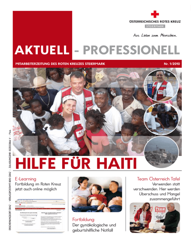 aktuell - professionell ERSCHEINUNGSORT GRAZ - VERLAGSPOSTAMT 8010 GRAZ - ZULASSUNGSNR. 02Z033866 V - P.b.b. MITARBEITERZEITUNG DES ROTEN KREUZES STEIERMARK Nr. 1/2010 HILFE FÜR HAITI E-Learning Team Österreich Tafel Fortbildung im Roten Kreuz jetzt auch online möglich AKTUELL-PROFESSIONELL Jg. 13 - Nr. 1 | 2010 Verwenden statt verschwenden. Hier werden Überschuss und Mangel zusammengeführt Fortbildung: Der gynäkologische und geburtshilfliche Notfall Seite 1 T E R M IN E S e r v ic e C e n t e r PERSONELLE VERÄNDERUNGEN Ursula Lautschan BGF Im Jänner 2010 übernahm Ursula Lautschan das Amt der Bezirksgeschäftsführerin im Rotkreuz-Bezirk Mürzzuschlag. Die 42-jährige gebürtige Wienerin zeigt sich vor allem von der Vielseitigkeit des Roten Kreuzes und der Freiwilligkeit innerhalb Österreichs größter non-profit-Organisation beeindruckt und möchte dies auch nach außen tragen: „Meine Hauptmotivation liegt darin, die Bevölkerung von unseren Leistungen zu überzeugen.“ Alois Cividino BGF Ronald Vala ZIVILDIENST Der 45-jährige selbstständige Unternehmensberater und Erlebnispädagoge übernimmt im Juni dieses Jahres die Abteilungsleitung für den Zivildienst im Landessekretariat. Die langjährige Leiterin Edith Weiss tritt mit Ende Mai in den (Un)ruhestand. Ronald Vala verbringt nach einem Schicksalsschlag seine Freizeit am liebsten mit seiner zehn Jahre alten Tochter. Er reduzierte seine Firmentätigkeit und steht dem Roten Kreuz derzeit mit 25 Wochenstunden zur Verfügung. Seit 2002 bereits als Bezirksrettungskommandant in Fürstenfeld tätig, übernahm Alois Cividino im Jänner dieses Jahres nun auch den Posten des Bezirksgeschäftsführers. Der gebürtige Hartberger kann bereits auf einen langjährigen Werdegang beim Roten Kreuz zurückblicken: Im Juli 1979 entschloss sich der 49-jährige Vater dreier Söhne, dem Roten Kreuz beizutreten. Zahlreiche Fort- und Ausbildungen schmücken seinen Weg bis heute. 21. LANDESBEWERB FÜR ERSTE-HILFE KRIEGLACH, 3.7.2010 Seite 2 AKTUELL-PROFESSIONELL Jg. 13 - Nr. 1 | 2010 E dit o r ia l In h a lt Sehr geehrte Damen und Herren, liebe Mitarbeiterinnen und Mitarbeiter! AKTUELLES 2 EDITORIAL 3 HAITI 4-5 TEAM ÖSTERREICH TAFEL Sehr geehrte Damen und Herren, liebe Mitarbeiterinnen und Mitarbeiter! „Das Leben von Menschen in Not und sozial Schwachen durch die Kraft der Menschlichkeit verbessern“ – so lautet unser Mission Statement. Es ist weltweit gültig und gibt uns den ständigen Kurs für unsere Aktivitäten vor. Die Marke Rotes Kreuz ist unbestritten, sehr gut verankert und sehr positiv besetzt. Umfragen ergeben, dass die Bevölkerung in das Rote Kreuz das größte Vertrauen hat. Mit dem erfolgreichen Kommunikationsschwerpunkt „Aus Liebe zum Menschen“ wurden auch innerhalb des Roten Kreuzes Erwartungshaltungen geweckt. Die Aktualisierung unseres Leitbildes war daher ein logischer Folgeschritt. Die Präsidentenkonferenz des Österreichischen Roten Kreuzes erteilte einer nationalen Entwicklungsgruppe, bestehend aus Vertretern aller Landesverbände, den Auftrag ein neues Leitbild zu schaffen. In zahlreichen Workshops, Umfragen und Arbeitssitzungen wurden tausende Mitarbeiterinnen und Mitarbeiter in diesen Prozess eingebunden. Das Ergebnis kann sich sehen lassen. Sie alle werden in den nächsten Wochen persönlich das neue Leitbild erhalten. Das Thema wird uns nicht nur im Jahr 2010 ständig begleiten. Unser Ziel ist es, einen gemeinsamen Weg zu beschreiten. Das Leitbild muss im Alltag zu spüren sein. Wir, das Präsidium des Landesverbandes Steiermark, werden mit gutem Beispiel vorangehen. Unser neues Leitbild erfüllt keinen Selbstzweck. Es formuliert klar und deutlich unseren Anspruch, Menschen in Not bestmöglich und mit hoher Qualität zur Seite zu stehen. Bei ehrlicher Betrachtung differenziert die Öffentlichkeit nicht nach einzelnen Bezirksstellen oder Leistungsbereichen. Für sie gibt es EIN Rotes Kreuz. Jeder von uns steht für alle. Das Handeln jedes Mitarbeiters oder jeder Mitarbeiterin steht für das gesamte Rote Kreuz. Die effizienteste Form der Öffentlichkeitsarbeit ist ein geschlossenes Auftreten – nur damit werden wir auch in der Zukunft unser Image auf dem höchsten Niveau halten können. Ihr o.Univ.Prof. DDr. Gerald Schöpfer Präsident AKTUELL-PROFESSIONELL Jg. 13 - Nr. 1 | 2010 FORTBILDUNG: DER GYNÄKOLOGISCHE UND GEBURTSHILFLICHE NOTFALL 6 7-10 BERUFSMODUL 11 ZIVILDIENST, SUCHHUNDE 12 EIN TREPPENLIFT FÜR BETTINA 13 AUS DEN BEZIRKEN AUS LIEBE ZUM MENSCHEN 14-15 16 Impressum Medieninhaber: Österreichisches Rotes Kreuz, Landesverband Steiermark, 8010 Graz, Merangasse 26, Tel.: 050 144 5-10000, E-Mail: [email protected] Redaktion: August Bäck, Valentin Krause, Petra Pöllinger (Fortbildung), Prim. Dr. Klaus Pessenbacher (Fortbildung) Mitarbeit: Manuel Bartl, Jürgen Brunner, Michaela Frenzl, Dietmar Gabrovec, Mag. Dr. Peter Hansak, OA. Dr. Martin Kaimbacher, Elke Klapf, Ursula Lautschan, Helmut Maier, Jasmin Motschnik, Erwin Schume, Dir. Simon Strassgürtl, Edith Weiss Korrektur: Mag. Gerald Schwaiger und Mag. Jörg Schwaiger Fotos: Rotes Kreuz, Christian Huemer Layout, Satz, Graphik: Valentin Krause, Jasmin Motschnik Druck: Dorrong Graz PR-Artikel sind mit PR gekennzeichnet und geben nicht unbedingt die Meinung der Redaktion wieder. Kein Nachdruck ohne Genehmigung. Erscheinungsweise: vierteljährlich Wir sind auch ONLINE unter: http://www.st.roteskreuz.at/67.html Seite 3 Steiermark aktuell ROTES KREUZ Ein Erdbeben der Stärke 7,3 nach der Richter-Skala hat am 12. Jänner 2010 auf Haiti schwerste Zerstörungen angerichtet. Beinahe die gesamte Infrastruktur des Landes wurde zerstört. Metertiefe Risse machen Straßen unpassierbar. Strommasten und Hütten fielen wie Kartenhäuser in sich zusammen. Trotz weltweiter Hilfsaktionen wird es Jahre brauchen, um den Inselstaat wieder zur Unabhängigkeit zu führen. Dietmar Gabrovec war für das Steirische Rote Kreuz sechs Wochen lang auf Haiti im Einsatz. E s ist ei