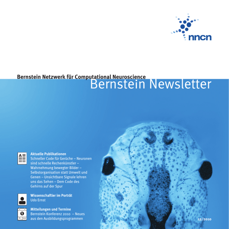 Bernstein Netzwerk für Computational Neuroscience Aktuelle Publikationen Schneller Code für Gerüche – Neuronen sind schnelle Rechenkünstler – Wahrnehmung bewegter Bilder – Selbstorganisation statt Umwelt und Genen – Unsichtbare Signale lehren uns das Sehen – Dem Code des Gehirns auf der Spur Wissenschaftler im Porträt Udo Ernst Mitteilungen und Termine Bernstein Konferenz 2010 – Neues aus den Ausbildungsprogrammen 12/2010 Aktuelle Publikationen Über die Sinne wahrnehmen ist ein schneller Prozess. Ein Blick genügt, um eine komplexe Szene visuell zu erfassen. Ohne die Fähigkeit des Ohres, Signale zeitlich enorm aufzulösen, wäre ein Verständnis von Sprache und Musik gar nicht möglich. Aber nicht nur der Hör- und Sehsinn zeichnen sich durch schnelle Reaktionen aus. Neuere Studien zeigen: Auch Gerüche können Mensch und Tier in weniger als einer Sekunde erkennen. Wissenschaftler aus der Universitätsmedizin Göttingen haben nun herausgefunden, welchen neuronalen Mechanismus das Gehirn nutzt, um sehr schnell auf Gerüche reagieren zu können. Sie konnten nachweisen: Die Information über einen Duftstoff ist schon in der zeitlichen Abfolge der jeweils ersten neuronalen Impulse einer Population von Neuronen enthalten. Die Forschungsergebnisse hat Stephan Junek im Rahmen seiner Doktorarbeit gewonnen. Die Untersuchungen dazu fanden im Labor von Detlev Schild, Direktor der Abteilung Neurophysiologie und Zelluläre Biophysik, Universitätsmedizin Göttingen, statt. Beide Wissenschaftler sind auch am Bernstein Zentrum Göttingen und am DFG-Forschungszentrum Molekularphysiologie des Gehirns (CMPB) beteiligt. Damit wir unsere Umwelt wahrnehmen können, muss jeder Sinneseindruck im Gehirn in Aktivität von Nervenzellen übersetzt werden. Die Göttinger Wissenschaftler haben untersucht, auf welche Weise die Information über Gerüche im räumlichzeitlichen Muster der entsprechenden Nervenimpulse enthalten ist. Kommt es auf die Zahl der neuronalen Impulse an, die jede Zelle aussendet? Oder auf das genaue Timing einzelner Impulse? Dazu haben sie die Vorgänge bei Kaulquappen des afrikanischen Krallenfrosches näher unter die Lupe genommen. Sie untersuchten die neuronale Aktivität des „Riechkolbens“. Dies ist die Gehirnregion, die für die Verarbeitung von Informationen Übersicht über den vorderen Hirnteil und die Nase der Larve (Kaulquappe)des afrikanischen Krallenfrosches Xenopus laevis. für den Geruchssinn zuständig ist. Dabei konzentrierten sie sich auf die „früheste“ Information, die jedes Neuron übermittelt, nämlich den Zeitpunkt des ersten neuronalen Impulses nach Gabe des Duftstoffes, die so genannte Erstspike-Latenz. Die Wissenschaftler präsentierten dem Geruchssystem eine Vielzahl von Reizen und analysierten die gemessenen Zeiten bis zum ersten „Feuern“ der Nerven (so genannte „Erstspike-Latenzen“) mithilfe zeitlich hochauflösender optischer Messungen in Dutzenden Nervenzellen gleichzeitig. Es zeigte sich, dass bestimmte Duftstoffe jeweils ein für sie charakteristisches Verzögerungsmuster hervorrufen. In einem nächsten Schritt konnten die Forscher zeigen, dass es auch möglich ist, einzig auf Grund des gemessenen Musters auf den Duftstoff zurückzuschließen. Die Wissenschaftler gehen daher davon aus, dass Verzögerungsmuster wesentlich dafür sind, um Gerüche sehr schnell erkennen zu können. „Bisher war es die herrschende Meinung unter Neurowissenschaftlern, dass andere Aspekte neuronaler Aktivität – und nicht die ‚Erstspike-Latenzen‘ – den Code im Gehirn darstellen“, sagt Prof. Detlev Schild. „Unsere Forschungsergebnisse zeigen, dass die Duftinformationen in den Latenzen der Nervenzellen im Riechkolben enthalten sind. Damit stellen sich nun eine Reihe neuer Fragen. Vor allem gilt es herauszufinden, wie nachgeschaltete Hirnregionen den Latenz-Code verstehen können.“ Junek S, Kludt E, Wolf F, Schild D. (2019): Olfactory coding with patterns of response latencies. Neuron 67, 5: 872-884. © CMPB Schneller Code für Gerüche Neuronen sind schnelle Rechenkünstler Das Gehirn verarbeitet Information in Form von elektrischen Impulsen. Jedes Neuron empfängt Impulse tausender vorgeschalteter Zellen, von denen jeder die Spannung über der Membran des Neurons um einen kleinen Betrag ändert. Erreicht die Spannung einen Schwellwert, so sendet das Neuron selbst einen Impuls aus, entlädt sich und der Vorgang beginnt von Neuem. Wissenschaftler um Stefan Rotter vom Bernstein Center Freiburg und Markus Diesmann vom RIKEN Brain Science Institute haben nun herausgefunden, welche Vorteile Nervenzellen aus ihrer impulsartigen Sprache ziehen: Die Kommunikation ist schneller als gedacht. Bereits einzelne Zellen können komplexe Operationen ausführen und sind optimal dazu geeignet, viele Signale gleichzeitig zu verarbeiten. Wie konnte dies der gängigen Theorie entgehen? Da ein Neuron in jeder Sekunde zehntausende kleiner Impulse empfängt, wurde vereinfachend angenommen, dass jeder Impuls einen so verschwindend kleinen Effekt hat wie ein Regentropfen im Ozean. Jedoch gibt es im Leben eines Neurons Situationen, in denen ein einzelner Impuls entscheidend sein kann. Zur Veranschaulichung ziehen die Wissenschaftler um Diesmann das Bild des „Shishi Odoshi“ – die japanische Wasserwippe – im Regen heran. Sobald der Wasserstand in dem Bambusrohr zu einem Übergewicht des offenen Endes führt, kippt das Shishi Odoshi und entleert sich, gleich der Spannungsentladung eines Neurons beim Aktionspotential. Hier bewirkt also ein einzelner, letzter Tropfen das sofortige Kippen und Ausleeren, entsprechend einer instantanen Antwort eines Neurons auf den letzten einkommenden Impuls. Die neue Theorie der Wissenschaftler berücksichtigt diesen „letzten Tropfen“ und löst damit die Widersprüche zwischen Simulationsergebnissen A B tilt probability Aktuelle Publikationen size of drop Bild: Susanne Kunkel Idee: Johanna Derix A: Shishi Odoshi als Analogie