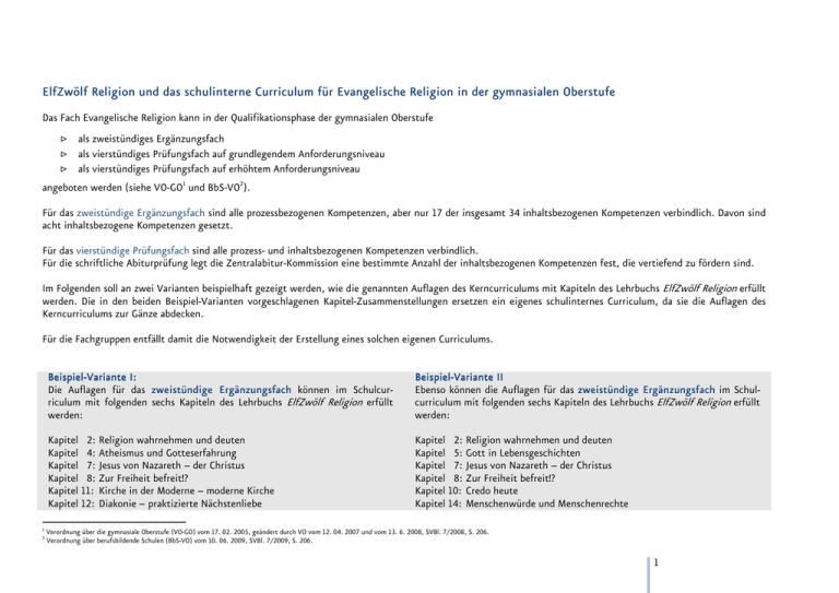 ElfZwölf Religion und das schulinterne Curriculum für Evangelische Religion in der gymnasialen Oberstufe Das Fach Evangelische Religion kann in der Qualifikationsphase der gymnasialen Oberstufe ▷ als zweistündiges Ergänzungsfach ▷ als vierstündiges Prüfungsfach auf grundlegendem Anforderungsniveau ▷ als vierstündiges Prüfungsfach auf erhöhtem Anforderungsniveau angeboten werden (siehe VO-GO1 und BbS-VO2). Für das zweistündige Ergänzungsfach sind alle prozessbezogenen Kompetenzen, aber nur 17 der insgesamt 34 inhaltsbezogenen Kompetenzen verbindlich. Davon sind acht inhaltsbezogene Kompetenzen gesetzt. Für das vierstündige Prüfungsfach sind alle prozess- und inhaltsbezogenen Kompetenzen verbindlich. Für die schriftliche Abiturprüfung legt die Zentralabitur-Kommission eine bestimmte Anzahl der inhaltsbezogenen Kompetenzen fest, die vertiefend zu fördern sind. Im Folgenden soll an zwei Varianten beispielhaft gezeigt werden, wie die genannten Auflagen des Kerncurriculums mit Kapiteln des Lehrbuchs ElfZwölf Religion erfüllt werden. Die in den beiden Beispiel-Varianten vorgeschlagenen Kapitel-Zusammenstellungen ersetzen ein eigenes schulinternes Curriculum, da sie die Auflagen des Kerncurriculums zur Gänze abdecken. Für die Fachgruppen entfällt damit die Notwendigkeit der Erstellung eines solchen eigenen Curriculums. 1 2 BeispielBeispiel -Variante I: Die Auflagen für das zweistündige Ergänzungsfach können im Schulcurriculum mit folgenden sechs Kapiteln des Lehrbuchs ElfZwölf Religion erfüllt werden: BeispielBeispiel -Variante II Ebenso können die Auflagen für das zweistündige Ergänzungsfach im Schulcurriculum mit folgenden sechs Kapiteln des Lehrbuchs ElfZwölf Religion erfüllt werden: Kapitel 2: Religion wahrnehmen und deuten Kapitel 4: Atheismus und Gotteserfahrung Kapitel 7: Jesus von Nazareth – der Christus Kapitel 8: Zur Freiheit befreit!? Kapitel 11: Kirche in der Moderne – moderne Kirche Kapitel 12: Diakonie – praktizierte Nächstenliebe Kapitel 2: Religion wahrnehmen und deuten Kapitel 5: Gott in Lebensgeschichten Kapitel 7: Jesus von Nazareth – der Christus Kapitel 8: Zur Freiheit befreit!? Kapitel 10: Credo heute Kapitel 14: Menschenwürde und Menschenrechte Verordnung über die gymnasiale Oberstufe (VO-GO) vom 17. 02. 2005, geändert durch VO vom 12. 04. 2007 und vom 13. 6. 2008, SVBl. 7/2008, S. 206. Verordnung über berufsbildende Schulen (BbS-VO) vom 10. 06. 2009, SVBl. 7/2009, S. 206. 1 Die Auflagen für das vierstündige Prüfungsfach können im Schulcurriculum erfüllt werden, wenn zusätzlich zu den genannten Kapiteln für das zweistündige Ergänzungsfach folgende vier Kapitel des Lehrbuchs ElfZwölf Religion unterrichtet werden: Die Auflagen für das vierstündige Prüfungsfach können im Schulcurriculum erfüllt werden, wenn zusätzlich zu den genannten Kapiteln für das zweistündige Ergänzungsfach folgende drei Kapitel des Lehrbuchs ElfZwölf Religion unterrichtet werden: Kapitel 5: Gott in Lebensgeschichten Kapitel 13: Ethisch handeln – Sterbehilfe? Kapitel 15: Sehnsucht nach dem Paradies Kapitel 16: Rätsel Mensch. Kapitel 11: Kirche in der Moderne – moderne Kirche Kapitel 13: Ethisch handeln: Sterbehilfe? Kapitel 15: Sehnsucht nach dem Paradies Für die vertiefende Bearbeitung der einzelnen Themen im vierstündigen Prüfungsfach können zusätzlich die auf der CD ElfZwölf Religion Basistexte befindlichen Materialien verwendet werden. Einen genauen Überblick darüber, wie das Lehrwerk ElfZwölf Religion den Vorgaben des niedersächsischen Kerncurriculums entspricht, bietet die folgende Synopse Zugleich stellt diese Synopse ein wertvolles Arbeitsinstrument für Fachgruppen und Lehrkräfte (bei ihrer Kursplanung) dar. 2 SYNOPSE ElfZwölf Religion und das neue niedersächsische Kerncurriculum Niedersachsen für Evangelische Religion für das Gymnasium Gymnasium – gymnasiale Oberstufe, die Gesamtschule – gymnasiale Oberstufe, Oberstufe, das Berufliche Gymnasium, das Abendgymnasium, das Kolleg Prozessbezogene Kompetenzbereiche und prozessbezo prozessbezogene Kompetenzen Inhaltsbezogene Kompetenzbereiche und inhaltsbezogene Kompetenzen Kompetenzen WahrnehmungsWahrnehmungs- und Darstellungskompetenz – Kompetenzbereich Mensch religiös bedeutsame Phänomene wahrnehmen Der Mensch als Geschöpf und Ebenbild und be beschreiben ▷ Situationen erfassen, in denen letzte Fragen nach Grund, Sinn, Ziel und Verantwortung des Lebens aufbrechen besonders gefördert in Kap. 2, 4, 5, 9, 13, 16 ▷ religiöse Spuren und Dimensionen in der Lebenswelt aufdecken besonders gefördert in Kap. 1, 2, 5, 9, 10, 11, 13, 14, 15 ▷ grundlegende religiöse Ausdrucksformen (Symbole, Riten, Mythen, Räume, Zeiten) wahrnehmen und in verschiedenen Kontexten wiedererkennen und einordnen besonders gefördert in Kap. 3, 9, 12, 13, 14, 16 Basistexte Gottes – Wer bin ich? AT Pentateuch Die Schülerinnen und Schüler … Gen 1-3 (Schöpfung und Sündenfall) Kap. 3, 8, 15 – erläutern die biblische Auszeichnung des Menschen als Geschöpf und Ebenbild Gottes Gen 1,27f. (Ebenbildlichkeit und Schöpfungsauftrag) Kap. berücksichtigt in Kap. 3, 8, 14, 16 – vergleichen das biblische Menschenbild mit anderen anthropologischen Entwürfen berücksichtigt in Kap. 3, 8, 14, 15, 16 13, 14) Ex 3,1-15 (Moses Berufung) Kap. 2, 4 Ex 20, 2-4 (Präambel, Fremdgötter- und Bilderverbot) Kap. 1, 2, 5 Ex 20,1-17 (Die zehn Gebote) Kap. 13 Der Mensch als Sünder und GerechtfertigGerechtfertigter – Gnade vor Recht? besonders gefördert in Kap. 1, 2, 3, 9, 10, 11, 15 Die Schülerinnen und Schüler … ▷ ethische Herausforderungen in der individuellen Lebensgeschichte sowie in unterschiedlichen gesellschaftlichen Handlungsfeldern wie Kultur, Wissenschaft, Politik und Wirtschaft als religiös bedeutsame Entscheidungssituationen erkennen Biblische Basistexte und verbindliche Grundbegriffe – setzen sich mit den Begriffen „Sünde“ und „Vergebung“ auseinander be