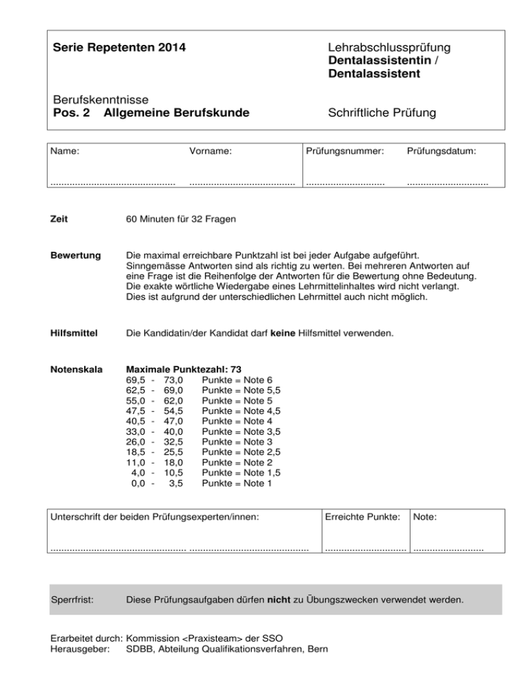 Lehrabschlussprüfung Dentalassistentin / Dentalassistent Serie Repetenten 2014 Berufskenntnisse Pos. 2 Allgemeine Berufskunde Schriftliche Prüfung Name: Vorname: Prüfungsnummer: Prüfungsdatum: .............................................. ....................................... ............................. .............................. Zeit 60 Minuten für 32 Fragen Bewertung Die maximal erreichbare Punktzahl ist bei jeder Aufgabe aufgeführt. Sinngemässe Antworten sind als richtig zu werten. Bei mehreren Antworten auf eine Frage ist die Reihenfolge der Antworten für die Bewertung ohne Bedeutung. Die exakte wörtliche Wiedergabe eines Lehrmittelinhaltes wird nicht verlangt. Dies ist aufgrund der unterschiedlichen Lehrmittel auch nicht möglich. Hilfsmittel Die Kandidatin/der Kandidat darf keine Hilfsmittel verwenden. Notenskala Maximale Punktezahl: 73 69,5 - 73,0 Punkte = Note 6 62,5 - 69,0 Punkte = Note 5,5 55,0 - 62,0 Punkte = Note 5 47,5 - 54,5 Punkte = Note 4,5 40,5 - 47,0 Punkte = Note 4 33,0 - 40,0 Punkte = Note 3,5 26,0 - 32,5 Punkte = Note 3 18,5 - 25,5 Punkte = Note 2,5 11,0 - 18,0 Punkte = Note 2 4,0 - 10,5 Punkte = Note 1,5 0,0 - 3,5 Punkte = Note 1 Unterschrift der beiden Prüfungsexperten/innen: Erreichte Punkte: .................................................. ............................................ .............................. .......................... Sperrfrist: Note: Diese Prüfungsaufgaben dürfen nicht zu Übungszwecken verwendet werden. Erarbeitet durch: Kommission <Praxisteam> der SSO Herausgeber: SDBB, Abteilung Qualifikationsverfahren, Bern Anzahl Punkte maximal erreicht Allgemeine Berufskunde Aufgabe 1 „Behandlungsablauf“ Eine systematische Behandlung erfordert eine sorgfältige Vorbereitung. Der Behandlungsablauf gliedert sich in verschiedene Abschnitte. Ergänzen Sie die nachstehende Tabelle 1 Krankenvorgeschichte 1 Befunderhebung 1 Erkennung und Benennung einer Krankheit 1 Therapie Aufgabe 2 „Schweigepflicht“ Kreuzen Sie an, ob folgende Aussagen richtig oder falsch sind. 2 richtig a) Bei Verletzung der Schweigepflicht wird der Lohn automatisch gekürzt. b) Bei Verletzung der Schweigepflicht kann das Arbeitsverhältnis aufgelöst werden. c) Die Schweigepflicht erlischt automatisch nach dem Tod des Patienten. d) Eine Verletzung der Schweigepflicht kann zur gerichtlichen Bestrafung führen. falsch Aufgabe 3 Welche Organisationen verbergen sich hinter den folgenden Abkürzungen? a) SSO: ____________________________________________________________ 0.5 b) BBT: ____________________________________________________________ 0.5 c) SUVA: ___________________________________________________________ 0.5 d) SRK: ____________________________________________________________ 0.5 Übertrag Allgemeine Betriebskunde, Kandidaten, LAP Repetenten 2014 8 Seite 2 Anzahl Punkte maximal erreicht Hygiene Übertrag Aufgabe 4 8 „Händedesinfektion“ Die Hände sind die grössten Keimüberträger in einer Praxis. a) Zu welchem Zeitpunkt wird die hygienische Händedesinfektion durchgeführt, wenn Sie zur Assistenz gerufen werden? _________________________________________________________________ b) Was bewirkt diese Desinfektion? _________________________________________________________________ c) 0.5 0.5 Wie lange dauert die Händedesinfektion? _________________________________________________________________ 0.5 d) Nennen Sie die drei Problemzonen bei der Händedesinfektion. - _________________________________________________________________ 0.5 - _________________________________________________________________ 0.5 - _________________________________________________________________ 0.5 Aufgabe 5 „aktive Hygienemassnahmen“ Wie nennt man die Massnahme, die alle Krankheitserreger unschädlich macht? ____________________________________________________________________ Übertrag Allgemeine Betriebskunde, Kandidaten, LAP Repetenten 2014 1 12 Seite 3 Anzahl Punkte maximal Übertrag erreicht 12 Aufgabe 6 Kreuzen Sie an, welche Aussagekombination richtig ist. a) Der Chemiklav wird mit H2O betrieben. b) Die Einwirkungszeit des Oberflächendesinfektionsmittels beträgt 2 bis 5 Minuten. c) Die Instrumentendesinfektion dient nur zum Schutz des Patienten. d) Zellstoff, Watte, Tücher und Tupfer können im Autoklaven sterilisiert werden. e) Der Autoklav sterilisiert nur mit erhitzter Luft. Richtig sind: a+c b+d a+b+e c+d 2 Aufgabe 7 „Infektionsarten“ Kreuzen Sie bei den folgenden Aussagen an, ob es sich um eine Tröpfchen-, perkutane-, oder eine Kontaktinfektion handelt. Aussage Tröpfcheninfektion Perkutane Infektion Kontaktinfektion Welche Infektion kann ein Sprühnebel auslösen? 0.5 Um welche Infektion handel es sich, wenn man sich mit einem Scaler sticht? 0.5 Gegen welche Art von Infektionen schützt man sich, wenn Türgriffe regelmässig desinfiziert werden? 0.5 Gegen welche Art von Infektionen schützt man sich mit einem Mundschutz? 0.5 Aufgabe 8 „Desinfektionsmittel“ Welche mikrobiologischen Anforderungen stellen wir an ein Desinfektionsmittel? Nennen Sie zwei Anforderungen. 1) _________________________________________________________________ 1 2) _________________________________________________________________ 1 Übertrag Allgemeine Betriebskunde, Kandidaten, LAP Repetenten 2014 18 Seite 4 Anzahl Punkte maximal erreicht Apparatekunde Übertrag 18 Aufgabe 9 Kreuzen Sie an, ob folgende Aussagen richtig oder falsch sind: 2 richtig a) Der Amalgamabscheider ist nicht gesetzlich vorgeschrieben. b) Der Amalgamabscheider entfernt nicht alle metallischen Bestandteile. c) Der Rotor-Behälter muss periodisch gewechselt werden. falsch d) Der Rotor-Behälter kann über dem Lavabo ausgespült werden. Aufgabe 10 „Kompressor“ Nennen Sie zwei Geräte im Behandlungszimmer, die für ihre Funktion einen Kompressor benötigen. 1) _________________________________________________________________ 1 2) _________________________________________________________________ 1 Aufg
