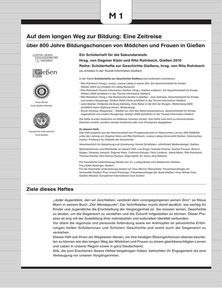 M1 Auf dem langen Weg zur Bildung: Eine Zeitreise über 800 Jahre Bildungschancen von Mädchen und Frauen in Gießen Ein Schülerheft für die Sekundarstufe Hrsg. von Dagmar Klein und Rita Rohrbach, Gießen 2010 Reihe: Schülerhefte zur Geschichte Gießens, hrsg. von Rita Rohrbach (zu erhalten in der Tourist-Information Gießen) In der Reihe Schülerhefte zur Geschichte Gießens sind außerdem erschienen: • Rita Rohrbach (Hrsg.): Justus. Justus Liebig in seiner Zeit. Ein Geschichtsheft für Kinder, Gießen 2003 (zu erhalten im Liebig-Museum) • Rita Rohrbach/Tourist-Information Gießen (Hrsg.): Gießen-entdeckt. Ein Geschichtsheft für Kinder, Gießen 2006 (erhältlich in der Tourist-Information Gießen) • Rita Rohrbach (Hrsg.): Der Botanische Garten in Gießen – eine Zeitreise. Geschichtsheft für Kinder und andere Neugierige, Gießen 2008 (Hefte erhältlich in der Tourist-Information Gießen) • Julia Steiner: Entdecke die Burg Gleiberg. Eine Reise in die Zeit der Burgen, Wettenberg 2009 (erhältlich beim Gleiberg-Verein, Wettenberg) • Sarah Hartwig: Wegweiser – Gießen zur Zeit des Nationalsozialismus. Geschichtsheft für Kinder, Jugendliche und andere Neugierige, Gießen 2009 (erhältlich in der Tourist-Information Gießen) Inner Wheel Club Gießen-Wetzlar Die Hefte wurden kostenlos an Gießener Schulen verteilt. Alle Hefte sind nicht zu kommerziellen Zwecken erstellt, sondern werden kostenlos oder zum Druckpreis abgegeben. Soroptimist International Club Gießen Zu diesem Heft: Das Heft entstand aus der Seminararbeit zum Projektunterricht im Historischen Lernen (WS 2008/09) unter der Leitung von Dagmar Klein und Rita Rohrbach, Justus-Liebig-Universität Gießen, Historisches Institut, Professur für Didaktik der Geschichte. Verantwortlich für Gestaltung und Umsetzung: Harald Schätzlein, ultraViolett Mediendesign, Gießen. Mitarbeiterinnen und Mitarbeiter an diesem Heft: Lea Engel, Isabelle Fischer, Nadine Fouqué, Bianca Geiger, Vanessa Jarosch, Dagmar Klein, Cathrina Kreuzer, Felix Lordieck, Jakob Mohn, Rita Rohrbach, Thomas Rockel, Kim-Denise Ruckes, Katja Späth, Dr. Hans-Jörg Wilhelm. Für freundliche Unterstützung danken wir: Dr. Ludwig Brake vom Stadtarchiv Gießen; Frau Edith Satzinger, Gießen. Für die finanzielle Unterstützung danken wir Frau Marion Oberschelp, Frauenbeauftragte der Universität Gießen; Frau Ursula Passarge, Frauenbeauftragte der Stadt Gießen; Inner Wheel Club Gießen-Wetzlar; Soroptimist International Club Gießen Ziele dieses Heftes „Jeder Augenblick, den wir durchleben, verdankt dem vorangegangenen seinen Sinn“, so Klaus Mann in seinem Buch „Der Wendepunkt“. Der Schriftsteller macht damit deutlich, wie wichtig für Kinder und Jugendliche die Erschließung der Vergangenheit ist. Sie müssen lernen, Geschichte zu deuten, um die Gegenwart zu verstehen und die Zukunft mitgestalten zu können. Dieser Prozess ist eng mit der Ausbildung ihrer individuellen und kulturellen Identität verbunden. Vor allem die regionale und personale Anbindung sowie ein Anknüpfen an persönliche Erfahrungen helfen Schülerinnen und Schülern Geschichte und somit auch die Gegenwart zu verstehen. Dieses Heft soll ihnen als Wegweiser dienen, um ihre heutigen Bildungschancen ebenso beurteilen zu können wie den langen Weg der Mädchen und Frauen zu einem gleichberechtigten Lernen und Leben in unserer Region sowie in ganz Deutschland. Alle, die zum Erscheinen dieses Heftes beigetragen haben, betrachten ihr Engagement als eine Verbeugung vor unseren Vorgängerinnen. M2 Inhaltsverzeichnis Impressum – Vorwort . ......................................................................................................... M 1 Inhaltsverzeichnis ................................................................................................................ M 2 1. Von Bildung unter kirchlicher Leitung Die Nonnen von Kloster Cella am Schiffenberg . ......................................................... M 3, 4, 5 Mädchenbildung nach der Reformation ............................................................................ M 6, 7 2. Erste Frauenberufe und Suche nach Bildung Hebamme – ein Frauenberuf ........................................................................................... M 8, 9 Charlotte von Siebold – Doktorin der Hebammenkunst . .................................................. M 10 Beruf: Dienstmädchen ........................................................................................................ M 11 Lesende und schreibende Frauen: eine Stationenarbeit . ............................. M 12, 13, 14, 15 Henriette Fürth – Sozialpolitikerin und Publizistin ............................................................. M 16 Tabakarbeiterinnen in Hessen verändern Wirtschaft und Bildung . ............................. M 17, 18 3. Ausbildung in und für Kindergarten und Schule Etappen der Mädchenbildung in Gießen: Von der Höheren Mädchenschule zur Ricarda-Huch-Schule ........................................................................................................ M 19 Berufsperspektive Hausfrau? – Die Alice-Schule ............................................................. M 20 Das Alphabet der Nadelkünste . ....................................................................................... M 21 Zu dumm zum Denken? .............................................................................................. M 22, 23 Warum der Kindergarten „Kindergarten“ heißt: Hedwig Burgheim – Ausbilderin am Fröbel-Seminar ......................................................................................... M 24 Maria Birnbaum – Von der Gouvernante zur Lehrerin . ..................................................... M 25 Dr. Lucie Jacobi – Mit Studium zur Direktorin ................................................................... M 26 Der besondere Weg der Martha Mendel .........................................