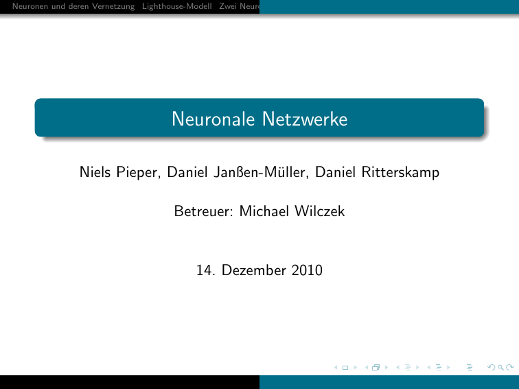 Neuronen und deren Vernetzung Lighthouse-Modell Zwei Neuronen Viele Neuronen Ausblick Literatur Neuronale Netzwerke Niels Pieper, Daniel Janßen-Müller, Daniel Ritterskamp Betreuer: Michael Wilczek 14. Dezember 2010 Neuronen und deren Vernetzung Lighthouse-Modell Zwei Neuronen Viele Neuronen Ausblick Literatur 1 Neuronen und deren Vernetzung 2 Lighthouse-Modell 3 Zwei Neuronen 4 Viele Neuronen 5 Ausblick 6 Literatur Neuronen und deren Vernetzung Lighthouse-Modell Zwei Neuronen Viele Neuronen Ausblick Literatur Neuronen und deren Vernetzung Abbildung: linkes Bild: shp.by.ru ; rechtes Bild: www.nida.nih.gov Menschliches Gehirn = neuronales Netzwerk Aufbau von Neuronen: Soma, Axon, Dendriten Axonhügel: Signalgenerierung Vernetzung von Neuronen durch Synapsen Neuronen und deren Vernetzung Lighthouse-Modell Zwei Neuronen Viele Neuronen Ausblick Literatur Signalerzeugung und -übertragung Abbildung: Quelle: www.biokurs.de Axonhügel: Potentialdifferenz Soma: Weiterleitung von Informationen Öffnung von Ionenkanälen bei Depolarisation Plötzliche Ladungsumkehr bei Schwellenüberschreitung Neuronen und deren Vernetzung Lighthouse-Modell Zwei Neuronen Viele Neuronen Ausblick Literatur Neuronen und deren Vernetzung Abbildung: Quelle: shp.by.ru Synapsen koppeln an Dendriten Meistens Informationsübertragung per Neurotransmitter Rezeptoren: chemisches Signal ⇒ elektrisches Signal Neuronen und deren Vernetzung Lighthouse-Modell Zwei Neuronen Viele Neuronen Ausblick Literatur Dendritischer Strom Abbildung: Signalweg im Neuron; [1] ψ̇m (t) = af (φk (t)) − γψm (t) (1) Neuronen und deren Vernetzung Lighthouse-Modell Zwei Neuronen Viele Neuronen Ausblick Literatur Verwendung der Phase φ Abbildung: Leuchtturm Quelle: shutterstock.com Spikes immer wenn φ(t) = 2πn X f (φ(t)) = δ(φ(t) − 2πn)φ̇(tn ) n (2) Neuronen und deren Vernetzung Lighthouse-Modell Zwei Neuronen Viele Neuronen Ausblick Literatur Naka-Rushton-Relation Zusammenhang von Spike-Rate S und Input X Anlehnung an experimentelle Daten φ̇k = S(X) = r XN ΘN + X N Abbildung: Plot Naka-Rushton; [1] (3) Neuronen und deren Vernetzung Lighthouse-Modell Zwei Neuronen Viele Neuronen Ausblick Literatur Kopplung von 2 Neuronen Abbildung: Kopplungsschema für 2 Neuronen; [1] Neuronen und deren Vernetzung Lighthouse-Modell Zwei Neuronen Viele Neuronen Ausblick Literatur Kopplung von 2 Neuronen Basisgleichungen: Neuron 1 ψ̇1 (t) = af (φ2 (t)) − γψ1 (4) φ̇1 (t) = S (cψ1 (t) + pext,1 ) (5) ψ̇2 (t) = af (φ1 (t)) − γψ2 (6) φ̇2 (t) = S (cψ2 (t) + pext,2 ) (7) Neuron 2 Neuronen und deren Vernetzung Lighthouse-Modell Zwei Neuronen Viele Neuronen Ausblick Literatur Synchronisation Ströme der Neuronen synchronisieren Bildung eines Phase-locked-state Video: Bildung eines Phase-locked-state Neuronen und deren Vernetzung Lighthouse-Modell Zwei Neuronen Viele Neuronen Ausblick Literatur Viele Neuronen Neuronen können prinzipiell an alle anderen Neuronen koppeln - Koeffizienten a und c werden Matrizen. - Führt Summe über Ströme und Axonalen Pulse ein Neuronen und deren Vernetzung Lighthouse-Modell Zwei Neuronen Viele Neuronen Ausblick Literatur Viele Neuronen Neuronen können prinzipiell an alle anderen Neuronen koppeln - Koeffizienten a und c werden Matrizen. - Führt Summe über Ströme und Axonalen Pulse ein Dendritischer Strom Ψ̇m (t) = X amk fk (Φ(t)) − γΨm (t) (8) k Phase ! Φ̇m (t) = S X k cmk Ψk (t) + pext,k (t), Θ (9) Neuronen und deren Vernetzung Lighthouse-Modell Zwei Neuronen Viele Neuronen Ausblick Literatur Strukturbildung System knapp unter Überdämpfung Zufällige Startbedingung des Stroms und der Phase Nächste Nachbar Wechselwirkung Video: Strukturbildung bei Neuronalen Netzwerken Neuronen und deren Vernetzung Lighthouse-Modell Zwei Neuronen Viele Neuronen Ausblick Literatur Ausblick Stationäre oder wandernde bump-Lösungen Neuronen und deren Vernetzung Lighthouse-Modell Zwei Neuronen Viele Neuronen Ausblick Literatur Ausblick Stationäre oder wandernde bump-Lösungen Adaptive Kopplung Neuronen und deren Vernetzung Lighthouse-Modell Zwei Neuronen Viele Neuronen Ausblick Literatur Ausblick Stationäre oder wandernde bump-Lösungen Adaptive Kopplung Abbildung: MRI-Aufnahme des Gehirns einer 10 Tage (links) bzw. 3 Monate (rechts) alten Katze. [2] Neuronen und deren Vernetzung Lighthouse-Modell Zwei Neuronen Viele Neuronen Ausblick Literatur Ausblick Assoziatives Gedächtnis Neuronen und deren Vernetzung Lighthouse-Modell Zwei Neuronen Viele Neuronen Ausblick Literatur Ausblick Assoziatives Gedächtnis Neuronen und deren Vernetzung Lighthouse-Modell Zwei Neuronen Viele Neuronen Ausblick Literatur [1] : Hermann. Haken: Brain Dynamics, Springer-Verlag Berlin-Heidelberg 2002 [2] : Spektrum der Wissenschaft, Dezember 2010