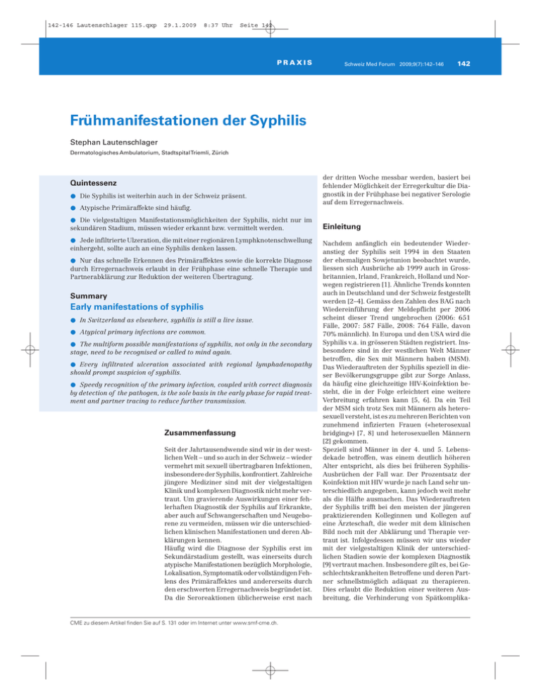 142-146 Lautenschlager 115.qxp 29.1.2009 8:37 Uhr Seite 142 PRAXIS Schweiz Med Forum 2009;9(7):142–146 142 Frühmanifestationen der Syphilis Stephan Lautenschlager Dermatologisches Ambulatorium, Stadtspital Triemli, Zürich Quintessenz 쎲 Die Syphilis ist weiterhin auch in der Schweiz präsent. 쎲 Atypische Primäraffekte sind häufig. 쎲 Die vielgestaltigen Manifestationsmöglichkeiten der Syphilis, nicht nur im sekundären Stadium, müssen wieder erkannt bzw. vermittelt werden. 쎲 Jede infiltrierte Ulzeration, die mit einer regionären Lymphknotenschwellung einhergeht, sollte auch an eine Syphilis denken lassen. 쎲 Nur das schnelle Erkennen des Primäraffektes sowie die korrekte Diagnose durch Erregernachweis erlaubt in der Frühphase eine schnelle Therapie und Partnerabklärung zur Reduktion der weiteren Übertragung. Summary Early manifestations of syphilis 쎲 In Switzerland as elsewhere, syphilis is still a live issue. 쎲 Atypical primary infections are common. 쎲 The multiform possible manifestations of syphilis, not only in the secondary stage, need to be recognised or called to mind again. 쎲 Every infiltrated ulceration associated with regional lymphadenopathy should prompt suspicion of syphilis. 쎲 Speedy recognition of the primary infection, coupled with correct diagnosis by detection of the pathogen, is the sole basis in the early phase for rapid treatment and partner tracing to reduce further transmission. Zusammenfassung Seit der Jahrtausendwende sind wir in der westlichen Welt – und so auch in der Schweiz – wieder vermehrt mit sexuell übertragbaren Infektionen, insbesondere der Syphilis, konfrontiert. Zahlreiche jüngere Mediziner sind mit der vielgestaltigen Klinik und komplexen Diagnostik nicht mehr vertraut. Um gravierende Auswirkungen einer fehlerhaften Diagnostik der Syphilis auf Erkrankte, aber auch auf Schwangerschaften und Neugeborene zu vermeiden, müssen wir die unterschiedlichen klinischen Manifestationen und deren Abklärungen kennen. Häufig wird die Diagnose der Syphilis erst im Sekundärstadium gestellt, was einerseits durch atypische Manifestationen bezüglich Morphologie, Lokalisation, Symptomatik oder vollständigen Fehlens des Primäraffektes und andererseits durch den erschwerten Erregernachweis begründet ist. Da die Seroreaktionen üblicherweise erst nach CME zu diesem Artikel finden Sie auf S. 131 oder im Internet unter www.smf-cme.ch. der dritten Woche messbar werden, basiert bei fehlender Möglichkeit der Erregerkultur die Diagnostik in der Frühphase bei negativer Serologie auf dem Erregernachweis. Einleitung Nachdem anfänglich ein bedeutender Wiederanstieg der Syphilis seit 1994 in den Staaten der ehemaligen Sowjetunion beobachtet wurde, liessen sich Ausbrüche ab 1999 auch in Grossbritannien, Irland, Frankreich, Holland und Norwegen registrieren [1]. Ähnliche Trends konnten auch in Deutschland und der Schweiz festgestellt werden [2–4]. Gemäss den Zahlen des BAG nach Wiedereinführung der Meldepflicht per 2006 scheint dieser Trend ungebrochen (2006: 651 Fälle, 2007: 587 Fälle, 2008: 764 Fälle, davon 70% männlich). In Europa und den USA wird die Syphilis v.a. in grösseren Städten registriert. Insbesondere sind in der westlichen Welt Männer betroffen, die Sex mit Männern haben (MSM). Das Wiederauftreten der Syphilis speziell in dieser Bevölkerungsgruppe gibt zur Sorge Anlass, da häufig eine gleichzeitige HIV-Koinfektion besteht, die in der Folge erleichtert eine weitere Verbreitung erfahren kann [5, 6]. Da ein Teil der MSM sich trotz Sex mit Männern als heterosexuell versteht, ist es zu mehreren Berichten von zunehmend infizierten Frauen («heterosexual bridging») [7, 8] und heterosexuellen Männern [2] gekommen. Speziell sind Männer in der 4. und 5. Lebensdekade betroffen, was einem deutlich höheren Alter entspricht, als dies bei früheren SyphilisAusbrüchen der Fall war. Der Prozentsatz der Koinfektion mit HIV wurde je nach Land sehr unterschiedlich angegeben, kann jedoch weit mehr als die Hälfte ausmachen. Das Wiederauftreten der Syphilis trifft bei den meisten der jüngeren praktizierenden Kolleginnen und Kollegen auf eine Ärzteschaft, die weder mit dem klinischen Bild noch mit der Abklärung und Therapie vertraut ist. Infolgedessen müssen wir uns wieder mit der vielgestaltigen Klinik der unterschiedlichen Stadien sowie der komplexen Diagnostik [9] vertraut machen. Insbesondere gilt es, bei Geschlechtskrankheiten Betroffene und deren Partner schnellstmöglich adäquat zu therapieren. Dies erlaubt die Reduktion einer weiteren Ausbreitung, die Verhinderung von Spätkomplika- 142-146 Lautenschlager 115.qxp 29.1.2009 8:37 Uhr Seite 143 PRAXIS tionen sowie Übertragung auf das Neugeborene und kann zusätzlich ein möglicher Schlüsselfaktor zur Reduktion neuer sexuell übertragener HIV-Infektionen darstellen. Voraussetzung für eine schnelle Diagnose der Krankheit ist jedoch das Erkennen der unterschiedlichen Frühmani- Abbildung 1 Beginnende Ulzeration einer Papel in der Frühphase einer Syphilis I. Abbildung 2 Primäraffekt im Sulcus coronarius. Schweiz Med Forum 2009;9(7):142–146 143 festationen und deren Differentialdiagnosen. Bei der Syphilis besteht der Schlüssel zur Diagnose in der genauen Untersuchung des gesamten Integuments und dessen Anhangsgebilde, der anogenitalen Region, der Mundschleimhaut und der Lymphknotenstationen unter Berücksichtigung eventueller allgemeiner, neurologischer, ophthalmologischer oder otologischer Symptome [10]. Speziell müssen auch die allfälligen Besonderheiten bei gleichzeitig bestehender HIV-Koinfektion berücksichtigt werden. Frühsyphilis Als Frühsyphilis werden die primäre und sekundäre Syphilis sowie die frühlatente Syphilis bei einer Latenzzeit von <1 Jahr (Definition der Centers for Disease Control [CDC], Atlanta) bzw. von <2 Jahren (Definition der WHO) nach der Infektion bezeichnet. Da nicht nur die sekundäre Syphilis mit einem sprichwörtlich vielgestal