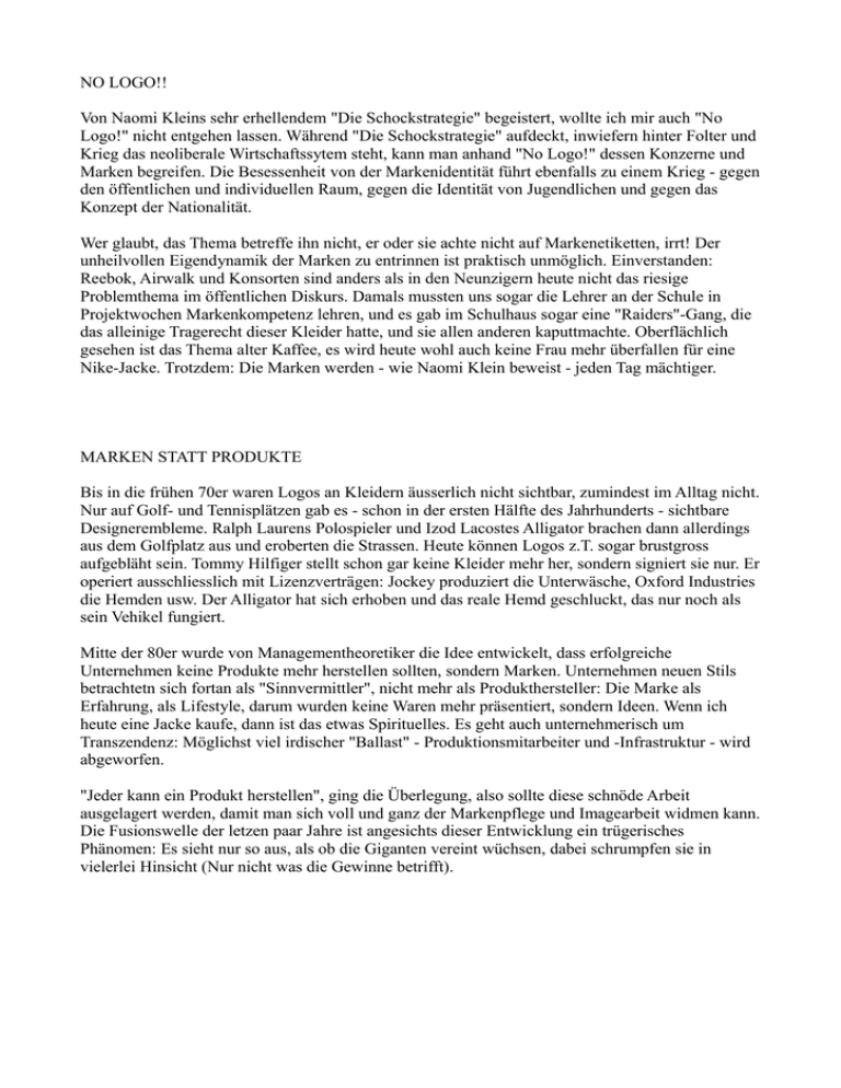 NO LOGO!! Von Naomi Kleins sehr erhellendem "Die Schockstrategie" begeistert, wollte ich mir auch "No Logo!" nicht entgehen lassen. Während "Die Schockstrategie" aufdeckt, inwiefern hinter Folter und Krieg das neoliberale Wirtschaftssytem steht, kann man anhand "No Logo!" dessen Konzerne und Marken begreifen. Die Besessenheit von der Markenidentität führt ebenfalls zu einem Krieg - gegen den öffentlichen und individuellen Raum, gegen die Identität von Jugendlichen und gegen das Konzept der Nationalität. Wer glaubt, das Thema betreffe ihn nicht, er oder sie achte nicht auf Markenetiketten, irrt! Der unheilvollen Eigendynamik der Marken zu entrinnen ist praktisch unmöglich. Einverstanden: Reebok, Airwalk und Konsorten sind anders als in den Neunzigern heute nicht das riesige Problemthema im öffentlichen Diskurs. Damals mussten uns sogar die Lehrer an der Schule in Projektwochen Markenkompetenz lehren, und es gab im Schulhaus sogar eine "Raiders"-Gang, die das alleinige Tragerecht dieser Kleider hatte, und sie allen anderen kaputtmachte. Oberflächlich gesehen ist das Thema alter Kaffee, es wird heute wohl auch keine Frau mehr überfallen für eine Nike-Jacke. Trotzdem: Die Marken werden - wie Naomi Klein beweist - jeden Tag mächtiger. MARKEN STATT PRODUKTE Bis in die frühen 70er waren Logos an Kleidern äusserlich nicht sichtbar, zumindest im Alltag nicht. Nur auf Golf- und Tennisplätzen gab es - schon in der ersten Hälfte des Jahrhunderts - sichtbare Designerembleme. Ralph Laurens Polospieler und Izod Lacostes Alligator brachen dann allerdings aus dem Golfplatz aus und eroberten die Strassen. Heute können Logos z.T. sogar brustgross aufgebläht sein. Tommy Hilfiger stellt schon gar keine Kleider mehr her, sondern signiert sie nur. Er operiert ausschliesslich mit Lizenzverträgen: Jockey produziert die Unterwäsche, Oxford Industries die Hemden usw. Der Alligator hat sich erhoben und das reale Hemd geschluckt, das nur noch als sein Vehikel fungiert. Mitte der 80er wurde von Managementheoretiker die Idee entwickelt, dass erfolgreiche Unternehmen keine Produkte mehr herstellen sollten, sondern Marken. Unternehmen neuen Stils betrachtetn sich fortan als "Sinnvermittler", nicht mehr als Produkthersteller: Die Marke als Erfahrung, als Lifestyle, darum wurden keine Waren mehr präsentiert, sondern Ideen. Wenn ich heute eine Jacke kaufe, dann ist das etwas Spirituelles. Es geht auch unternehmerisch um Transzendenz: Möglichst viel irdischer "Ballast" - Produktionsmitarbeiter und -Infrastruktur - wird abgeworfen. "Jeder kann ein Produkt herstellen", ging die Überlegung, also sollte diese schnöde Arbeit ausgelagert werden, damit man sich voll und ganz der Markenpflege und Imagearbeit widmen kann. Die Fusionswelle der letzen paar Jahre ist angesichts dieser Entwicklung ein trügerisches Phänomen: Es sieht nur so aus, als ob die Giganten vereint wüchsen, dabei schrumpfen sie in vielerlei Hinsicht (Nur nicht was die Gewinne betrifft). GEBURT DER MARKEN IM 19. JH. In den ersten Marketingkampagnen (für die damals noch neuen Autos, Telefone und Glühlampen) ab der Hälfte des 19. Jahrhunderts ging es wirklich noch um die Produkte an sich. Namen und Images waren unwichtig, die neuen Produkte selbst waren Werbung genug. Der Wettbewerb durch Markenartikel wurde aber später eine Notwendigkeit, weil der Markt mit einheitlichen Massenprodukten überschwemmt wurde. Aufgrund der fabribmässigen Gleichheit musste eine auf dem Image beruhende Verschiedenheit erfunden werden. Als erstes bekamen lustigerweise gerade die unspezifischen Güter wie Zucker, Mehl, Seife usw. Eigennamen verpasst. Denn sie waren früher vom Krämer aus einem Fass geschöpft worden, und man musste die unheimliche Anonymität der nun fertig abgepackten Güter neutralisieren. Sympathische Werbefiguren wie "Aunt Jemina" oder "Dr. Brown" ersetzen den Gemischtwarenhändler von früher, sie wurden die Schnittstelle zwischen Produkt und Konsument. Einige Werbefachleute begriffen schon damals, dass Werbung nicht nur sachlich ist, sondern auch mit Emotionen spielen kann. Marken können ein Gefühl wecken, z.B. Geborgenheit. Der legendäre Werbeagent Bruce Barton wollte, dass man, wenn man "GE" für General Electric hört, an die Initialen eines Freundes denkt. Wie Barton sagte, hat Werbung die Aufgabe, den Unternehmen beim Finden ihrer Seele zu helfen. Der Pfarrerssohn profitierte von seiner religiösen Erziehung, und sprach in erhabenen Worten: "Werbung ist für mich etwas Grosses, Herrliches, etwas, das tief in eine Institution eindringt und ihre Seele ergreift" Bis auf weiteres sahen die Betriebe es aber noch als ihre Hauptaufgabe, Güter zu fertigen. DER MARLBORO-FRIDAY Nachdem man 1988 anhand des Verkaufs von Kraft Foods endgültig den Wert der Marken erlickte (Kraft war zum sechsfachen Buchwert verkauft worden, folglich lagen fünf Sechstel des hohen Firmenwerts nur am guten Namen!), wurde der Glauben an die Markennamen am 2. April 1993 wieder erschüttert, aber nur relativ kurz: Der "Marlboro Friday" liess die Aktienkurse von Quaker Oats, Cola, Pepsi, Procter&Gamble usw. in den Keller rasseln. Ursache war die Bekanntgabe, dass Marlboro den Preis seiner Markenzigaretten um 20% senken wollte, um sich gegen die preiswerteren "weissen Marken" zu wehren. Marketingexperten sträubten sich die Haare zu Berge: Die Preissenkung würde nicht nur den jahrelang mühsam aufgebauten Markennamen ruinieren, sondern auch alle anderen Markennamen mit herunterziehen. Die Öffentlichkeit litt dazumals allgemein unter "Markenblindheit", weil die Yuppie-Achtzigerjahre vorbeiwaren und die Rezession der Neunziger schnäppchenhungrige Käufer hervorbrachte. Eine Journalistin prophezeite eine markenlose Zukunft: "Es ist vorbei, dass Amerikaner mit dem ck-Logo auf der Gesässtasche Einkaufswagen voller Perrier die Gänge im Supermarkt hinunterschieben. Heute tragen sie Klamotten mit Labels wie Jaclyn Smit von Kmart und haben Big-K-Soda von Kroger&Co 