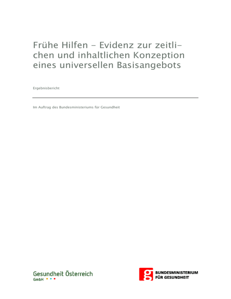 Frühe Hilfen - Evidenz zur zeitlichen und inhaltlichen Konzeption eines universellen Basisangebots Ergebnisbericht Im Auftrag des Bundesministeriums für Gesundheit Frühe Hilfen – Evidenz zur zeitlichen und inhaltlichen Konzeption eines universellen Basisangebots Ergebnisbericht Autorinnen: Katja Antony Heidi Stürzlinger Marion Weigl Projektassistenz: Romana Landauer Wien, im Jänner 2014 Im Auftrag des Bundesministeriums für Gesundheit Zahl: P9/3/4679-1/14 Eigentümer, Herausgeber und Verleger: Gesundheit Österreich GmbH, Stubenring 6, 1010 Wien, Tel. +43 1 515 61, Fax 513 84 72, Homepage: www.goeg.at Der Umwelt zuliebe: Dieser Bericht ist auf chlorfrei gebleichtem Papier ohne optische Aufheller hergestellt. Kurzfassung Hintergrund Als Beitrag zur Umsetzung der Kinder- und Jugendgesundheitsstrategie hat das Bundesministerium für Gesundheit (BMG) die Gesundheit Österreich GmbH (GÖG) mit einem Grundlagenprojekt zu Frühen Hilfen beauftragt. Im Rahmen dieses Projekts wurde ein sogenanntes „Idealmodell Früher Hilfen“ für Österreich entwickelt; es besteht aus einem indizierten Angebot für Familien in belasteten Lebenssituationen durch regionale Frühe-Hilfen-Netzwerke das mit einem bundesweit bereitgestellten universellen Basisangebot für alle Familien verknüpft ist (Haas et al. 2013). Vorliegender Bericht bereitet die Evidenz auf, und zwar sowohl zu Interventionszeitpunkten als auch zu Inhalten der einzelnen Termine von internationalen universellen Programmen Früher Hilfen (also für alle Schwangeren bzw. werdenden Eltern und Eltern von Babys). Im Rahmen des Grundlagenprojekts wurde eine Begriffsdefinition „Frühe Hilfen“ für Österreich erarbeitet (Haas et al. 2013). Demnach stellen Frühe Hilfen „ein Gesamtkonzept von Maßnahmen zur Gesundheitsförderung bzw. gezielten Frühintervention in der frühen Kindheit (Schwangerschaft bis Schuleintritt) dar, die die spezifischen Lebenslagen und Ressourcen von Familien berücksichtigen und mit vielfältigen Ansätzen, Angeboten, Strukturen und Akteuren vernetzt sind. Frühe Hilfen zielen darauf ab, Entwicklungsmöglichkeiten und Gesundheitschancen von Kindern und Eltern in Familie und Gesellschaft frühzeitig und nachhaltig zu verbessern.“ (Knaller 2013) Fragestellungen Der Bericht geht folgenden Fragen nach: Welche Interventionen (Beratungsgespräche/ Hausbesuche) setzen etablierte universelle Programme (mit aufsuchenden Komponenten) während der Schwangerschaft und binnen zwölf Monaten nach der Geburt des Kindes? Wie viele Termine finden im universellen Angebot geplanterweise statt? Wie verteilen sich die Termine hinsichtlich der Schwangerschaftswochen bzw. des Alters des Kindes? Welche konkreten Inhalte werden zu den einzelnen Terminen angeboten/aufgegriffen? Wie stellt sich die Evidenzgrundlage zu der Gestaltung der Programme (Termine/Inhalte) dar? Methodik In Abstimmung mit der Projektkoordinatorin Frühe Hilfen an der GÖG wurden vier europäische Beispielländer ausgewählt: Finnland, Großbritannien (England), Niederlande und Schweden, deren Programme hinsichtlich der oben angeführten Fragestellungen untersucht werden. Weiters berücksichtigt werden zwei regionale Angebote Früher Hilfen in Deutschland (Netzwerke Gesunde Kinder des Landes Brandenburg und Aktionsprogramm Familienbesucher der Stiftung Kinderland Baden-Württemberg), die einen universellen Ansatz verfolgen. Für die Evidenzrecherche wurde ein selektiver Zugang gewählt: Internetrecherchen wurden durchgeführt, graue Literatur gesichtet und ein Fragenkatalog entwickelt und an die zuständigen Institutionen in den ausgewählten Ländern versandt. Für die Darstellung der beiden deutschen Modellprojekte wurde auf Publikationen öffentlicher Institutionen und persönliche Kontakte zurückgegriffen. Umfang, Tiefe und Zuverlässigkeit der Ergebnisse der Evidenzrecherche unterscheiden sich zwischen den einzelnen Ländern aufgrund der Konzeption der Programme und des Zugangs zur Information (Kooperation von Kontaktpersonen, Landessprache). Ergebnisse In den Beispielländern werden die Vorsorgeleistungen der Programme „Früher Hilfen“ überwie- gend durch nicht-ärztliche Berufsgruppen wie Public-Health-Nurses und Hebammen, verschränkt mit medizinischen Vorsorgeleistungen, erbracht. Ergänzend werden medizinische Vorsorgeleistungen durch ärztliches Personal angeboten. In Deutschland hingegen werden die gesundheitlichen Vorsorgeleistungen im Rahmen der Schwangerschaft sowie für Kinder, ähnlich wie in Österreich, überwiegend von Ärztinnen/Ärzten erbracht. Das Angebot „Früher Hilfen“ wird im Aktionsprogramm Familienbesucher von Personen mit pädagogischer oder medizinischer Grundausbildung und zusätzlicher Ausbildung erbracht. Das Modellprojekt Netzwerke Gesunde Kinder arbeitet mit ehrenamtlichen Patinnen bzw. Paten. Ein Vergleich der Anzahl der in den universellen Programmen angebotenen Termine zeigt sich aufgrund der unterschiedlichen Strukturen dieser Programme als wenig zielführend (Verschränkung mit medizinischen Vorsorgeleistungen, siehe oben). In den universellen Programmen finden im Rahmen der Schwangerschaft zwischen einem und zehn Terminen und zwischen drei und elf Terminen im ersten Lebensjahr des Kindes statt. Das deutsche Aktionsprogramm Familienbesucher sieht nur einen Termin vor (5. bis 12. Lebenswoche), im Netzwerk Gesunde Kinder sind neben dem Erstgespräch (das eventuell schon in der Schwangerschaft stattfindet) sechs Besuche im ersten Lebensjahr des Kindes geplant. Die Leistungsangebote/Inhalte in den Beispielländern sind umfassend. In Gesprächen wird gesundheitsförderndes Verhalten ebenso thematisiert wie auch die Lebenssituation der Familien, Fragen der Partnerschaft, des sozialen Umfelds und der wirtschaftlichen und beruflichen Situation (in unterschiedlichem Ausmaß). Ziele der Programme sind jedenfalls eine Stärkung der Ressourcen der Familie, Aufklärung über Förderungen und Angebote für Familien sowie ei