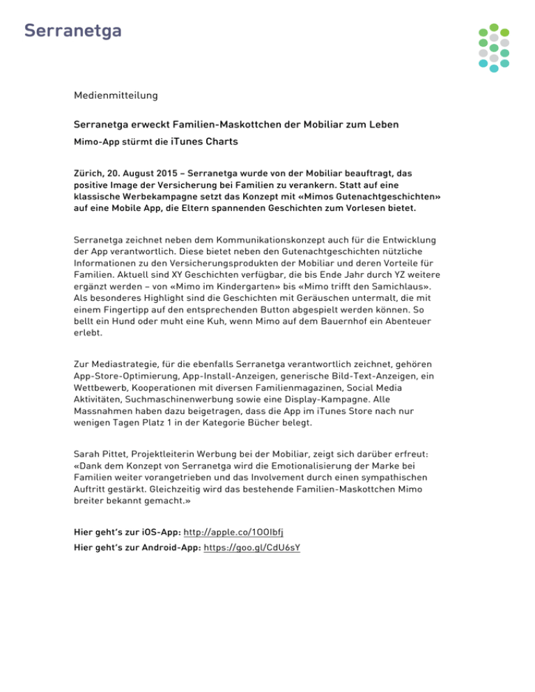 Medienmitteilung Serranetga erweckt Familien-Maskottchen der Mobiliar zum Leben Mimo-App stürmt die iTunes Charts Zürich, 20. August 2015 – Serranetga wurde von der Mobiliar beauftragt, das positive Image der Versicherung bei Familien zu verankern. Statt auf eine klassische Werbekampagne setzt das Konzept mit «Mimos Gutenachtgeschichten» auf eine Mobile App, die Eltern spannenden Geschichten zum Vorlesen bietet. Serranetga zeichnet neben dem Kommunikationskonzept auch für die Entwicklung der App verantwortlich. Diese bietet neben den Gutenachtgeschichten nützliche Informationen zu den Versicherungsprodukten der Mobiliar und deren Vorteile für Familien. Aktuell sind XY Geschichten verfügbar, die bis Ende Jahr durch YZ weitere ergänzt werden – von «Mimo im Kindergarten» bis «Mimo trifft den Samichlaus». Als besonderes Highlight sind die Geschichten mit Geräuschen untermalt, die mit einem Fingertipp auf den entsprechenden Button abgespielt werden können. So bellt ein Hund oder muht eine Kuh, wenn Mimo auf dem Bauernhof ein Abenteuer erlebt. Zur Mediastrategie, für die ebenfalls Serranetga verantwortlich zeichnet, gehören App-Store-Optimierung, App-Install-Anzeigen, generische Bild-Text-Anzeigen, ein Wettbewerb, Kooperationen mit diversen Familienmagazinen, Social Media Aktivitäten, Suchmaschinenwerbung sowie eine Display-Kampagne. Alle Massnahmen haben dazu beigetragen, dass die App im iTunes Store nach nur wenigen Tagen Platz 1 in der Kategorie Bücher belegt. Sarah Pittet, Projektleiterin Werbung bei der Mobiliar, zeigt sich darüber erfreut: «Dank dem Konzept von Serranetga wird die Emotionalisierung der Marke bei Familien weiter vorangetrieben und das Involvement durch einen sympathischen Auftritt gestärkt. Gleichzeitig wird das bestehende Familien-Maskottchen Mimo breiter bekannt gemacht.» Hier geht’s zur iOS-App: http://apple.co/1OOIbfj Hier geht’s zur Android-App: https://goo.gl/CdU6sY Verantwortlich bei der Mobiliar: Sarah Pittet (Projektleiterin Werbung), Ronald Halter (Online Marketing Specialist), Michael Engel (Fachspezialist Internet) Verantwortlich bei Serranetga: Maurizio Rugghia (Gesamtverantwortung), Barbara Flury, Tino Elsener (Beratung), Philippe Lehmann (AD), Pascal Baumann (Screendesign), Thomas Blumer (Text), Vanessa Habisreutinger (Media), Diego Dirren, Thomas Spreng (Technische Begleitung), Lovey Wymann (Mimo Geschichten), Corina Vögele (Mimo Illustrationen) Weitere Auskünfte: Niklaus Baer, Communications Manager, Serranetga AG, Zürich +41 78 800 19 98, [email protected] Maurizio Rugghia, Geschäftsführer und Partner, Serranetga AG, Zürich +41 79 439 37 26, [email protected] Bildlegenden: Bild 1 und 2: Statt auf eine klassische Werbekampagne setzt das von Serranetga für die Mobiliar entwickelte Konzept auf eine Mobile App. «Mimos Gutenachtgeschichten» bietet eine Fülle von spannenden Geschichten zum Vorlesen – für zuhause und unterwegs. Bild 3: Das digitale «Gutenachtgeschichten-Buch» stürmte in nur wenigen Tagen von null auf Platz eins im iTunes Store in der Kategorie Bücher.