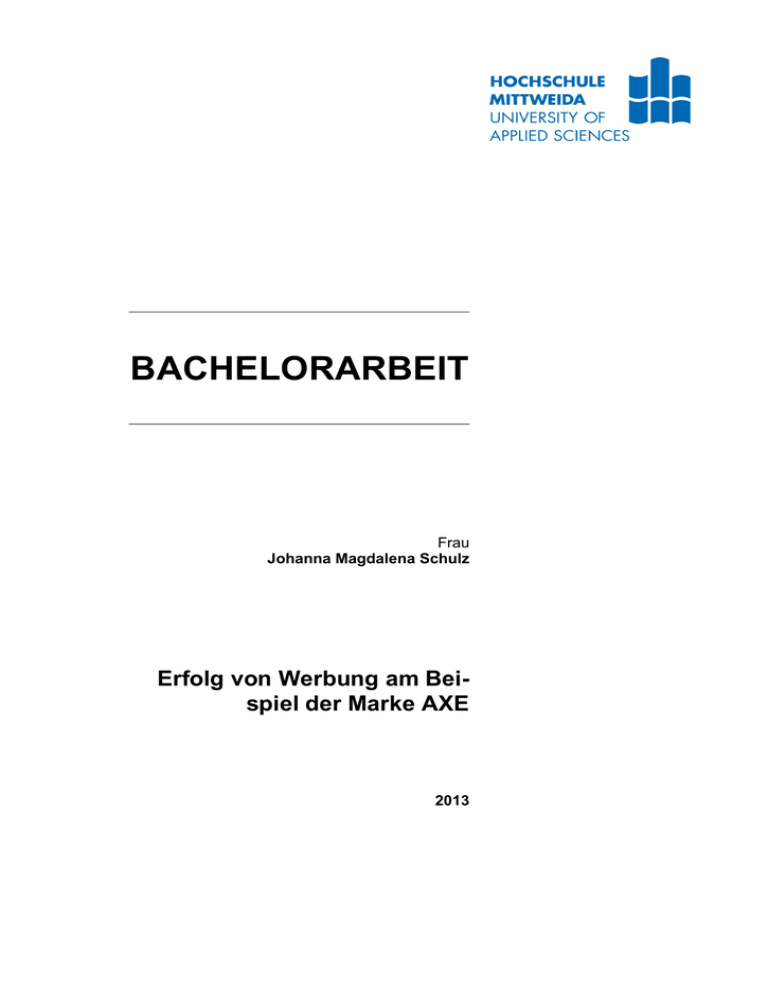 BACHELORARBEIT Frau Johanna Magdalena Schulz Erfolg von Werbung am Beispiel der Marke AXE 2013 BACHELORARBEIT Fakultät: Medien Erfolg von Werbung am Beispiel der Marke AXE Autorin: Frau Johanna Magdalena Schulz Studiengang: Angewandte Medien Seminargruppe: AM10wM3-B Erstprüfer: Prof. Dr. Detlef Gwosc Zweitprüfer: Guido Weihermüller Einreichung: Hamburg, 23.07.2013 BACHELOR THESIS Faculty of Media Successful advertising on the example of the brand AXE author: Ms. Johanna Magdalena Schulz course of studies: Applied Media seminar group: AM10wM3-B first examiner: Prof. Dr. Detlef Gwosc second examiner: Guido Weihermüller submission: Hamburg, 23.07.2013 Bibliografische Angaben Nachname, Vorname: Schulz, Johanna Magdalena Erfolg von Werbung am Beispiel der Marke AXE Successful advertising on the example of the brand AXE 70 Seiten, Hochschule Mittweida, University of Applied Sciences, Fakultät Medien, Bachelorarbeit, 2013 Abstract Die vorliegende Bachelorarbeit beschäftigt sich mit der Fragestellung, warum sich die Werbefilme der Marke AXE großer Beliebtheit erfreuen und inwiefern diese beliebten Filme mit dem Erfolg der Produkte der Marke zusammenhängen. Als Grundlage dafür werden Werbeerfolgsfaktoren beschrieben. Des Weiteren wird betrachtet, was Werbung und im Besonderen Fernsehwerbung ist, wie sie auf Konsumenten wirkt und demnach auch wie Kaufentscheidungen von Konsumenten getroffen werden und beeinflusst werden können. Schließlich werden Werbefilme der Marke AXE verglichen und auf Erfolgsfaktoren und Unterschiede ihrer Botschaft(-svermittlung) untersucht. Inhaltsverzeichnis V Inhaltsverzeichnis Inhaltsverzeichnis .........................................................................................................V Abkürzungsverzeichnis ..............................................................................................VII Abbildungsverzeichnis ..............................................................................................VIII Tabellenverzeichnis .....................................................................................................IX 1 Einleitung ................................................................................................................. 1 2 Marketing ................................................................................................................. 3 2.1 Definitionen ..................................................................................................... 3 2.1.1 Definition Marketing .......................................................................... 3 2.1.2 Definition Marketingmanagement ..................................................... 4 2.2 Marketing-Mix ................................................................................................. 5 2.3 Marktsegmentierung ....................................................................................... 8 2.4 USP – Unique Selling Proposition .................................................................. 9 2.5 Internationales Marketing ............................................................................. 10 3 Werbung ................................................................................................................ 14 3.1 Definition Werbung ....................................................................................... 14 3.2 Zahlen und Fakten ........................................................................................ 15 3.3 Funktionen von Werbung .............................................................................. 17 3.3.1 Funktionen für den Konsumenten .................................................. 17 3.3.2 Funktionen für das werbende Unternehmen .................................. 18 3.4 Werbemittel ................................................................................................... 19 3.5 TV-Werbung ................................................................................................. 20 4 Werbewirkung ....................................................................................................... 24 4.1 Medienwirkungsmodelle ............................................................................... 24 4.1.1 S-R-Modell ..................................................................................... 24 4.1.2 S-O-R-Modell ................................................................................. 25 4.1.3 Totalmodelle ................................................................................... 26 4.2 Werbewirkungsmodelle ................................................................................ 27 4.2.1 AIDA-Modell ................................................................................... 28 4.2.2 Modell der Wirkungspfade .............................................................. 29 4.3 Erkenntnisse des Neuromarketing ................................................................ 34 4.4 Werbeerfolg .................................................................................................. 38 Inhaltsverzeichnis VI 5 Werbeerfolgsfaktoren ........................................................................................... 40 5.1 Emotionale Werbung .................................................................................... 41 5.2 Mythos „Sex Sells“ ........................................................................................ 42 5.3 Humor ........................................................................................................... 44 5.4 Weitere Faktoren .......................................................................................... 45 6 AXE ......................................................................................................................... 47 6.1 Das Unternehmen „Unilever“ ........................................................................ 47 6.2 Die Marke AXE .............................