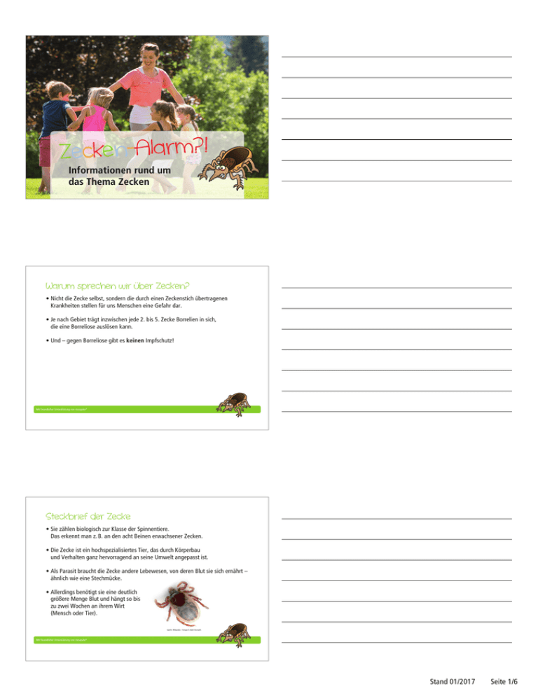 Zecken-Alarm?! Informationen rund um das Thema Zecken Warum sprechen wir über Zecken? • Nicht die Zecke selbst, sondern die durch einen Zeckenstich übertragenen Krankheiten stellen für uns Menschen eine Gefahr dar. • Je nach Gebiet trägt inzwischen jede 2. bis 5. Zecke Borrelien in sich, die eine Borreliose auslösen kann. • Und – gegen Borreliose gibt es keinen Impfschutz! Mit freundlicher Unterstützung von mosquito® Steckbrief der Zecke • Sie zählen biologisch zur Klasse der Spinnentiere. Das erkennt man z. B. an den acht Beinen erwachsener Zecken. • Die Zecke ist ein hochspezialisiertes Tier, das durch Körperbau und Verhalten ganz hervorragend an seine Umwelt angepasst ist. • Als Parasit braucht die Zecke andere Lebewesen, von deren Blut sie sich ernährt – ähnlich wie eine Stechmücke. • Allerdings benötigt sie eine deutlich größere Menge Blut und hängt so bis zu zwei Wochen an ihrem Wirt (Mensch oder Tier). Quelle: Wikipedia - Fotograf: André Karwath Mit freundlicher Unterstützung von mosquito® Stand 01/2017 Seite 1/6 Der Entwicklungszyklus einer Zecke • Die Zecke hat 3 Entwicklungsstadien: 1. Larven: 0,5 mm groß 2. Nymphe: 1,0 mm groß 3. Adultus: 2 – 4 mm groß • Jedes Entwicklungsstadium benötigt 1x eine Blutmahlzeit, um sich weiterzuentwickeln. • Zwischen den Blutmahlzeiten können Jahre liegen, sodass ein Holzbock bis zu 6 Jahre alt werden kann. Mit freundlicher Unterstützung von mosquito® Lebensräume der Zecke • Lebt in niedriger Vegetation bis maximal 1,5 m Höhe, z. B. im Gras, Kräutern und Büschen. • Lebt auch in heimischen Gärten, in Parks oder auf Spielplätzen. • Sucht sich Stellen der Haut, die besonders dünn, feucht und warm sind (Kniekehle, Achsel, Nacken, zwischen den Beinen). Mit freundlicher Unterstützung von mosquito® Wie finden Zecken ihren Wirt? • Ortung über das sogenannte „Hallersche Organ”. Sie spüren: 1. Bodenschwingung 2. Wärme 3. Geruch (Aminosäuren, Ammoniak, Buttersäure, Milchsäuren) • Nicht die Menge eines bestimmten Stoffes, sondern die „richtige Mischung“ macht den Mensch als Wirt interessant. • Für den Einstich sucht sich die Zecke Stellen der Haut, die besonders dünn, feucht und warm sind (Kniekehle, Achsel, Nacken, zwischen den Beinen). Mit freundlicher Unterstützung von mosquito® Stand 01/2017 Seite 1/6 Beißen oder stechen Zecken? • Zecken haben einen hochentwickelten Stechapparat. • Mit den scherenartigen Mundwerkzeugen reißen sie die Haut auf und graben sich mit ihrem „Stachel“ in das Gewebe. • Der Stechapparat selbst besitzt viele kleine Widerhaken, um sich am Wirt festzuhalten. www.zecken.de Mit freundlicher Unterstützung von mosquito® Wie groß können Zecken werden? • Das gesaugte Blut lässt die kleine Zecke deutlich wachsen. • Dadurch steigt ihr Eigengewicht um ein Vielfaches. Der Darm besteht aus vielen Anhängen und ist so dehnbar, dass eine vollgesaugte Zecke bis zu 200-mal so viel wiegen kann wie eine hungrige. • Sie hat vollgesogen in etwa die Größe einer Kidney-Bohne. www.zecken.de Mit freundlicher Unterstützung von mosquito® Warum spüren wir den Stich nicht? • Zecken sondern über den Speichel ein Lokalanästhetikum ab, welches die Einstichstelle betäubt. • Der Speichel beinhaltet Stoffe, die dafür sorgen, dass das Blut nicht gerinnt sowie andere Stoffe die verhindern, dass sich die Einstichstelle entzündet. www.zecken.de Mit freundlicher Unterstützung von mosquito® Stand 01/2017 Seite 2/6 Was tun bei einem Stich? • Entfernen Sie die Zecke sofort mit einer Zecken-Karte, -Zange oder -Pinzette. • Nicht drehen – Zecken haben kein Gewinde. • Beobachten Sie die Einstichstelle. Bei einer kreisförmigen Rötung um den Stich suchen Sie umgehend einen Arzt auf. Mit freundlicher Unterstützung von mosquito® Was passiert, wenn der Kopf stecken bleibt? • Keine Sorge! Bei einer Zeckenentfernung kann es durchaus vorkommen, dass Reste der Zecke in der Haut zurückbleiben. • Hierbei handelt es sich jedoch nicht um den vermeintlichen Kopf der Zecke, sondern einfach um einen Teil des Stechapparates. • Dieser kleine Fremdkörper wird meist von selbst nach einiger Zeit abgestoßen oder kann mit einer Pinzette entfernt werden. • Von ihm geht keine Gefahr einer Krankheitsübertragung aus. Mit freundlicher Unterstützung von mosquito® Übertragung von Krankheiten durch Zecken: • FSME (Frühsommer-Meningoenzephalitis) • Borreliose (Lyme-Borreliose) • Ehrlichiose • Zeckenstichfieber • Babesiose Mit freundlicher Unterstützung von mosquito® Stand 01/2017 Seite 3/6 FSME (Frühsommer-Meningoenzephalitis) • Wird durch Viren hervorgerufen. • Ausgewiesene Risikogebiete in Deutschland sind derzeit: Bayern und BadenWürttemberg und einige Teile von Hessen, Thüringen und Rheinland-Pfalz. • Bei Kindern und Jugendlichen heilt die Krankheit meist folgenlos aus, bei Erwachsenen bleiben bei bis zu 30% neurologische Defizite unterschiedlichen Ausmaßes bestehen. Etwa 1% der Erkrankten sterben an den Folgen. • Nach einer überstandenen Infektion besteht eine lebenslange Immunität, auch gegen die anderen Typen des FSME-Virus. • Eine Impfung ist möglich. Mit freundlicher Unterstützung von mosquito® Borreliose – Die unterschätzte Gefahr Flensburg Rostock Hamburg Bremen Berlin Hannover • Man kann sich überall in Deutschland mit Borreliose infizieren. Düsseldorf Köln Koblenz • Es gibt derzeit noch keine Impfung gegen Borreliose. Leipzig Marburg Jena Frankfurt Borreliose Nürnberg Borreliose und FSME Stuttgart Ulm • Etwa jede 2. bis 5. Zecke ist mit Borrelien infiziert. Freiburg München Konstanz Quelle: Robert Koch-Institut, Epidem. Bulletin Nr. 18, 2013 • Bis zu 100.000 Menschen erkranken Schätzungen zufolge jährlich. • Es kann zu schweren Verlaufsformen mit Haut- und Gelenkbeschwerden sowie neurologischen Veränderungen kommen. Mit freundlicher Unterstützung von mosquito® Wie schützt man sich vor 