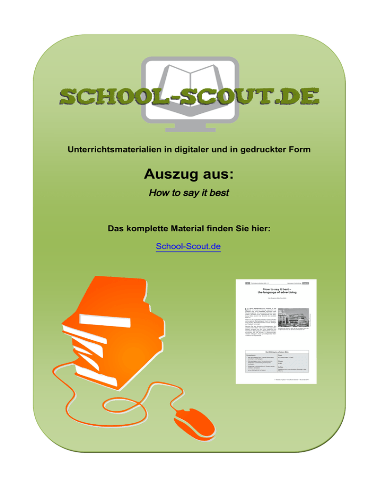 Unterrichtsmaterialien in digitaler und in gedruckter Form Auszug aus: How to say it best Das komplette Material finden Sie hier: School-Scout.de IV Practising marketing skills • 2 Language of advertising 1 von 24 How to say it best – the language of advertising Von Susanne Scholten, Köln E © picture alliance/Photoshot in neues Einkaufszentrum eröffnet in der Stadt, eine Autovermietung expandiert ins Ausland und eine Hotelkette informiert über Sonderangebote. Um potenzielle Kunden anzulocken, bedienen sich Unternehmen der Werbung. Dabei kommt der Sprache eine zentrale Rolle zu. Nicht nur im englischsprachigen Ausland finden sich englische Werbeslogans. Auch in Deutschland werden Werbebotschaften immer häufiger auf Englisch formuliert. Machen Sie Ihre Schüler zu Werbetextern: Mit welchen Stilmitteln man einen wirkungsvollen Slogan verfasst und wie man Adjektive und Adverbien überzeugend in Werbetexte einbaut, erarbeiten sich die Schüler in abwechslungsreichen Übungen. Auch grundlegendes Fachvokabular wird gefestigt. Werbung ist überall – aber auf die richtigen Formulierungen kommt es an, damit sie erfolgreich ist! Das Wichtigste auf einen Blick Kompetenzen Dauer – den Wortschatz zum Thema Advertising erweitern und festigen 4 Schulstunden (+ Test) – Werbeslogans unter Verwendung von Stilmitteln (advertising techniques) verfassen Niveau B1/B2 – Adjektive und Adverbien in Texten werbewirksam einsetzen Ihr Plus – einen Werbebrief verfassen Farbfolie zum motivierenden Einstieg in das Thema 1 RAAbits Englisch • Berufliche Schulen • November 2011 2 von 24 Language of advertising Practising marketing skills • 2 IV Fachliche Hinweise Warum Advertising? Das Thema Werbung gehört zum Bereich Marketing und somit zu den zentralen Themen der kaufmännischen Ausbildung. Werbung dominiert unseren Alltag; sie beeinflusst unsere Einstellungen zu Produkten und Dienstleistungen sowie unser Kaufverhalten. Und sie spielt eine entscheidende Rolle beim Verkaufserfolg. Der Schwerpunkt dieser Unterrichtseinheit liegt auf der Werbesprache. Um eine inhaltliche Grundlage zu schaffen, beschäftigen sich die Materialien aber zunächst mit den verschiedenen Möglichkeiten, Werbung zu machen. Hierzu zählen Werbemittel wie Zeitungen und Zeitschriften, Werbebanner im Internet oder Plakatwände. In einem zweiten Schritt geht es dann um den sprachlichen Aspekt der Werbung. Hier stehen Slogans und Werbebriefe im Vordergrund. Wodurch zeichnet sich die Werbesprache aus? Wer seine Produkte und Dienstleistungen gewinnbringend verkaufen will, muss die richtige Sprache sprechen, um das Interesse des potenziellen Käufers zu gewinnen und ihn vom Kauf zu überzeugen. Vor allem in Slogans und Werbetexten kommt es auf die richtigen Formulierungen an. Ein Slogan ist eine kurze Werbebotschaft – meist nur ein kurzer (Teil-)Satz –, die Aufmerksamkeit erzeugen und Interesse wecken soll. Durch den Einsatz verschiedener Stilmittel wie Aufforderungen (z. B. Come in and find out), Reime (Don’t just book it, Thomas Cook it.) oder Wiederholungen (Share moments. Share life.) wird erreicht, dass sich der Slogan einprägt. Ein Werbebrief (sales letter) ist eine Form des Direktmarketings. Er wird in Form eines Briefes, einer Postwurfsendung oder einer E-Mail direkt an potenzielle oder bestehende Kunden verschickt. Die persönliche Ansprache spielt hier eine entscheidende Rolle. Deshalb sind Formulierungen wie you, your und dear (in der Anrede) unverzichtbar. Der Werbebrief hat zum Ziel, ein Produkt bzw. eine Dienstleistung bekannt zu machen und Interesse zu wecken, oder – im Falle eines bestehenden Angebots – den Konsumenten durch Informationen zu Preisänderungen oder das Ausloben von Sonderangeboten zum Kauf zu bewegen. Ein typischer Werbebrief setzt sich zusammen aus Adresszeile und Bild, direkter Anrede und einem Hauptteil, der über Details des Angebots informiert und durch die Angabe von Kontaktmöglichkeiten (Telefonnummer, Homepage) den Leser zum Reagieren auffordert. Am Ende steht meist ein PS (postscript), das ein spezielles Sonderangebot (z. B. Angebot des Monats oder Eröffnungsangebot) auslobt. Häufig bedienen sich Werbetexter Adjektiven und Adverbien, um Produkte oder Dienstleistungen zu beschreiben und anzupreisen. Doch nicht alle Adjektive und Adverbien sind gleichermaßen passend. Es gilt die Regel: je konkreter, desto besser. Ein Adjektiv wie nice etwa hat wenig Aussagekraft. Wenn man es aber durch Formulierungen wie sunny (weather) oder relaxing (walk) ersetzt, entsteht vor dem inneren Auge ein Bild und der potenzielle Kunde kann sich viel eher etwas unter der Beschreibung und damit dem Produkt vorstellen. Neben starken Adjektiven und Adverbien gibt es viele weitere werbetypische Begriffe. Einer Studie der Yale University zufolge zählen Wörter wie you, money, love, easy und new zu den zwölf am häufigsten verwendeten Begriffen in englischsprachigen Werbetexten. Didaktisch-methodische Hinweise An welches Niveau richtet sich die Unterrichtseinheit? Diese Einheit richtet sich an Lernende mit B1- und B2-Niveau. Vorkenntnisse im Bereich Marketing und Werbung sind von Vorteil, aber nicht zwingend nötig. In dieser Einheit erarbeiten sich die Schülerinnen und Schüler1 die wichtigsten Werbemittel und Regeln der Werbesprache sowie den grundlegenden Wortschatz. 1 Im weiteren Verlauf wird aus Gründen der besseren Lesbarkeit nur „Schüler“ verwendet. Ein differenzierendes Arbeitsblatt zum Verfassen von Slogans und werbewirksamen Texten (M 4) auf der CD 1 bietet eine zusätzliche Herausforderung für Schüler mit B2-Niveau. 1 RAAbits Englisch • Berufliche Schulen • November 2011 IV Practising marketing skills • 2 Language of advertising 3 von 24 Welche Berufsgruppen werden berücksichtigt? Im Fokus der Einheit stehen Marketingassistenten und Werbekaufleute aus allen Branchen, aber auch Groß- und Einzelhandelskaufleute sowie Dienstleister, die Werbung für ihre Produkte und Dienstleistun