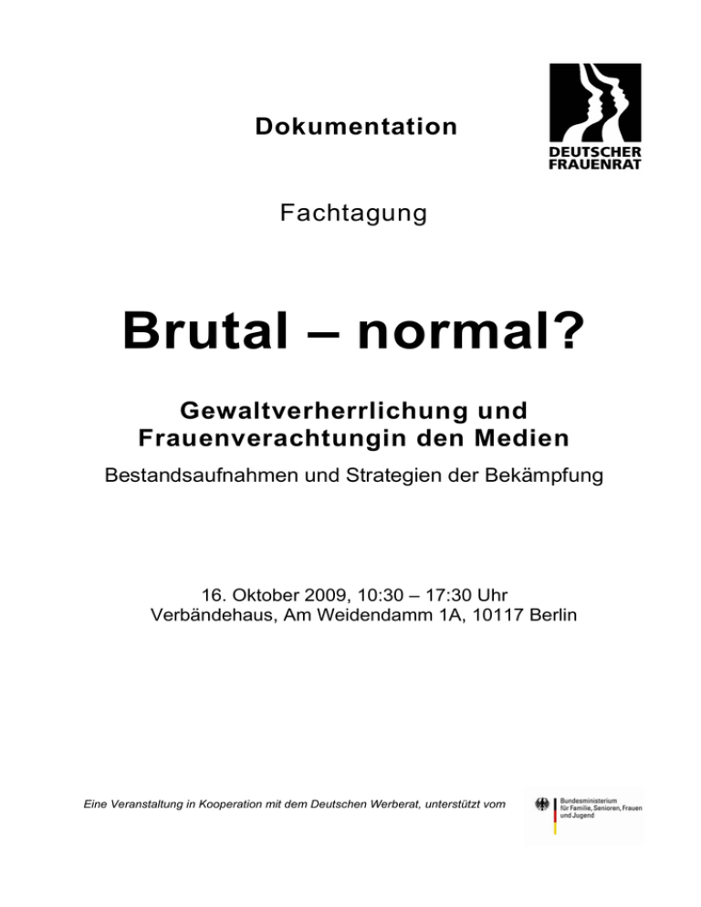 Dokumentation Fachtagung Brutal – normal? Gewaltverherrlichung und Frauenverachtungin den Medien Bestandsaufnahmen und Strategien der Bekämpfung 16. Oktober 2009, 10:30 – 17:30 Uhr Verbändehaus, Am Weidendamm 1A, 10117 Berlin Eine Veranstaltung in Kooperation mit dem Deutschen Werberat, unterstützt vom Fachtagung Brutal – normal? Gew altverherrlichung und Frauenverachtung in den Medien Bestandsaufnahmen und Strategien der Bekämpfung 16. Oktober 2009, 10:30 – 17:30 Uhr Verbändehaus, Am Weidendamm 1A, 10117 Berlin Programm 10:30 Begrüßung Marlies Brouwers Vorsitzende des Deutschen Frauenrates Einführung: Ulrike Helwerth Referentin des Deutschen Frauenrates Schuldig oder Sündenbock? Medien und Gewalt 11:00 Vortrag: Erniedrigend. Demütigend. Diskriminierend Rote Karte für reaktionäre Frauenbilder in der Werbung 12:00 Vortrag: „… mit ’ner Shotgun ins Gesicht und so was“ Jugendliche und Gewalt im Web 2.0 13:00 Mittagspause 14:00 Vortrag: Jugendschutz vs. Gangsta-Rap und Torture Porn Die Arbeit der Bundesprüfstelle für jugendgefährdende Medien (BPjM) 15:00 Vortrag: 16:00 Kaffeepause 16:30 Zusammenfassung des Tages 17:30 Ende Volker Nickel Sprecher des Deutschen Werberates Dr. Stefanie Rhein wissenschaftliche Mitarbeiterin an der PH Ludwigsburg Petra Meier stellvertretende Vorsitzende der Bundesprüfstelle für jugendgefährdende Medien Brigitte Reimer Redakteurin des Bayerischen Rundfunks und langjähriges Die Saure Gurke – eine ungewöhnliche Jurymitglied der „Sauren Erfolgsgeschichte Sexismus und Frauenfeindlichkeit im öffentlich-rechtlichen Gurke“ Fernsehen Ilona Helena Eisner Vorstandsmitglied des Deutschen Frauenrates Eine Veranstaltung in Kooperation mit dem Deutschen Werberat, unterstützt vom Fachtagung Brutal – normal? Gewaltverherrlichung und Frauenverachtung in den Medien Berlin 16.10.2009 Grußwort Marlies Brouwers, Vorsitzende des Deutschen Frauenrates Sehr geehrter Herr Nickel, sehr geehrte Damen und Herren, ich freue mich sehr, Sie heute zu dieser Veranstaltung begrüßen zu dürfen, der wir den Titel „Brutal – normal?“ gegeben haben. Eine eher ungewöhnliche Benennung einer Veranstaltung, aber sie beschäftigt sich auch mit einem Thema, über das mittlerweile zwar immer öfter lautstark Kritik geäußert wird, das aber leider auch zu oft einfach hingenommen wird, oder über das hinweggeschaut wird, auch weil wir uns hilflos fühlen: nämlich Gewaltverherrlichung und Frauenverachtung in den Medien. Anstoß für die heutige Veranstaltung ist zum einen ein Beschluss der Mitgliederversammlung 2008 des Deutschen Frauenrates, sich verstärkt für die Vermeidung von Frauen verachtenden und Gewalt verherrlichenden Darstellungen in allen Medien, einschließlich der Werbung, einzusetzen. Hintergrund ist die zunehmende Verbreitung von Gewaltdarstellungen im Internet und die gestiegenen Beschwerden gegen Frauenfeindlichkeit besonders in der kommerziellen Werbung. Deshalb wollen wir heute mit Expertinnen und Experten aus den unterschiedlichsten Medienbereichen eine Bestandsaufnahme dieser Problematik machen und konkrete Maßnahmen zu ihrer Bekämpfung ausloten. Zum anderen hat uns zu dieser Veranstaltung auch ein Artikel in der Süddeutschen Zeitung im Juni letzten Jahres angeregt. Darin lasen wir u.a., dass der Deutsche Werberat im Rückgang von Beschwerden gegen sexualisierte Werbung den Beweis für deren zunehmende Akzeptanz in der weiblichen Bevölkerung sieht. Es ist sicher nicht verwunderlich, dass der Deutsche Frauenrat eine andere Sicht auf die Dinge hat und sich veranlasst sah, dem Deutschen Werberat zu schreiben. Zumal es Studien gibt, die das Gegenteil beweisen, nämlich, dass Männer sexualisierte Werbung mögen, Frauen aber genau umgekehrt darauf reagieren. Ein Ergebnis dieses Briefes war ein sehr konstruktives und informatives Gespräch zwischen Ihnen, Herr Nickel, und zwei weiteren VertreterInnen des Deutschen Werberates und Vorstandsfrauen des Deutschen Frauenrates. Wir haben bei diesem Treffen einen engeren Austausch vereinbart und Kooperationen in Aussicht gestellt. Diese Fachtagung ist das erste „Produkt“ unserer neuen Kooperation. Deshalb gilt unser ganz besonderer Dank zum einen dem Zentralverband der Deutschen Werbewirtschaft, dafür, dass wir heute in diesen schönen Räumen tagen dürfen und zum anderen dem Deutschen Werberat, der als zentrales Instrument der Werbeselbstdisziplin dem Zentralverband angehört, als Kooperationspartner. Und somit natürlich ganz besonders Ihnen, lieber Herr Nickel, dafür, dass wir hier heute Ihre Gäste sein dürfen. Aber auch den anderen Expertinnen, Frau Dr. Rhein, Frau Meier und Frau Riemer, die wir für die doch weitgefächerte Problemlage haben gewinnen können, sei an dieser Stelle für ihr Kommen und bereits jetzt für ihre Vorträge herzlich gedankt. Erwähnen möchte ich auch das Ministerium für Familie, Senioren, Frauen und Jugend, das diese Veranstaltung finanziell fördert. Ich wünsche uns eine interessante und erkenntnisreiche Veranstaltung. Fachtagung Brutal – normal? Gewaltverherrlichung und Frauenverachtung in den Medien Berlin 16.10.2009 Einführung Schuldig oder Sündenbock? Medien und Gewalt Ulrike Helwerth Sehr geehrte Damen und Herren, vor einiger Zeit habe ich beschlossen, Sonntagabends auf den „Tatort“ zu verzichten. Ich hatte mich zu oft aufgeregt über die zunehmende Brutalität in diesen Filmen, die häufig mit sexueller Gewalt gegen Frauen und auch Kinder verbunden war. Ich empfang das manchmal als so verstörend, dass ich mich nicht länger mit solchen Bildern „füttern“ lassen wollte, die noch lange in mir arbeiteten. Mein Eindruck, dass Gewalt, besonders auch sexualisierte Gewalt, im Prime-TimeFernsehfilm - zur besten Familiensendezeit – zunimmt, habe ich natürlich nicht statistisch nachgeprüft. Vielleicht trügt mich ja mein Gefühl. Aber Ich kann gewalttätige Szenen, und seien sie „nur“ fiktiv („das ist doch nur ein Film!!!“), schl