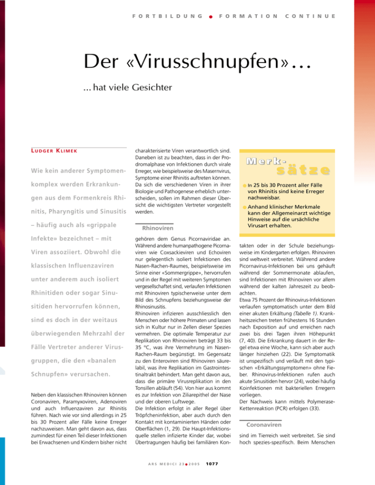 F O R T B I L D U N G ● F O R M A T I O N C O N T I N U E Der «Virusschnupfen»… ... hat viele Gesichter LUDGER KLIMEK Wie kein anderer Symptomenkomplex werden Erkrankungen aus dem Formenkreis Rhinitis, Pharyngitis und Sinusitis – häufig auch als «grippale Infekte» bezeichnet – mit Viren assoziiert. Obwohl die klassischen Influenzaviren unter anderem auch isoliert Rhinitiden oder sogar Sinusitiden hervorrufen können, sind es doch in der weitaus überwiegenden Mehrzahl der Fälle Vertreter anderer Virusgruppen, die den «banalen Schnupfen» verursachen. Neben den klassischen Rhinoviren können Coronaviren, Paramyxoviren, Adenoviren und auch Influenzaviren zur Rhinitis führen. Nach wie vor sind allerdings in 25 bis 30 Prozent aller Fälle keine Erreger nachzuweisen. Man geht davon aus, dass zumindest für einen Teil dieser Infektionen bei Erwachsenen und Kindern bisher nicht charakterisierte Viren verantwortlich sind. Daneben ist zu beachten, dass in der Prodromalphase von Infektionen durch virale Erreger, wie beispielsweise des Masernvirus, Symptome einer Rhinitis auftreten können. Da sich die verschiedenen Viren in ihrer Biologie und Pathogenese erheblich unterscheiden, sollen im Rahmen dieser Übersicht die wichtigsten Vertreter vorgestellt werden. Rhinoviren gehören dem Genus Picornaviridae an. Während andere humanpathogene Picornaviren wie Coxsackieviren und Echoviren nur gelegentlich isoliert Infektionen des Nasen-Rachen-Raumes, beispielsweise im Sinne einer «Sommergrippe», hervorrufen und in der Regel mit weiteren Symptomen vergesellschaftet sind, verlaufen Infektionen mit Rhinoviren typischerweise unter dem Bild des Schnupfens beziehungsweise der Rhinosinusitis. Rhinoviren infizieren ausschliesslich den Menschen oder höhere Primaten und lassen sich in Kultur nur in Zellen dieser Spezies vermehren. Die optimale Temperatur zur Replikation von Rhinoviren beträgt 33 bis 35 °C, was ihre Vermehrung im NasenRachen-Raum begünstigt. Im Gegensatz zu den Enteroviren sind Rhinoviren säurelabil, was ihre Replikation im Gastrointestinaltrakt behindert. Man geht davon aus, dass die primäre Virusreplikation in den Tonsillen abläuft (54). Von hier aus kommt es zur Infektion von Ziliarepithel der Nase und der oberen Luftwege. Die Infektion erfolgt in aller Regel über Tröpfcheninfektion, aber auch durch den Kontakt mit kontaminierten Händen oder Oberflächen (1, 29). Die Haupt-Infektionsquelle stellen infizierte Kinder dar, wobei Übertragungen häufig bei familiären Kon- ARS MEDICI 23● 2005 1077 Merk- sätze ● In 25 bis 30 Prozent aller Fälle von Rhinitis sind keine Erreger nachweisbar. ● Anhand klinischer Merkmale kann der Allgemeinarzt wichtige Hinweise auf die ursächliche Virusart erhalten. takten oder in der Schule beziehungsweise im Kindergarten erfolgen. Rhinoviren sind weltweit verbreitet. Während andere Picornavirus-Infektionen bei uns gehäuft während der Sommermonate ablaufen, sind Infektionen mit Rhinoviren vor allem während der kalten Jahreszeit zu beobachten. Etwa 75 Prozent der Rhinovirus-Infektionen verlaufen symptomatisch unter dem Bild einer akuten Erkältung (Tabelle 1). Krankheitszeichen treten frühestens 16 Stunden nach Exposition auf und erreichen nach zwei bis drei Tagen ihren Höhepunkt (7, 40). Die Erkrankung dauert in der Regel etwa eine Woche, kann sich aber auch länger hinziehen (22). Die Symptomatik ist unspezifisch und verläuft mit den typischen «Erkältungssymptomen» ohne Fieber. Rhinovirus-Infektionen rufen auch akute Sinusitiden hervor (24), wobei häufig Koinfektionen mit bakteriellen Erregern vorliegen. Der Nachweis kann mittels PolymeraseKettenreaktion (PCR) erfolgen (33). Coronaviren sind im Tierreich weit verbreitet. Sie sind hoch spezies-spezifisch. Beim Menschen F O R T B I L D U N G ● F O R M A T I O N C O N T I N U E Der «Virus-Schnupfen» hat viele Gesichter Ta b e l l e 1 : Klinische Erscheinungsbilder viraler Erkältungskrankheiten Viren Inkubationszeit Dauer der Symptome (Tage) Klinik Rhinoviren 1–3 2–26 Hypersekretion und Schwellung der Nasenschleimhaut, leichte Halsschmerzen, Kopfschmerzen, leichter Husten, kein Fieber. Coronaviren 1–3 2–18 Hypersekretion und Schwellung der Nasenschleimhaut, Abgeschlagenheit, Kopfschmerzen, Halsschmerzen, zum Teil Husten und Fieber, Schnupfen und Durchfall. Parainfluenza- 2–6 Viren 3–17 Hypersekretion und Schwellung der Nasenschleimhaut, Halsschmerzen, meist auch Entzündung der unteren Atemwege, (Typ 2: Pseudokrupp, Typ 3: Pneumonie und Bronchiolitis), häufig sekundäre bakterielle Besiedelung, daher von Anbeginn Antibiotika sinnvoll. RS-Viren 4–5 variabel Hypersekretion und Schwellung der Nasenschleimhaut, Fieber, Husten, Kopfschmerzen, Entzündung der unteren Atemwege, Pseudokrupp, schwerer Verlauf bei Säuglingen bis zum Alter von 6 Monaten. Influenzaviren 1–5 8–10 Grippe: schwere Symptomatik mit hohem Fieber, Glieder- und Muskelschmerzen, starke Kopfschmerzen, Abgeschlagenheit, Halsschmerzen, Husten, Entzündung der Bronchien, sekundäre Pneumonie durch bakterielle Superinfektion (Typ A: pandemisch, Typen B und C: weniger schwere Symptomatik, keine Pandemien). Adenoviren 2–8 variabel Schwellung der Nasenschleimhaut, Husten, Kopfschmerzen, teilweise mit fiebriger Halsentzündung (Typen 1–3, 5–7), oder Entzündung tieferer Luftwege, Bronchitis (Typen 3, 4, 7, 14, 21, 24), Mittelohrentzündung (versch. Typen), häufig jahrelange Persistenz des Erregers. Coxsackie-/ Echoviren 6–12 variabel «Sommergrippe» mit Hypersekretion und Schwellung der Nasenschleimhaut, Fieber, Husten, Halsschmerzen. Weiterhin: «Hand-, Fussund Munderkrankung» (Typen A 5, 7, 16), Herpangina mit typischen Aphten (Typen A 2, 4, 5, 6, 8, 10, 16) und andere Erkrankungen. sind Coronaviren (HCV, humane Coronaviren) als typische Erreger von Rhinitiden bekannt, wobei vorwiegend Erwachsene betroffen sind. Darüber hinaus sind Coronaviren als Erreger von Durchfallerkrankungen be