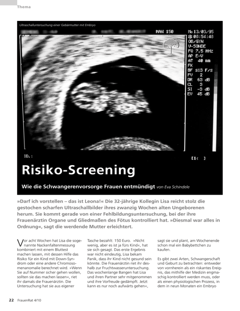 Thema Ultraschalluntersuchung einer Gebärmutter mit Embryo Risiko-Screening Wie die Schwangerenvorsorge Frauen entmündigt von Eva Schindele »Darf ich vorstellen – das ist Leona!« Die 32-jährige Kollegin Lisa reicht stolz die gestochen scharfen Ultraschallbilder ihres zwanzig Wochen alten Ungeborenen herum. Sie kommt gerade von einer Fehlbildungsuntersuchung, bei der ihre Frauenärztin Organe und Gliedmaßen des Fötus kontrolliert hat. »Diesmal war alles in Ordnung«, sagt die werdende Mutter erleichtert. V or acht Wochen hat Lisa die soge­ nannte Nackenfaltenmessung kombiniert mit einem Bluttest machen lassen, mit dessen Hilfe das Risiko für ein Kind mit Down-Syn­ drom oder eine andere Chromoso­ menanomalie berechnet wird. »Wenn Sie auf Nummer sicher gehen wollen, sollten sie das machen lassen«, riet ihr damals die Frauenärztin. Die Untersuchung hat sie aus eigener 22 FrauenRat 4/10 Tasche bezahlt: 150 Euro. »Nicht wenig, aber es ist ja fürs Kind«, hat sie sich gesagt. Das erste Ergebnis war nicht eindeutig, Lisa bekam Panik, dass ihr Kind nicht gesund sein könnte. Die Frauenärztin riet ihr des­ halb zur Fruchtwasseruntersuchung. Das wochenlange Bangen hat Lisa und ihren Partner sehr mitgenommen und ihre Vorfreude gedämpft. Jetzt kann es nur noch aufwärts gehen«, sagt sie und plant, am Wochenende schon mal ein Babybettchen zu kaufen. Es gibt zwei Arten, Schwangerschaft und Geburt zu betrachten: entweder von vornherein als ein riskantes Ereig­ nis, das mithilfe der Medizin engma­ schig kontrolliert werden muss, oder als einen physiologischen Prozess, in dem in neun Monaten ein Embryo Thema zum Kind und eine Frau zur Mutter wird. Diese zweite Sichtweise wird in den Niederlanden und in Skandina­ vien mit gutem Erfolg praktiziert. Schwangere Frauen werden dort von gut ausgebildeten Hebammen beglei­ tet, die erst bei Komplikationen fach­ ärztliche Hilfe anfordern. In Deutsch­ land entschied man sich schon vor vierzig Jahren für die erste Variante, mit der Folge, dass inzwischen siebzig Prozent der Frauen den Stempel »risi­ koschwanger« aufgedrückt bekom­ men, bei jeder vierten Frau die Geburt eingeleitet und bei jeder dritten das Kind per Kaiserschnitt geholt wird. Diese medizinisch-technische Hoch­ rüstung führt aber zu keinem besse­ ren »Outcome«, wie die Neugebore­ nen in der Fachsprache heißen. Nur die schwangeren Frauen sind bei uns gestresster, was sich – so zeigen immer mehr Studien – auch auf das Wohlergehen der Ungeborenen und später der Kinder auswirken kann. Fahndung nach Pathologischem F ür die Hamburger Hebamme und Ethnologin Angelica Ensel werden die Weichen für diese Entwicklung bereits ganz am Anfang der Schwan­ gerschaft gestellt: »Es ist etwas ande­ res, ob sich eine Frau mit ihrem Schwangersein beschäftigt und bewusst ja zu ihrem Kind sagt oder ob sie auf die Risiken starrt und stän­ dig abwägt, welche Untersuchung sie nun als Nächstes machen lassen soll. Frauen, die sich so auf die Ergebnisse der Untersuchungen fixieren, haben es viel schwerer, ein Selbstvertrauen in der Schwangerschaft zu entwickeln und mit ihrem Kind im Kontakt zu sein.« Die meisten Frauen lassen sich in der Schwangerschaft von einer Gynäko­ login oder einem Gynäkologen betreuen, die dafür ausgebildet sind, nach Pathologischem zu fahnden. Mit dem Ausstellen des Mutterpasses beginnt das Risiko-Screening – egal ob die Frau gesund ist oder nicht. Die Frau lernt von Anfang an, dass nicht ihrer eigenen Wahrnehmung und Intuition zu trauen ist, sondern den objektiven Laborergebnissen. Elf Untersuchungen sind in den Mutter­ schaftsrichtlinien empfohlen, jede zweite Schwangere sucht aber häufi­ ger die gynäkologische Praxis auf, um sich des guten Fortgangs der Schwan­ gerschaft zu versichern. Trotz der häufigen Arztkontakte kommen die Lebensverhältnisse der werdenden Mutter, ihre möglichen Sorgen und Belastungen, aber auch ihre Ressourcen kaum zur Sprache. Diese Ignoranz erstaunt, denn das psychische Wohlergehen der Schwan­ geren hat einen großen Einfluss auf den Verlauf der Schwangerschaft, etwa auf die Neigung zu vorzeitigen Wehen und damit zu einer Frühge­ burt. Statt immer nur auf mögliche Risiken zu schielen, sei es wichtig, die Selbstkompetenz der Schwangeren zu fördern und das Vertrauen in ihre eigenen Fähigkeiten, sagt die Osna­ brücker Gesundheitswissenschaftlerin und Ärztin Beate Schücking. Doch die schwangeren Frauen hätten sich an diese ständigen medizinischen Kont­ rollen nicht nur gewöhnt, sondern würden sie auch zunehmend nach­ fragen. »Offensichtlich sehen sich Frauen inzwischen selbst als Risiko­ fälle, die nur dank ärztlichem Management die Schwangerschaft und Geburt überstehen können.« Möglichweise erklärt dies den rapiden Anstieg der Schnittentbindungen im vergangenen Jahrzehnt. Vor allem Erstgebärende trauen sich eine nor­ male Spontangeburt immer seltener zu; sie haben Angst zu versagen, berichten GeburtshelferInnen. Außer­ dem seien schwangere Frauen heute im Durchschnitt älter und weniger fit. Sie hätten weniger Durchhaltevermö­ gen und Geduld und würden oft schneller medizinischen Interven­ tionen zustimmen. Der Kaiserschnitt, früher bei Kompli­ kationen oft der letzte lebensrettende Ausweg für Mutter oder Kind, wird inzwischen von Kliniken als eine Wahlmöglichkeit neben der Spontan­ geburt angeboten – für die Frau, die selbstbewusst selbst bestimmen will – so die offizielle Sprachregelung. Aller­ dings verbirgt sich dahinter ein öko­ nomisches Kalkül. In Zeiten klammer Kassen und der Personalknappheit ist der Kaiserschnitt eine gute Einnahme­ quelle. Er ist planbar, dauert in der Regel nicht einmal eine Stunde und bringt doppelt so viel Geld wie eine Spontangeburt, die sich über viele Stunden hinziehen kann. Zudem fühlen sich ÄrztInnen mit einem Kai­ serschnitt juristisch immer auf der sicheren Seite. Viel ist vom Wunschkaiserschnitt die Rede. Doch Studien ze