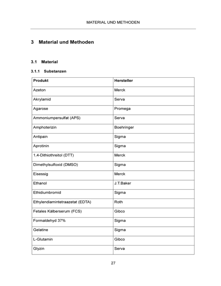 MATERIAL UND METHODEN 3 Material und Methoden 3.1 3.1.1 Material Substanzen Produkt Hersteller Azeton Merck Akrylamid Serva Agarose Promega Ammoniumpersulfat (APS) Serva Amphoterizin Boehringer Antipain Sigma Aprotinin Sigma 1,4-Dithiothreitol (DTT) Merck Dimethylsulfoxid (DMSO) Sigma Eisessig Merck Ethanol J.T.Baker Ethidiumbromid Sigma Ethylendiamintetraazetat (EDTA) Roth Fetales Kälberserum (FCS) Gibco Formaldehyd 37% Sigma Gelatine Sigma L-Glutamin Gibco Glyzin Serva 27 MATERIAL UND METHODEN N-2-Hydroxyethylpiperazin-N´-2- Roth Ethansulfonsäure (HEPES) Kaliumchlorid Merck Kaliumhydrogenphosphat Merck Leupeptin Sigma Magnesiumchlorid Sigma β-Mercaptoethanol Serva Methanol Merck Natriumchlorid Merck Natriumdeoxycholat, minimum 97% Sigma Natriumhydrogencarbonat Merck Natriumhydrogenphosphat Merck Nonidet P 40 BioChemika Orange G Sigma Paraformaldehyd (PFA) Sigma Phosphatgepufferte Salzlösung ohne PAA Kalzium und Magnesium (PBS-/-) Pepstatin A Sigma Phenylmethylsulphonylfluorid (PMSF) Sigma Schwefelsäure 95-97% Merck Sodiumdodezylsulfat (SDS) Serva Sodium Fluorid Sigma Sodium Pyrophosphat Sigma Sodium Orthovanadat Sigma 28 MATERIAL UND METHODEN Trichloressigsäurelösung 50% Merck Trizma Base, minimum 99,9% Titration Sigma Trypsin EDTA Gibco Tween 20 Sigma N,N,N´,N´-Tetramethylendiamin (TEMED) R and D-Systems 3.1.2 Enzyme Produkt Hersteller Proteinase K Merck Ribonuklease A (RNAse A) AppliChem 3.1.3 Kulturmedien Produkt Hersteller HUVEC-Kultivierungsmedium Endothel-Basal-Medium 500 ml PAA 5 ml L-Glutamin (200 mM) Gibco 0,2 ml Amphoterizin B (500X) Roche 0,1 ml EGF (200µg/ml) Sigma 10% FCS PAA 7 ml Penizillin/Streptomyzin (10000µg/ml) BiochromAG 10% Endothel Cell Growth Medium PromoCell Supplement Mix PromoCell Zur Inaktivierung von Komplementfaktoren musste das FCS zunächst für 30 min bei 56 °C erhitzt werden. 29 MATERIAL UND METHODEN HUVEC-Infektionsmedium Endothel-Basal-Medium 500 ml PAA 5 ml L-Glutamin (200 mM) Gibco 5-10% FCS PAA Zur Inaktivierung von Komplementfaktoren musste das FCS zunächst für 30 min bei 56 °C erhitzt werden. HAEC-Kultivierungsmedium Endothelzell-Basal-Medium-2 (EBM-2) Clonetics Fetales Bovines Serum (FBS) 10 ml Clonetics Hydrokortison 0,2 ml Clonetics Humaner Fibroblasten Wachstumsfaktor B Clonetics (HFGF-B) 2 ml Vaskulärer Endothelialer Wachstumsfaktor Clonetics (VEGF) 0,5 ml Rekombinanter „Long R“ Insulinähnlicher Clonetics Wachstumsfaktor-1 (R3-IGF-1) 0,5 ml Askorbinsäure 0,5 ml Rekombinanter Humaner Clonetics Epidermaler Clonetics Wachstumsfaktor (HEGF) 0,5 ml Gentamyzinsulfat/Amphoterizin B (GA- Clonetics 1000) 0,5 ml Heparin 0,5 ml Clonetics HAEC-Infektionsmedium Endothelzell-Basal-Medium-2 (EBM-2) Clonetics 30 MATERIAL UND METHODEN HEp-2-Kultivierungsmedium EARLE`s MEM 500 ml Gibco 5 ml L-Glutamin (200 mM) Gibco 1 ml Amphoterizin B (500x) Roche 0,5 ml Gentamyzin Gibco 5 ml Nichtessentielle Aminosäuren Gibco HEp-2-Infektionsmedium EARLE`s MEM 500 ml Gibco 5 ml L-Glutamin (200 mM) Gibco 5 ml Nichtessentielle Aminosäuren Gibco 0,5 ml Cyclohexamid (1 Mg/ml) Fluka Biochemika Listerien-Anzucht 37 g Bacto Brain Heart Infusion (BHI) Becton, Dickinson and Company 1000 ml Aqua bidest. 3.1.4 Zellen Humane umbilikalvenöse Endothelzellen (HUVEC) Die Nabelschnüre für die Gewinnung von humanen Endothelzellen aus der Nabelschnurvene wurden freundlicherweise aus der Geburtshilfe-Abteilung des Humboldt Krankenhauses in Reinickendorf (Berlin) zur Verfügung gestellt. Humane aortale Endothelzellen (HAEC) Die HAEC sind primäre Endothelzellen aus der Aorta und stammten von der Firma Cambrex (Cambrex Bio Science Walkersville, Inc.). Sie wurden von der Firma aus humanem Gewebe (aortalem Endothel) isoliert und im Labor bei –196 °C in flüssigem Stickstoff für die weitere Anzucht aufbewahrt. 31 MATERIAL UND METHODEN HEp-2-Zellen HEp-2-Zellen (American Type Culture Collection) sind Karzinomzellen vom Mundboden, die ein Plattenepithel bilden. 3.1.5 Bakterienstämme Listeria monocytogenes Bakterienstamm EGD, Serotyp 1/2a und Listeria innocua Bakterienstamm ATCC 33090 (INN), Serotyp 6b Der pathogene Wildtyp-Stamm EGD, Serotyp 1/2a von Listeria monocytogenes und der apathogene Stamm ATCC 33090 (INN), Serotyp 6b von Listeria innocua wurden freundlicherweise von Prof. Dr. T. Chakraborty, Institut für Medizinische Mikrobiologie der Justus Liebig Universität zu Giessen, zur Verfügung gestellt. Chlamydophila pneumoniae Bakterienstamm ATCC VR-1310 (CWL-029) Der Bakterienstamm von Chlamydophila pneumoniae wurde dem Labor freundlichst zur weiteren Anzucht von Prof. Dr. med. Matthias Maas, Institut für Medizinische Mikrobiologie und Hygiene der Medizinischen Universität zu Lübeck, überlassen. Chlamydophila trachomatis Bakterienstamm CTK, Serovar K Dieser Bakterienstamm von Chlamydophila trachomatis wurde dem Labor zur weiteren Anzucht freundlichst von J.G. Kuipers, Institut für Rheumatologie der Medizinischen Hochschule Hannover, zur Verfügung gestellt. 3.1.6 Puffer und Lösungen Lösung für Zellkultur Substanz eingesetzte Menge Gelatine 5,0 g Aqua bidest. ad 100,0 ml Zum Lösen auf 80 °C erhitzt und steril filtriert. 32 MATERIAL UND METHODEN Puffer für IL-8-ELISA Substanz eingesetzte Menge Carbonatpuffer, 0,1 M, pH 9,5 NaHCO3 4,2 g Na2CO3 1,78 g Aqua bidest. ad 500,0 ml Block-Puffer PBS (1x) 45,0 ml FCS 5,0 ml ELISA-Stoplösung H2SO4 97% 27,47 ml Aqua bidest. 472,53 ml Puffer und Gele für Western Blot Substanz eingesetzte Menge Phospho-Proteinwaschpuffer Na4P2O7 150 mM NaF 1M Na3VO4 200 mM Aqua bidest. ad 505,0 ml Lyse-Puffer (1,0 ml) Tris HCl, 50 mM, pH 7,4 100,0 µl Nonidet P 40 50,0 µl 33 MATERIAL UND METHODEN PMSF, 1 mM 10,0 µl Antipain, 10 µg/ml 5,0 µl Leupeptin, 10 µg/ml 5,0 µl Pepstatin A, 10 µg/ml 5,0 µl Phospho-Proteinwaschpuffer 833,0 µl Laemmli-Puffer (4x) Glyzerol 0,8 ml Tris-HCl, 0,5 M, pH 8,3 1,0 ml SDS 10% 1,6 ml Bromphenolblau 1% 0,4 ml 2-Mercaptoethanol 1% 0,4 ml, erst kurz vor Gebrauch hinzufügen Aqua bidest. 0,95 ml Lae