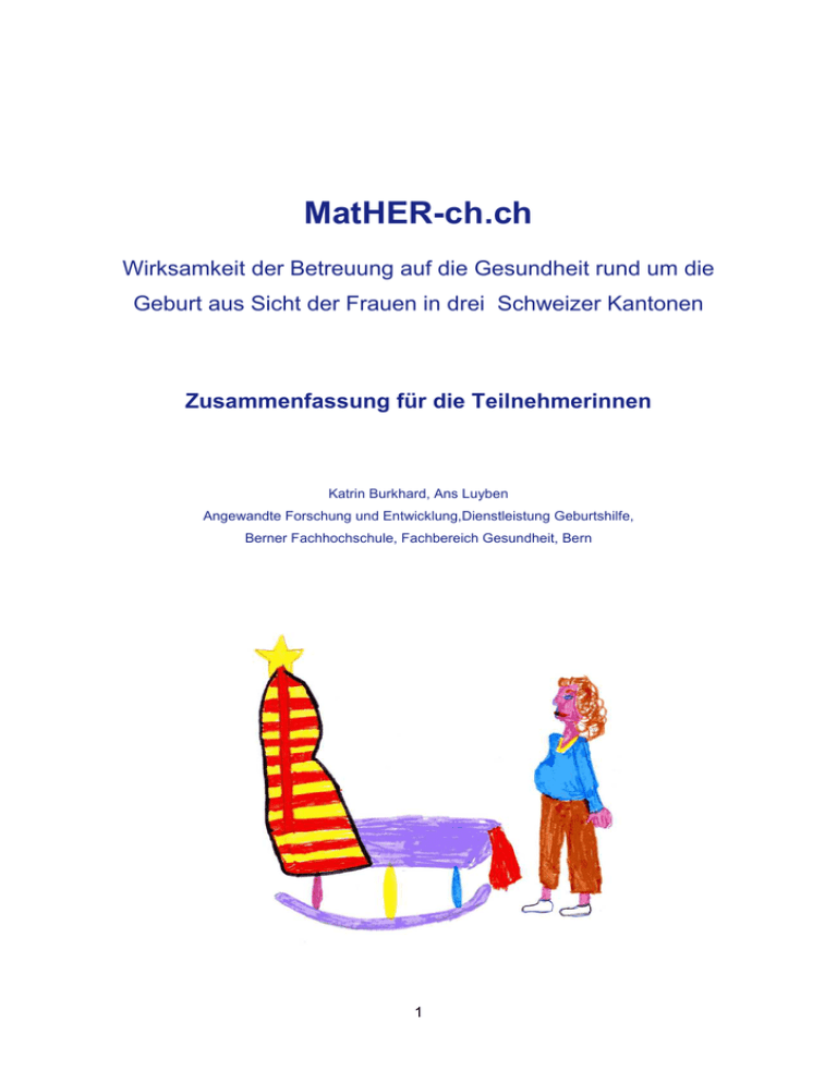 MatHER-ch.ch Wirksamkeit der Betreuung auf die Gesundheit rund um die Geburt aus Sicht der Frauen in drei Schweizer Kantonen Zusammenfassung für die Teilnehmerinnen Katrin Burkhard, Ans Luyben Angewandte Forschung und Entwicklung,Dienstleistung Geburtshilfe, Berner Fachhochschule, Fachbereich Gesundheit, Bern 1 Einleitung Die Qualität und Wirksamkeit der Betreuung rund um die Geburt hat sowohl kurzfristige, als auch langfristige Auswirkungen auf die Gesundheit von Frauen, Kindern und Familien. Sie ist somit essentiell für die Gesundheit von zukünftigen Generationen. Obwohl in der Schweiz medizinische und epidemiologische Daten erfasst werden, fehlen bis anhin Informationen aus Sicht der betroffenen Frauen. Das Ziel dieser Studie war es, ein Instrument zur Erhebung der Wirksamkeit der professionellen Betreuung und Qualität der Gesundheit während Schwangerschaft, Geburt und Wochenbett, aus Sicht der Klientinnen in der Schweiz, zu entwickeln. Diese Informationen sollen dabei helfen, die professionelle Betreuung rund um die Geburt zu verbessern. Die Studie Die Studie wurde in zwei Teilen durchgeführt. Im ersten Teil wurde der englischsprachige Fragebogen der Kanadischen Maternity Experiences Survey (http://www.statcan.gc.ca/imdbbmdi/5019-eng.htm) auf Deutsch übersetzt, angepasst und ergänzt. Im zweiten Teil wurde der entwickelte Fragebogen in einer Pilot-Studie bei Frauen 8 bis 12 Monate nach der Geburt in drei Schweizer Kantonen (Bern, Zug, Graubünden) getestet. Mittels Ausfüllen des Fragebogens und einem anschliessenden Interview wurden dabei auch die ersten Daten gesammelt. Insgesamt wurden 63 Fragebögen verschickt, von denen 61 retourniert wurden. Mit 59 Frauen wurde ein Interview geführt. Die Teilnehmerinnen Fast 82 Prozent der teilnehmenden Frauen waren Schweizerinnen; die anderen Frauen waren entweder Doppelbürgerinnen oder stammten aus verschiedenen europäischen Ländern. Alle Frauen sprachen deutsch und alle hatten einen Berufsschul- oder einen höheren Abschluss. Für rund 65 Prozent der Frauen betraf die Umfrage ihr erstes lebend geborenes Kind, für 25 Prozent ihr zweites und für rund 8 Prozent ihr drittes Kind. Sie waren bei der Geburt ihres Kindes zwischen 20 und 45 Jahre alt und lebten mehrheitlich in einer festen Partnerschaft. Alle Kinder waren Einlinge und sie wurden zwischen der 30. und 41. Schwangerschaftswoche geboren. Ungefähr die Hälfte der Kinder waren Mädchen. Schwangerschaft Schwangerschaft und Gesundheit Die Mehrheit der Frauen bemerkte ihre Schwangerschaft zwischen der 2. und 6. Woche; für die Hälfte der Frauen war dies der richtige Zeitpunkt. Als die Frauen erfuhren, dass sie schwanger waren, bezeichneten sie sich mehrheitlich als glücklich (87,6 Prozent). Die meisten Frauen (91,6 Prozent) wussten bereits vor der Schwangerschaft, dass die Einnahme von Folsäure Fehlbildungen verhindern kann. In den ersten drei Monaten der Schwangerschaft nahmen fast alle Frauen täglich ein Folsäurepräparat zu sich. Bei den meisten Frauen veränderte sich das Rauch- und Trinkverhalten während der Schwangerschaft. In den letzten drei Monaten vor der Schwangerschaft gab es 78,8Prozent Frauen, und in den letzten drei Monaten der Schwangerschaft sogar 91,7 Prozent, die nicht rauchten. Rund zwei Drittel der Frauen tranken während der Schwangerschaft gar keinen Alkohol und 31,1 Prozent tranken weniger als einmal im Monat. Schwangerschaftsbetreuung Der erste Besuch in der Schwangerenvorsorge fand im Durchschnitt in der 8. Schwangerschaftswoche statt. In der Regel waren die Frauen 8 bis 9 Mal in einer Schwangerschaftsvorsorgeuntersuchung. Ein Grossteil davon fand bei einem Geburtshelfer/ Gynäkologen statt. Viele Frauen sagten, dass sie zu ihrem Gynäkologen gingen, weil sie diesen schon 2 kannten und erwarteten von ihm vor allem fachliche Betreuung. Nur wenige gingen zu einer Hebamme (8,2 Prozent) oder zu einem Hausarzt (1,6 Prozent) und circa 10 Prozent der Frauen wurden gemeinsam von einem Arzt und einer Hebamme betreut. Mehrere Frauen wünschten sich eine kombinierte Betreuung. Die meisten Frauen konsultierten noch zwei bis drei weitere Fachpersonen, meistens waren dies Personen aus der Komplementärmedizin. Alle Frauen hatten Ultraschalluntersuchungen. Der erste Ultraschall fand meistens mit rund 8 bis 9 Wochen statt. In der Regel wurden 5 bis 6 Ultraschalluntersuchungen durchgeführt. Belastung und Unterstützung Insgesamt 54.1 Prozent der Frauen empfanden das Jahr vor der Geburt als eher bis sehr anstrengend. Meistens wurde ein Umzug oder eine Erkrankung einer nahe stehenden Person als belastendes Ereignis angegeben. Verschiedene Frauen erlebten bei der Arbeit Probleme, die mit der Schwangerschaft bzw. Mutterschaft in Beziehung standen. Viele erlebten auch die Schwangerschaft, am häufigsten aufgrund von Müdigkeit, Übelkeit und Wassereinlagerungen, als anstrengend. Viele Frauen bekamen während der Schwangerschaft meistens Unterstützung von Personen aus ihrem sozialen Umfeld. Rund 13 Prozent der Frauen erlebten wenig Unterstützung.Vier Frauen berichteten über Erfahrungen mit häuslicher Gewalt. Informationen Die teilnehmenden Frauen fanden, dass sie über die Themen in Bezug zu Schwangerschaft, Wehen und Geburt ausreichend informiert wurden. Am meisten wurden sie über körperliche Veränderungen, am wenigsten über den Gebrauch von Schmerzmitteln während Schwangerschaft und Geburt informiert. Sie erhielten aber auch rund 16 Prozent widersprüchliche Informationen, dies, weil in der Regel mehrere, unterschiedliche Quellen konsultiert wurden. Geburt Geburt und Geburtsort Rund zwei Drittel der Frauen hatten ihr Kind spontan geboren. 37,7 Prozent der Frauen hatten eine Kaiserschnittgeburt. 60 Prozent davon waren geplante Kaiserschnitte, meistens aus medizinischen Gründen, wie einer Beckenendlage oder wegen Schwangerschaftskomplikationen. Lediglich 8,2 Prozent gaben an, dass sie um einen Kaiserschnitt gebeten hatten. Alle Kinder wurden in einem öffent
