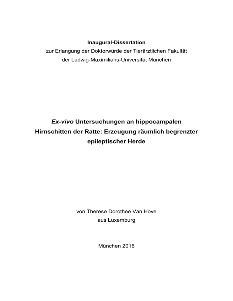 Inaugural-Dissertation zur Erlangung der Doktorwürde der Tierärztlichen Fakultät der Ludwig-Maximilians-Universität München Ex-vivo Untersuchungen an hippocampalen Hirnschitten der Ratte: Erzeugung räumlich begrenzter epileptischer Herde von Therese Dorothee Van Hove aus Luxemburg München 2016 Aus dem Veterinärwissenschaftlichen Department der Tierärztlichen Fakultät der Ludwig-Maximilians-Universität München Lehrstuhl für Pharmakologie, Toxikologie und Pharmazie Arbeit angefertigt unter der Leitung von Frau Prof. Dr. H. Potschka Angefertigt im Institut für Physiologie I der Medizinischen Fakultät der Westfälischen Wilhelms Universität Münster Mentor: Prof. Dr. E.-J. Speckmann Gedruckt mit Genehmigung der Tierärztlichen Fakultät der Ludwig-Maximilians-Universität München Dekan: Univ.-Prof. Dr. Joachim Braun Berichterstatter: Univ.-Prof. Dr. Heidrun Potschka Korreferent/en: Univ.-Prof. Dr. Kaspar Matiasek Tag der Promotion: 06. Februar 2016 Für meine Familie INHALTSVERZEICHNIS I. EINLEITUNG ............................................................................................... 1 II. LITERATURÜBERSICHT ............................................................................ 2 1. Definitionen, Prävalenz und Bedeutung der Epilepsie ............................................. 2 2. Klassifizierung ................................................................................................................. 3 3. Neuronale Informationsverarbeitung ........................................................................... 6 4. Hippocampus .................................................................................................................. 8 5. 6. III. 4.1. Anatomie und neuronale Verschaltung ............................................................... 8 4.2. Bedeutung des Hippocampus bei Epilepsien................................................... 10 Experimentelle Epilepsie-Modelle .............................................................................. 12 5.1. Allgemeines ........................................................................................................... 12 5.2. Wichtige In-vivo Modelle...................................................................................... 15 5.3. Wichtige Ex-vivo Modelle .................................................................................... 16 Zielsetzung und Wahl des Versuchsmodells ........................................................... 18 MATERIAL UND METHODEN ............................................................... 23 1. Gewebeschnitte ............................................................................................................ 23 2. Lösungen und Substanzen ......................................................................................... 26 3. 2.1. Badlösungen.......................................................................................................... 26 2.2. Penicillin-Natrium-Lösung ................................................................................... 26 Kammer zur Registrierung der bioelektrischen Aktivität in vitalen Hirnschnitten 27 4. Elektrophysiologische Verfahren zur Auslösung und Registrierung von Feldpotentialänderungen in Neuronenpopulationen ....................................................... 29 5. Optische Verfahren zur Registrierung von Membranpotentialänderungen in Neuronenpopulationen ........................................................................................................ 31 6. Versuchsanordnung zur Etablierung begrenzter epileptischer Herde.................. 36 7. Versuchsprotokoll ......................................................................................................... 40 8. Verfahren zur Auswertung und Darstellung der Messergebnisse......................... 44 9. Histologie ....................................................................................................................... 47 IV. ERGEBNISSE ........................................................................................ 48 1. Penicillin-induzierte Wirkung auf die Spontanaktivität der Nervenzellen im Hippocampus ........................................................................................................................ 49 1.1. Versuchsreihe 1: Penicillin-Anwendung in CA3 (n=5) .................................... 49 1.2. Versuchsreihe 2: Penicillin-Anwendung in CA1 (n=4) .................................... 53 2. Penicillin-induzierte Wirkung auf die reizausgelöste Aktivität der Nervenzellen im Hippocampus ........................................................................................................................ 56 INHALTSVERZEICHNIS 2.1. Versuchsreihe 1: Penicillin-Anwendung in CA3 (n=5) .................................... 56 2.2. Versuchsreihe 2: Penicillin-Anwendung in CA1 (n=4) .................................... 61 3. Penicillin-induzierte Wirkung auf die räumlich-zeitliche Synchronisierung der Nervenzellen im Hippocampus........................................................................................... 66 4. V. 3.1. Versuchsreihe 1: Penicillin-Anwendung in CA3 (n=5) .................................... 66 3.2. Versuchsreihe 2: Penicillin-Anwendung in CA1 (n=4) .................................... 72 Vergleich der Feldpotentiale und der Fluoreszenzsignale ..................................... 76 DISKUSSION ......................................................................................... 78 1. Zielsetzung .................................................................................................................... 78 2. Evaluation der Ergebnisse .......................................................................................... 79 3. Schlussfolgerung .......................................................................................................... 86 VI. ZUSAMMENFASSUNG ..................