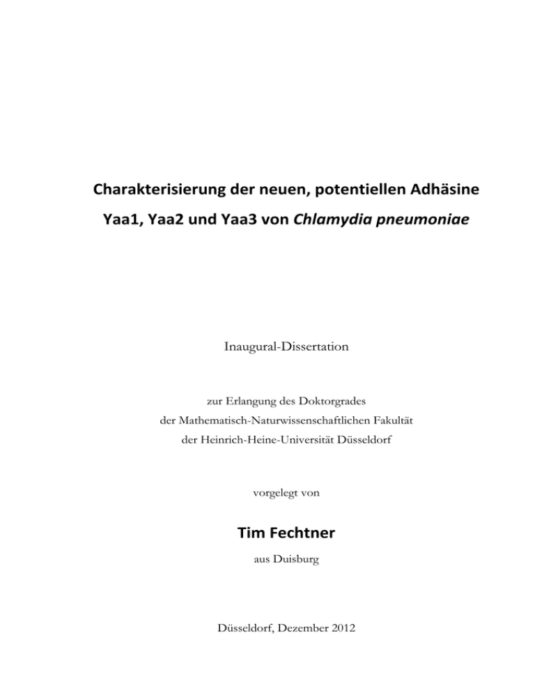 Charakterisierung der neuen, potentiellen Adhäsine Yaa1, Yaa2 und Yaa3 von Chlamydia pneumoniae Inaugural-Dissertation zur Erlangung des Doktorgrades der Mathematisch-Naturwissenschaftlichen Fakultät der Heinrich-Heine-Universität Düsseldorf vorgelegt von Tim Fechtner aus Duisburg Düsseldorf, Dezember 2012 aus dem Institut für Funktionelle Genomforschung der Mikroorgansimen der Heinrich-Heine-Universität Düsseldorf Gedruckt mit der Genehmigung der Mathematisch-Naturwissenschaftlichen Fakultät der Heinrich-Heine-Universität Düsseldorf Referent: Prof. Dr. Johannes H. Hegemann Korreferent: Prof. Dr. med. Klaus D. Pfeffer Tag der mündlichen Prüfung: 29.01.2013 Inhaltsverzeichnis iii Inhaltsverzeichnis Inhaltsverzeichnis .......................................................................................................... iii Abkürzungsverzeichnis .................................................................................................... x Zusammenfassung ........................................................................................................ xii Summary ..................................................................................................................... xiv 1 EINLEITUNG ........................................................................................................... 1 1.1 Chlamydien .......................................................................................................................... 1 1.1.1 Taxonomie ............................................................................................................................................1 1.1.2 Pathogenität ..........................................................................................................................................2 1.1.2.1 C. pneumoniae Infektionen ..........................................................................................................3 1.1.2.2 C. trachomatis Infektionen ..........................................................................................................4 1.1.3 1.2 Biologie der Chlamydien ....................................................................................................................5 1.1.3.1 Der chlamydiale Außenmembrankomplex (cOMC) ............................................................5 1.1.3.2 Der chlamydiale Entwicklungszyklus .....................................................................................6 Humane Endozytose ...........................................................................................................8 1.2.1 Lipid Rafts ............................................................................................................................................8 1.2.2 Clathrin-abhängige Endozytose ..................................................................................................... 10 1.2.3 Clathrin-unabhängige Endozytose ................................................................................................. 11 1.2.4 Ausnutzung der Endozytose durch Bakterien und Viren .......................................................... 12 1.2.5 Lipid Rafts und die Adhäsion und Internalisierung von Pathogenen ...................................... 13 1.3 Zelluläre Adhäsion und Invasion humanpathogener Bakterien........................................ 15 1.3.1 Bakterielle Adhäsine ......................................................................................................................... 15 1.3.2 Grundlegende Invasionsmechanismen ......................................................................................... 18 1.3.3 Invasionsstrategien humanpathogener Bakterien ........................................................................ 19 1.4 Adhäsion und Internalisierung bei Chlamydien ................................................................ 23 1.4.1 Kontaktaufnahme ............................................................................................................................. 24 1.4.2 Adhäsion ............................................................................................................................................ 27 1.4.3 Internalisierung ................................................................................................................................. 30 1.4.4 Identifizierung neuer, potentieller chlamydialer Adhäsine......................................................... 33 1.5 Zielsetzung ......................................................................................................................... 34 Inhaltsverzeichnis iv 2 MATERIAL ............................................................................................................ 35 2.1 Gebrauchsartikel ................................................................................................................ 35 2.2 Geräte und Maschinen ....................................................................................................... 35 2.3 Chemikalien ....................................................................................................................... 36 2.4 Agarosen/Sepharosen, Latexkügelchen und Färbemittel ................................................. 39 2.5 Enzyme .............................................................................................................................. 39 2.6 Puffer und Lösungen ......................................................................................................... 40 2.7 Antikörper .......................................................................................................................... 41 2.8 Kits ..................................................................................................................................... 42 2.9 Größenstandards ..................................................................................