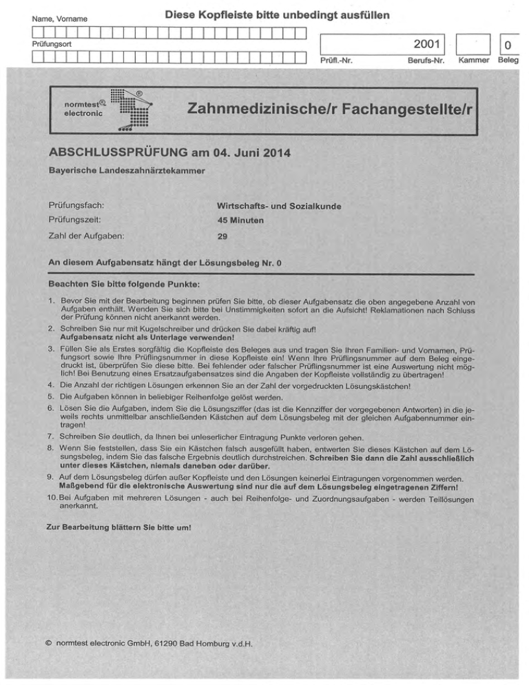 Diese Kopfleiste bitte unbedingt ausfüllen Name, Vorname Prüfungsort 2~0~ a Prüfl.-Nr. Berufs-Nr. Kammer R Q ~:tii~~~.~ normtest :;;_:.,. electronic ""S:tSi: . ..... . ..... ~ ..... Zahnmedizinische/r Fachangestellte/r ABSCHLUSSPRÜFUNG am 04. Juni 2014 Bayerische Landeszahnärztekammer Prüfungsfach: Wirtschafts- und Sozialkunde Prüfungszeit: 45 Minuten Zahl der Aufgaben: 29 An diesem Aufgabensatz hängt der Lösungsbeleg Nr. 0 Beachten Sie bitte folgende Punkte: 1. Bevor Sie mit der Bearbeitung beginnen prüfen Sie bitte, ob dieser Aufgabensatz die oben angegebene Anzahl von Aufgaben enthält. Wenden Sie sich bitte bei Unstimmigkeiten sofort an die Aufsicht! Reklamationen nach Schluss der Prüfung können nicht anerkannt werden. 2. Schreiben Sie nur mit Kugelschreiber und drücken Sie dabei kräftig auf! Aufgabensatr nicht als Unterlage verwenden! 3. Füllen Sie als Erstes sorgfältig die Kopfleiste des Beleges aus und tragen Sie Ihren Familien- und Vornamen, Prüfungsort sowie Ihre Prüflingsnummer in diese Kopfleiste ein! Wenn Ihre Prüflingsnummer auf dem Beleg eingedruckt ist, überprüfen Sie diese bitte. Bei fehlender oder falscher Prüflingsnummer ist eine Auswertung nicht möglich! Bei Benutzung eines Ersatzaufgabensatzes sind die Angaben der Kopfleiste vollständig zu übertragen! 4. Die Anzahl der richtigen Lösungen erkennen Sie an der Zahl der vorgedruckten Lösungskästchen! 5. Die Aufgaben können in beliebiger Reihenfolge gelöst werden. 6. Lösen Sie die Aufgaben, indem Sie die Lösungsziffer(das ist die Kennziffer der vorgegebenen Antworten) in die jeweils rechts unmittelbar anschließenden Kästchen auf dem Lösungsbeleg mit der gleichen Aufgabennummer eintragen! 7. Schreiben Sie deutlich, da Ihnen bei unleserlicher Eintragung Punkte verloren gehen. B. Wenn Sie feststellen, dass Sie ein Kästchen falsch ausgefüllt haben, entwerten Sie dieses Kästchen auf dem Lösungsbeleg, indem Sie das falsche Ergebnis deutlich durchstreichen. Schreiben Sie dann die Zahl ausschließlich unter dieses Kästchen, niemals daneben oder darüber. 9. Auf dem Lösungsbeleg dürfen außer Kopfleiste und den Lösungen keinerlei Eintragungen vorgenommen werden. Maßgebend für die elektronische Auswertung sind nur die auf dem Lösungsbeleg eingetragenen Ziffern! 10.Bei Aufgaben mit mehreren Lösungen -auch bei Reihenfolge- und Zuordnungsaufgaben -werden Teillösungen anerkannt. Zur Bearbeitung blättern Sie bitte um! O normtest electronic GmbH,61290 Bad Homburg v.d.H. Beleg Name Vorname Diese Kopfleiste bitte unbedingt ausfüllen Prüfungsort 200 Prüft:Nr. ~~ Q Berufs-Nr. Kammer Beleg Wutschafts- und Sozialkunde 1. Aufgabe Welche der folgenden Aussagen beschreibt das duale Ausbildungssystem am genauesten? Die Berufsausbildung wird durchgeführt ... 1. in Grund- und Fachstufe. 2. zwischen Ausbildenden und Auszubildenden. 3. in der Zahnarztpraxis und in der Berufsschule. 4. vom ZBV und von den Ausbildern. 5. in der Zahnarztpraxis und in überbetrieblichen Einrichtungen. ~. ' ❑ A e 2. Aufgabe Welche Aussage über das Ausbildungsverhältnis einer Zahnmedizinischen Fachangestellten ist richtig? 1. 2. 3. 4. Die Probezeit kann maximal 3 Monate betragen. Die Ausbildung erfolgt immer in zwei verschiedenen Ausbildungsbetrieben. Die Teilnahme an der Zwischenprüfung ist freiwillig. Während der Probezeit kann das Berufsausbildungsverhältnis nur mit Einhaltung einer Kündigungsfrist beendet werden. 5. Die Ausbildungsvergütung muss jährlich ansteigen. ' Aufg. ❑ ,z 3. Aufgabe Welche Aussage zur Kündigung des Berufsausbildungsverhältnisses ist richtig? 1. 2. 3. 4. 5. Nach Ablauf der Probezeit kann der Ausbildende das Ausbildungsverhältnis in keinem Fall mehr kündigen. Der Auszubildende kann auch nach Ablauf der Probezeit jederceit ohne Einhaltung einer Frist kündigen. Der Ausbildende kann dem Auszubildenden nur in den ersten vier Wochen der Probezeit kündigen. Nach Ablauf der Probezeit kann auch eine mündliche Kündigung vom Auszubildenden erfolgen. Nach Ablauf der Probezeit kann dem Auszubildenden nur aus einem wichtigen Grund fristlos gekündigt werden. A~9. ' 18 4.Aufgabe Eine 16-jährige Auszubildende zur ZFA hat im Rahmen ihres Ausbildungsverhältnisses eine Vielzahl von Pflichten zu erfüllen. Welche dieser Pflichten ist im Jugendarbeitsschutzgesetz geregelt? 1. 2. 3. 4. 5. Die Schweigepflicht Die Lernpflicht Die Pflicht zur Führung eines Berichtsheftes Die Pflicht zur Erst- und Nachuntersuchung Die Sorgfaltspflicht ' 5.Aufgabe Welche Aussage zum Jugendarbeitsschutzgesetz ist falsch? 1. 2. 3. 4. 5. Jugendliche dürfen grundsätzlich nicht mehr als 40 Stunden pro Woche arbeiten. Das Jugendarbeitsschutzgesetz gilt für alle Auszubildenden. Das Jugendarbeitsschutzgesetz wird vom Gewerbeaufsichtsamt überwacht. Ein Jugendlicher, der zu Beginn des Jahres noch nicht 16 Jahre alt ist, erhält mindestens 30 Werktage Urlaub. Jugendliche dürfen keine Akkordarbeit verrichten. 5 ' Bitte wenden! ~o Name Vorname Diese Kopfleiste bitte unbedingt ausfüllen Prüfungsort ZOO S Prüft.-Nr. Berufs-Nr. Kammer Beleg 6.Aufgabe Sie erarbeiten einen Tagesablaufplan für ihre minderjährige Auszubildende. Wie viele Minuten Ruhepause müssen Sie einplanen,. wenn diese Auszubildende 5 Stunden arbeitet? 1. 2. 3. 4. 5. 10 Minuten 15 Minuten 30 Minuten 45 Minuten 60 Minuten 6' ►ä 5 Aui 7. Aufgabe Wie viele Stunden darf ein Jugendlicher nach dem Jugendarbeitsschutzgesetz an einem Werktag höchstens arbeiten, wenn er dafür an einem anderen Werktag derselben Woche weniger als 8 Stunden arbeitet? 1. 8,5 Stunden 2. 9,0 Stunden 3. 9,5 Stunden 4. 10,0 Stunden 5. 10,5 Stunden ~, '❑ A +~ z. Aufg. 12 B.Aufgabe Eine Zahnmedizinische Fachangestellte wird während ihres Urlaubs 4 Tage krank. Welche Aussage ist in diesem Zusammenhang richtig? 1. Wenn sie die Krankheitstage durch ein ärztliches Attest nachweist, dann werden nur 3 Krankheitstage auf den Jahresurlaub angerechnet. 2. Die Krankheitstage werden ihrem Jahre