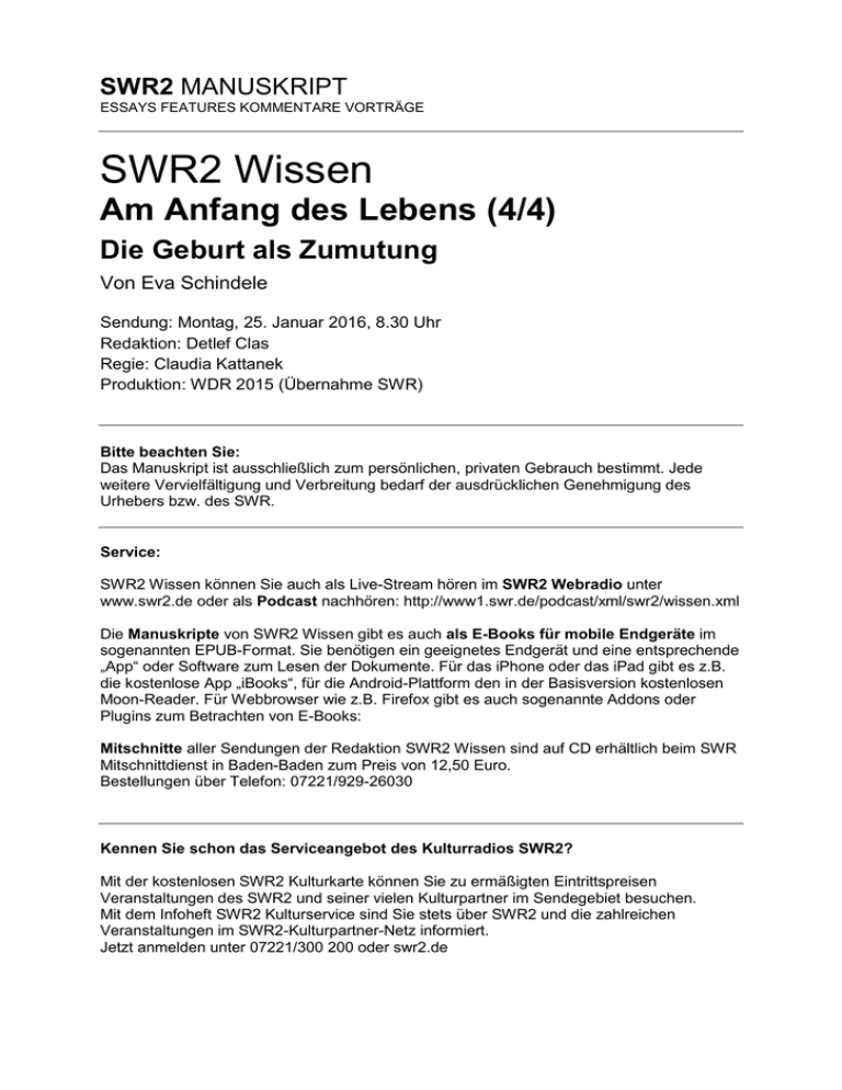 SWR2 MANUSKRIPT ESSAYS FEATURES KOMMENTARE VORTRÄGE SWR2 Wissen Am Anfang des Lebens (4/4) Die Geburt als Zumutung Von Eva Schindele Sendung: Montag, 25. Januar 2016, 8.30 Uhr Redaktion: Detlef Clas Regie: Claudia Kattanek Produktion: WDR 2015 (Übernahme SWR) Bitte beachten Sie: Das Manuskript ist ausschließlich zum persönlichen, privaten Gebrauch bestimmt. Jede weitere Vervielfältigung und Verbreitung bedarf der ausdrücklichen Genehmigung des Urhebers bzw. des SWR. Service: SWR2 Wissen können Sie auch als Live-Stream hören im SWR2 Webradio unter www.swr2.de oder als Podcast nachhören: http://www1.swr.de/podcast/xml/swr2/wissen.xml Die Manuskripte von SWR2 Wissen gibt es auch als E-Books für mobile Endgeräte im sogenannten EPUB-Format. Sie benötigen ein geeignetes Endgerät und eine entsprechende „App“ oder Software zum Lesen der Dokumente. Für das iPhone oder das iPad gibt es z.B. die kostenlose App „iBooks“, für die Android-Plattform den in der Basisversion kostenlosen Moon-Reader. Für Webbrowser wie z.B. Firefox gibt es auch sogenannte Addons oder Plugins zum Betrachten von E-Books: Mitschnitte aller Sendungen der Redaktion SWR2 Wissen sind auf CD erhältlich beim SWR Mitschnittdienst in Baden-Baden zum Preis von 12,50 Euro. Bestellungen über Telefon: 07221/929-26030 Kennen Sie schon das Serviceangebot des Kulturradios SWR2? Mit der kostenlosen SWR2 Kulturkarte können Sie zu ermäßigten Eintrittspreisen Veranstaltungen des SWR2 und seiner vielen Kulturpartner im Sendegebiet besuchen. Mit dem Infoheft SWR2 Kulturservice sind Sie stets über SWR2 und die zahlreichen Veranstaltungen im SWR2-Kulturpartner-Netz informiert. Jetzt anmelden unter 07221/300 200 oder swr2.de MANUSKRIPT Musik: Poppy Ackroyd – Feathers – Feathers O-Ton Schwarz: Wenn Sie als Hebamme Urlaub machen, dann sitzen sie im Hotel, neben völlig wildfremden Leuten und dann fragt man: „Was machen sie denn so?“ Und sobald das Wort Hebamme fällt, fangen sofort alle weiblichen Menschen am Tisch, egal welchen Lebensalters an, ihre Geburtsgeschichten zu erzählen. Sprecherin: Geburten sind existentielle Ereignisse. Sie schreiben sich ein in Körper und Seele von Müttern und Kindern. Musik: Poppy Ackroyd – Feathers – Feathers O-Ton C.: Ich habe sehr oft dann gehört: Hauptsache gesund, das Kind ist gesund und du bist gesund. Aber ich hätte mir natürlich auch gewünscht, dass ich die Möglichkeit habe auch zu sagen: Das was ich erlebt habe, war keine schöne Geburt. Es war alles für mich unerwartet und es war auch nicht erklärt und alles und ich fand das sehr brutal. Dann wird nachher so „Schwamm drüber“, und dann sagt man: Hauptsache gesund. Musik: John Zorn – Sign and Signature – The Gnostic Preludes Atmo: Herztöne im Mutterleib Ansage: Am Anfang des Lebens – Die Geburt als Zumutung Ein Feature von Eva Schindele Atmo: Kreißsaalrundgang / OP Jakubek: Eigentlich ist das Standard für ein Perinatal-Zentrum, dass der OP natürlich im Kreißsaal sein muss, weil wir so schnell wie möglich die Kinder rausholen müssen. Unser Ziel ist unter, im Notfall, unter 10 Minuten die Kinder draußen zu haben. Das schaffen wir auch zu 99,9 Prozent … Musik: Gustavo Santaolalla – Can light be found in the darkness? – 21 Grams Ost O-Ton C.: In diesen Tagen vor der Geburt, da wächst die Aufregung mit. Ab diesem 3. August sagen alle – na, wann ist es soweit, wann ist es so weit. Ich habe mich auf die Geburt gefreut und natürlich hat man auch Sorge, dass alles gut geht, weil man weiß: Es ist ja ein sehr wichtiger Augenblick, wo Leben und Tod auch ganz nah beieinander sind. Und wenn irgendwas nicht gut geht, dann weiß man nicht, trägt das Kind vielleicht Schäden davon? Sprecherin: C. war damals 33 und erwartete ihr erstes Kind. Die Schwangerschaft verlief gut. Ihr Kind wollte sie in einem Krankenhaus nicht weit von ihrer Wohnung auf die Welt bringen. 2 O-Ton C.: Dann war es tatsächlich so, dass 11 Tage nach dem errechneten Geburtstermin etwas Flüssigkeit kam. Und ich wusste auch nicht genau was es ist. Es war sehr, sehr heiß, es war Sommer. Und am nächsten Morgen bin ich ins Krankenhaus und dann hieß es, das Fruchtwasser sei grün und es müsse ganz schnell ein Kaiserschnitt gemacht werden. Sprecherin: Wenn das Fruchtwasser grün ist, heißt das noch lange nicht, dass das Kind im Bauch der Frau in akuter Not ist. Was sich auch hinterher bestätigte: Der kleine Junge kam putzmunter auf die Welt. O-Ton C.: Da fühlte ich mich total überrumpelt. Ich hatte ja keine Möglichkeit, diese Entscheidung infrage zu stellen. Und da habe ich dann dem zugestimmt, habe mich sehr ohnmächtig gefühlt. O-Ton Hellmers: Das hat natürlich auch mit dem Menschenbild zu tun. Habe ich die Einstellung zu sagen, diese Geburt im Leben einer Frau ist einzigartig? Auch wenn sie mehrere Geburten hat, ist jede wieder einzigartig. Sprecherin: Claudia Hellmers lehrt Hebammenwissenschaft an der Hochschule Osnabrück. O-Ton Hellmers: Und sie wird es in ihrer Biographie integrieren und sie wird im weiteren Leben das für sich verarbeiten müssen, und das hoffentlich als schönes Erlebnis verarbeiten können. Wenn ich diesen Anspruch habe, dann gehe ich anders mit Frauen um, dann lasse ich sie mit entscheiden, dann versuche ich sie kontinuierlich zu betreuen, dann schaue ich ganz genau, was hat sie für Bedürfnisse. Musik: Gustavo Santaolalla – Can light be found in the darkness? – 21 Grams Ost O-Ton C.: Was ich fast komisch fand war: Da wurde auf meinen Bauch gedrückt, und wo ich dachte, mein Kind ist wahrscheinlich das erste Kind, das geboren wird, wo ein Mann stöhnt: Uaah. Und wo ich dachte: Wie verkehrt ist das? Ich liege da – bin jenseits von allem durch diese Anästhesie, und dann drückt ein Mann ganz toll auf meinen Bauch und dann kommt mein Baby raus. O-Ton Hellmers: Oder habe ich eher eine technisierte Einstellung, wo es mir darum geht, vielleicht etwas salopp ausgedrückt, Hauptsache Mutter un
