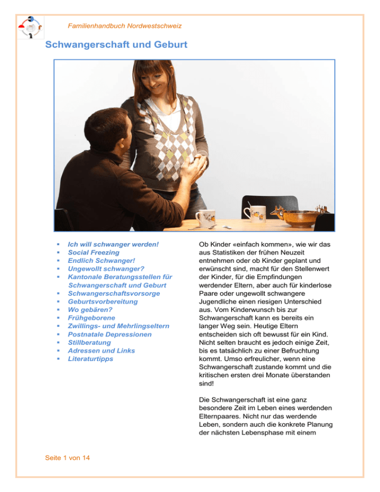 Familienhandbuch Nordwestschweiz Schwangerschaft und Geburt Ich will schwanger werden! Social Freezing Endlich Schwanger! Ungewollt schwanger? Kantonale Beratungsstellen für Schwangerschaft und Geburt Schwangerschaftsvorsorge Geburtsvorbereitung Wo gebären? Frühgeborene Zwillings- und Mehrlingseltern Postnatale Depressionen Stillberatung Adressen und Links Literaturtipps Ob Kinder «einfach kommen», wie wir das aus Statistiken der frühen Neuzeit entnehmen oder ob Kinder geplant und erwünscht sind, macht für den Stellenwert der Kinder, für die Empfindungen werdender Eltern, aber auch für kinderlose Paare oder ungewollt schwangere Jugendliche einen riesigen Unterschied aus. Vom Kinderwunsch bis zur Schwangerschaft kann es bereits ein langer Weg sein. Heutige Eltern entscheiden sich oft bewusst für ein Kind. Nicht selten braucht es jedoch einige Zeit, bis es tatsächlich zu einer Befruchtung kommt. Umso erfreulicher, wenn eine Schwangerschaft zustande kommt und die kritischen ersten drei Monate überstanden sind! Die Schwangerschaft ist eine ganz besondere Zeit im Leben eines werdenden Elternpaares. Nicht nur das werdende Leben, sondern auch die konkrete Planung der nächsten Lebensphase mit einem Seite 1 von 14 Familienhandbuch Nordwestschweiz neuen Familienmitglied stellt Ansprüche an die werdenden Eltern. Kaum jemand hat heute eine Geburt schon einmal bewusst im Familienkreis miterlebt, bevor er oder sie selbst Vater bzw. Mutter wird. Aus diesem Grund ist Beratung rund um Schwangerschaft, Geburt und Wochenbett viel wichtiger geworden als noch vor hundert Jahren. Es gilt, sowohl unbegründete Ängste als auch romantische Verklärungen auszuräumen. der Partner oder beide von Fruchtbarkeitsstörungen betroffen sind. Klären Sie als Frau und Mann Ihre Zeugungsfähigkeit bei einer spezialisierten medizinischen Stelle ab. Hilfreich in dieser nicht einfachen Situation ist es, eine psychologische Begleitung in Anspruch zu nehmen. Natürlich wirkt sich eine gesunde und stressfreie Lebensführung positiv auf die Wahrscheinlichkeit schwanger zu werden aus. Schliesslich ist das Baby geboren. Die Herausforderung wird konkret. Auch in dieser Phase gilt: Gute Information und Unterstützung aus dem Umfeld sowie von professioneller Seite erleichtern das Leben. Eines sollten Sie bei allem, was Sie lesen und hören, nicht vergessen: Vertrauen Sie auf Ihre eigenen Gefühle! Lesen Sie auch die Abschnitte «Pflegefamilie» und «Adoptivfamilie» im Kapitel «Vielfalt der Familien»! Ich will schwanger werden! Grundsätzlich kann eine Frau im Alter von etwa 15 bis 45 Jahren schwanger werden. Die Chancen einer tatsächlichen Schwangerschaft sind aber im Verlauf dieser «fruchtbaren Lebensphase» sehr unterschiedlich. Aus der Sicht der Biologie wird eine Frau im durchschnittlichen Alter von etwa 27 Jahren am leichtesten schwanger. Auch bei einem gesunden jungen Paar kann es einige Zeit dauern bis eine Schwangerschaft zustande kommt. Dies ist normal und kein Grund zur Panik. Hat sich nach einem Jahr keine Schwangerschaft eingestellt, so ist es empfehlenswert einen Arzt aufzusuchen. Es lässt sich nicht leugnen, dass sich die Chancen einer Schwangerschaft nach Erreichen des 40. Lebensjahrs verringern. Die gereiften Eizellen haben häufiger chromosomale Defekte, die Risiken wie Fehlgeburten und Geburtsschädigungen hervorrufen können. Sprechen Sie mit Ihrer Frauenärztin oder Ihrem Frauenarzt über den Kinderwunsch! Ein unerfüllter Kinderwunsch ist nicht selten. Ungefähr jede sechste Partnerschaft bleibt kinderlos, weil einer Seite 2 von 14 Was ist „Social Freezing“? „Social Freezing“ bezeichnet das vorsorgliche Einfrieren unbefruchteter Eizellen von Frauen, ohne medizinische Indikation. Mit Hilfe neuer Kryokonservierungstechniken ist es inzwischen möglich, Eizellen einzufrieren und diese zu einer beliebigen Zeit wieder aufzutauen. Dies gibt Frauen, die sich ihren Kinderwunsch aktuell nicht erfüllen können oder wollen (etwa weil ihnen der passende Partner dazu fehlt oder aus beruflichen Gründen), die Chance, ihr Kind zu einem späteren Zeitpunkt zu bekommen. Ursprünglich war die EizellenKonservierung für junge, an Krebs erkrankte Patientinnen gedacht, die sich einer Chemotherapie unterziehen mussten. In der Schweiz ist der Gesetzestext zum Einsatz von „Social Freezing“ nicht eindeutig, wird jedoch in der Regel dahingehend interpretiert, dass die Anwendung aus nicht medizinischen Gründen, etwa aus beruflichen Gründen, erlaubt ist,. Allerdings ist hierzulande die Lagerung der Eizellen auf fünf Jahre beschränkt. In bestimmten Fällen ist die Kyrokonservierung der Eizellen eine gute oder sogar notwendige Option, damit eine Frau Kinder haben kann. Die Behandlung zur Entnahme der Eizellen ist allerdings nicht ungefährlich. Zudem gehen mit einer Familienhandbuch Nordwestschweiz Schwangerschaft im fortgeschrittenen Alter auch grössere gesundheitliche Risiken einher, da diese bei Frauen über 55 bisher kaum erforscht sind. Sie werden jedoch von Medizinern als gravierend eingeschätzt. Endlich Schwanger! Sie sind schwanger? Herzlichen Glückwunsch! Eine einmalige Zeit beginnt. Nicht nur die Psyche und der Körper verändern sich, sondern das Leben der werdenden Eltern an sich. Eine Schwangerschaft wirft natürlich viele neue Fragen auf. Alle medizinischen Fragen zur Schwangerschaft kann der Arzt, die Ärztin oder die Hebamme bei den Vorsorgeuntersuchungen beantworten. Fragen, die sich auf die Geburt selbst beziehen, werden am besten an den Informationsveranstaltungen der Spitäler und/oder bei den Gebärzimmerbesichtigungen beantwortet. Im Internet finden sich zudem viele Foren und Webseiten auf denen sich werdende Eltern informieren und austauschen können. Eine Auswahl finden Sie in der Adress- und Linkliste am Ende dieses Kapitels. Ungewollt schwanger? Sie wissen nicht, ob Sie die Schwangerschaft weiterführen oder abbrechen wollen? Ein nicht einfacher Entscheid. Das Gesetz gibt Ihne