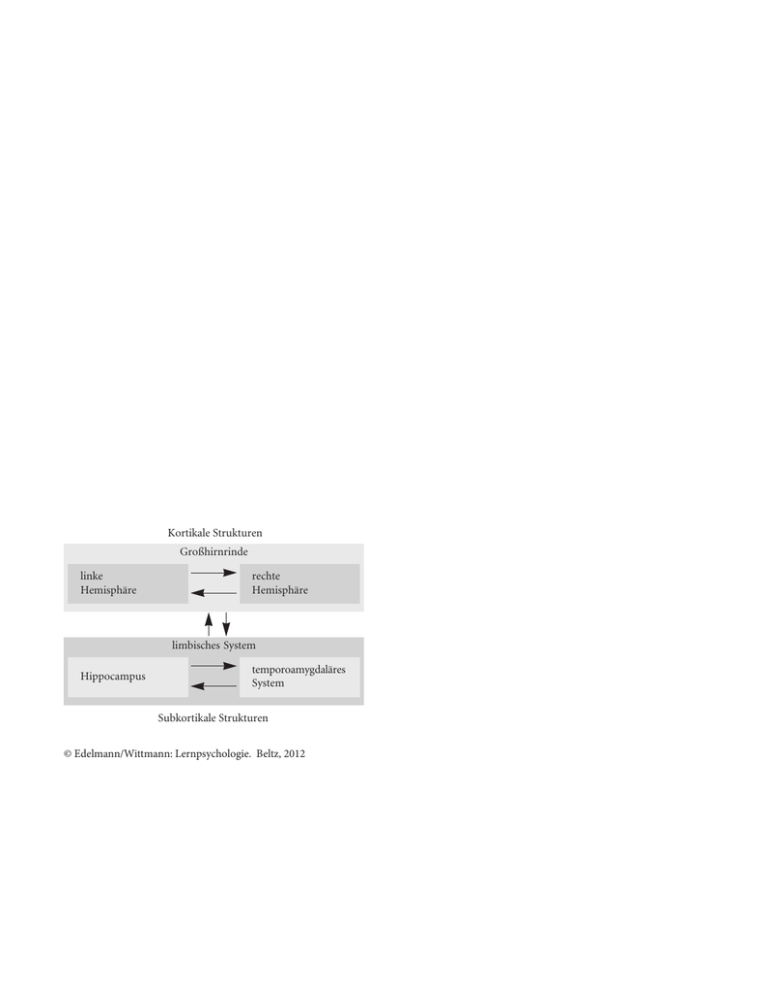 Kortikale Strukturen Großhirnrinde linke Hemisphäre rechte Hemisphäree limbisches System Hippocampus temporoamygdaläres System Subkortikale Strukturen © Edelmann/Wittmann: Lernpsychologie. Beltz, 2012