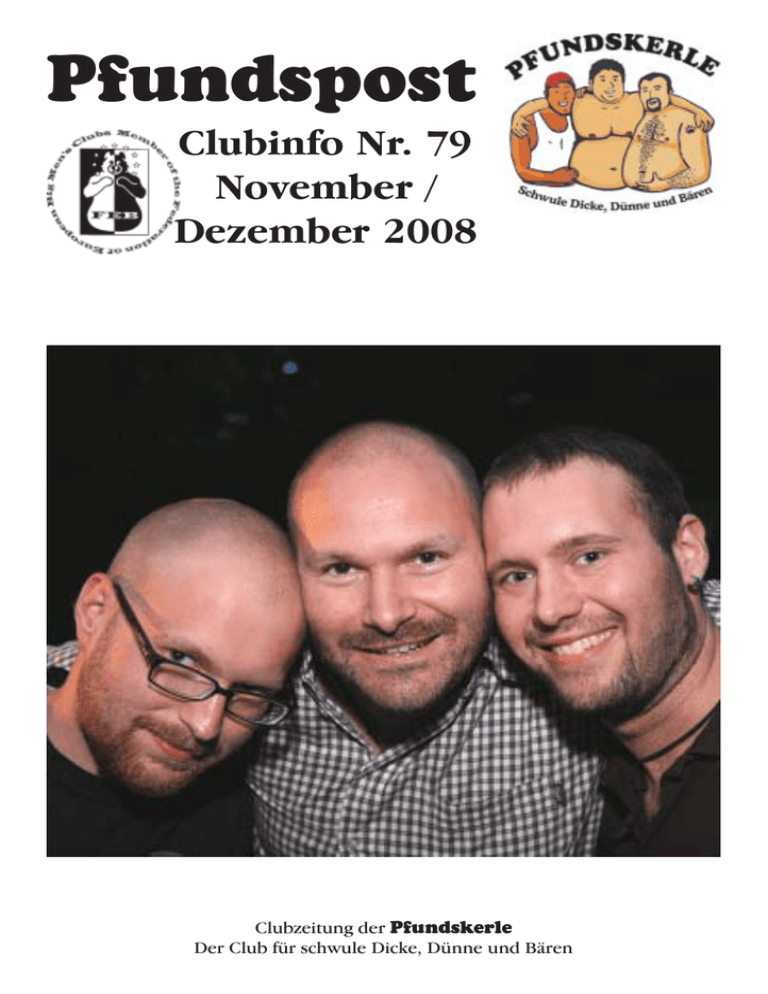 Pfundspost Clubinfo Nr. 79 November / Dezember 2008 Clubzeitung der Pfundskerle Der Club für schwule Dicke, Dünne und Bären Inhalt 3 Zuerst... 4 In eigener Sache 5 Welt-AIDS-Tag 8 Partys 9 Männeraquarium 10 Wo sonst noch was los ist Pfundspost Herausgeber: Pfundskerle c/o Frank Lohöfer Karl-Dillinger-Str. 135 67071 Ludwigshafen E-mail: info @ pfundskerle.de Net: http://www.pfundskerle.de/ Bank: Volksbank Rhein-Neckar, KTO 5350000, BLZ 670 900 00 IBAN: DE07 6709 0000 0005 3500 00 BIC: GEN0DE61MA2 Pfundspost ist das clubinterne Mitteilungsblatt der Pfundskerle. Es erscheint im zweimonatigen Rhythmus. Pfundspost ist kostenlos und für Mitglieder und Freunde des Clubs bestimmt. Sie darf nicht verkauft werden. Ein Bezug im Abonnement ist nicht möglich. Die Weitergabe an Jugendliche ist nicht gestattet. Die Auflage dieses Heftes beträgt 100 Stück und ist auch im Internet erhältlich. Die Veröffentlichung des Namens oder die Abbildung von Personen oder Organisationen in Beiträgen oder Anzeigen in diesem Heft ist kein Hinweis auf deren sexuelle Orientierung. Bei namentlich nicht gekennzeichneten Texten ist der Verfasser der Redaktion bekannt. Die Textbeiträge sind Meinungsäußerungen der Autoren; sie entsprechen nicht unbedingt der Ansicht der Redaktion. Die Redaktion behält sich vor, Beiträge zu kürzen oder redaktionell zu überarbeiten. Redaktionsschluss Nr. 80 : 4.01.2009 © Pfundskerle 2008 Bildnachweis: Titel: Pfundskerle 2 Zuerst... ... war es seit langem mal nötig, die Liste der Clubs am Ende des Heftes zu überarbeiten. Dabei musste ich feststellen, dass sich die Reihen der Clubs und ihrer Aktivitäten doch sehr stark gelichtet haben. Viele Clubs haben keine regelmäßigen Stammtische oder Treffen mehr. Andere haben unregelmäßige Veranstaltungen. Einige Clubseiten existieren noch, wurden aber seit 2005 nicht mehr aktualisiert. Das werte ich als Zeichen dafür, dass der Club eigentlich tot ist. Das ist natürlich sehr schade. Ziel der Clubs war und ist doch immer, Leute zusammenzubringen, um gemeinsam einen Teil der Freizeit zu verbringen. Wollen die Leute das nicht mehr? Einige Seiten nennen genau diesen Grund: Mangelnde Besucherzahlen, kein Interesse. Das Einzige, was noch geht, sind einzelne Partys, die einoder zweimal im Jahr stattfinden. Die Existenz eines Clubs ist auch sehr häufig abhängig davon, wie lange die Initiatoren die Lust behalten. Wenn der Elan nach Monaten oder Jahren schwindet, dann ist das auch das Ende, weil sich keiner findet, der den Club fortführen will. Den Mannheimer Bären schien dieses Schicksal zuteil zu werden. Aber im Oktober wurde das Treffen wiederbelebt. Ich freue mich, dass die Pfundskerle im 15. Jahr immer noch da sind! Und das ist natürlich auch ein Verdienst der Mitglieder und Freunde, die den Club durch die Besuche der Veranstaltungen unterstützen und am Leben erhalten. Danke an Euch alle!!! Eigentlich sollte diese Ausgabe der Pfundspost wieder Bilder vom jährlichen europäischen Treffen der Girth & Mirth-Bewegung, der EBMC in Brüssel, zeigen. Leider hat sich kein Fotograph gefunden. Und so kann ich hier keine Bilder abdrucken. Ob wir Bilder der Veranstaltung in der OnlineGalerie zeigen können, kann ich an dieser Stelle auch nicht versprechen. Die meisten Fotografen geben ihre „Schätze“ nur ungerne heraus, erst recht, wenn man sie für eine Veröffentlichung haben möchte. Das ist schade. Sind Bilder doch die einzigen „Beweise“ vom Spaß und dem Vergnügen, die eine Veranstaltung geboten haben. Und eine Werbung für die nächte Veranstaltung. Das Jahr neigt sich dem Ende zu. Darum möchte ich es nicht versäumen, auf unser Weihnachtstreffen hinzuweisen, das am 13. Dezember im Restaurant „Brauerei zum Stadtpark“ in Hockenheim stattfindet. Und wie in jedem Jahr möchte ich euch bitten, euch anzumelden, wenn ihr teilnehmen wollt. Die Konditionen sind die seit Jahren üblichen: Freunde und Gäste des Clubs zahlen 15 Euro für das Buffet, Mitglieder zahlen nichts für das Buffet, Getränke zahlt jeder selber. Und wie es inzwischen schon Tradition hat, treffen wir uns am Sonntag nach dem Weihnachtstreffen im Aquatoll in Neckasulm zum Relaxen, Schwitzen und Planschen. Näheres erfahrt ihr auch auf der Rückseite unseres kleinen Hefts. Für das neue Jahr wünsche ich allen jetzt schon mal an dieser Stelle alles Gute! Kommt gut rüber! In diesem Sinne, Euer 3 In eigener Sache Unsere Termine Sonntag, den 30.11.08 um 15:00 Uhr Saunatreffen in der „Clubsauna Amsterdam“ Samstag, den 10.1.09 um 14:00 Uhr Bowlen im Bowling Center Mannheim* um 17:00 Uhr Stammtisch im „Café Kußmann“ Samstag, den 13.12.08 um 16:00 Uhr Weihnachtstreffen Bowling Center Mannheim, Zum Herrenried 16, Mannheim * Ort und Zeit können wechseln!! in Hockenheim Infos siehe Rückseite! Café Kußmann, T6, 19, Mannheim Tel: 0621-3972979, www.cafe-kussmann.de Sonntag, den 28.12.08 um 15:00 Uhr Saunatreffen in der „Clubsauna Amsterdam“ Clubsauna Amsterdam, Waidmannstr. 31, Frankfurt www.clubsauna-amsterdam.de/ Wir wünschen unseren Mitgliedern alles Gute zum Geburtstag: Ralph F. Ralf S. Ansgar D. Detlef D. 08.11. 21.11. 13.12. 14.12. Jens O. 20.12. Reinhard S. 21.12. Andreas B. 26.12. Jürgen W. 06.01. Happy Birthday! Zum Welt-AIDS-Tag veranstaltet die „Ökumenische Arbeitsgruppe Homosexuelle und Kirche“ wieder einen Gottestdienst in Mannheim. Er findet am 1. Dezember 2008 (Montag) um 19:30 Uhr in der Citykirche Konkordien (in R2, beim Restaurant „Kurfürst“) statt. Das diesjährige Thema lautet: „TRAUM-TÄNZER“. 4 Welt-AIDS-Tag Am 1. Dezember ist wieder Welt-AIDSTag. Anlass genug also, einmal mehr auf diese Infektion hinzuweisen. Ein Sieg gegen das HIV-Virus ist nach wie vor nicht zu vermelden, auch wenn die Forschung weitergeht. Inzwischen ist aber nicht nur AIDS ein Thema. Andere Geschlechtskrankheiten holen auf. Zumindest gegen Hepatites und Syphilis kann man sich impfen lassen. Zahl der Neudiagnosen gestiegen Wer bereits an einer
