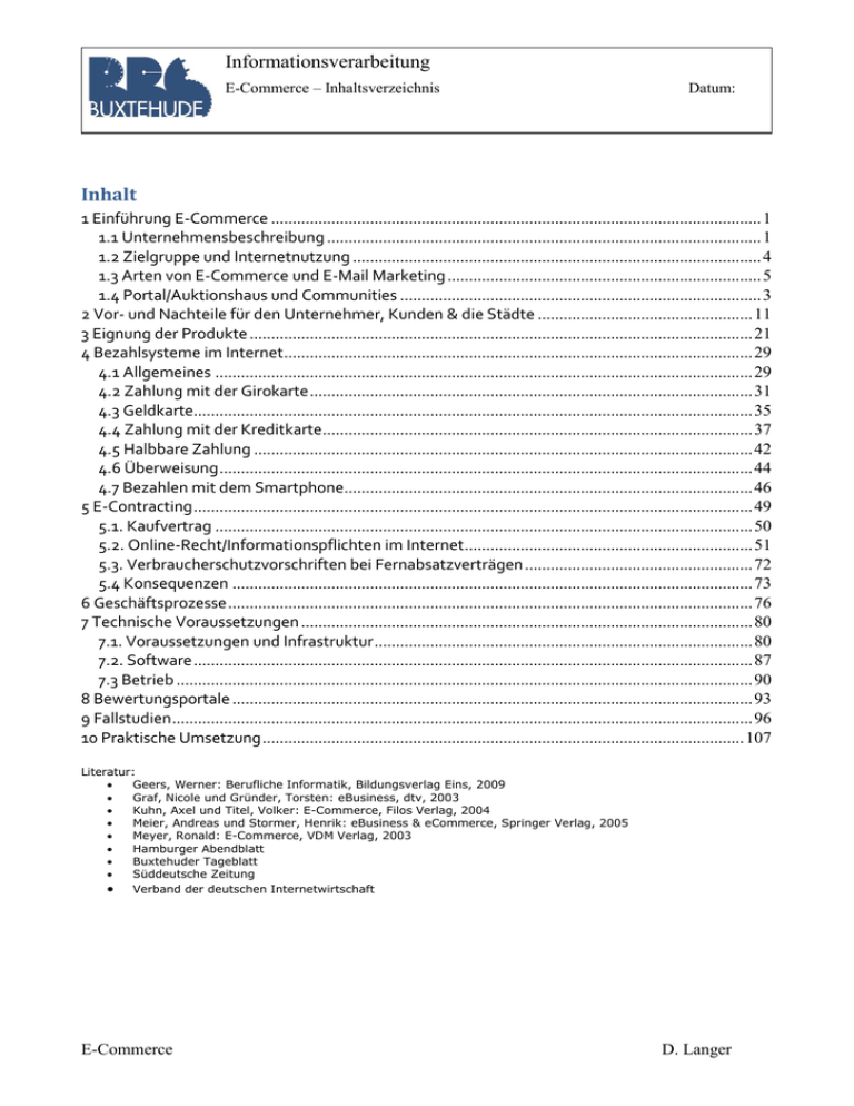 Informationsverarbeitung E-Commerce – Inhaltsverzeichnis Datum: Inhalt 1 Einführung E-Commerce .................................................................................................................. 1 1.1 Unternehmensbeschreibung ..................................................................................................... 1 1.2 Zielgruppe und Internetnutzung ............................................................................................... 4 1.3 Arten von E-Commerce und E-Mail Marketing ......................................................................... 5 1.4 Portal/Auktionshaus und Communities .................................................................................... 3 2 Vor- und Nachteile für den Unternehmer, Kunden & die Städte .................................................. 11 3 Eignung der Produkte ..................................................................................................................... 21 4 Bezahlsysteme im Internet ............................................................................................................. 29 4.1 Allgemeines ............................................................................................................................. 29 4.2 Zahlung mit der Girokarte ....................................................................................................... 31 4.3 Geldkarte.................................................................................................................................. 35 4.4 Zahlung mit der Kreditkarte .................................................................................................... 37 4.5 Halbbare Zahlung .................................................................................................................... 42 4.6 Überweisung ............................................................................................................................ 44 4.7 Bezahlen mit dem Smartphone............................................................................................... 46 5 E-Contracting .................................................................................................................................. 49 5.1. Kaufvertrag ............................................................................................................................. 50 5.2. Online-Recht/Informationspflichten im Internet ................................................................... 51 5.3. Verbraucherschutzvorschriften bei Fernabsatzverträgen ..................................................... 72 5.4 Konsequenzen ......................................................................................................................... 73 6 Geschäftsprozesse .......................................................................................................................... 76 7 Technische Voraussetzungen ......................................................................................................... 80 7.1. Voraussetzungen und Infrastruktur ........................................................................................ 80 7.2. Software .................................................................................................................................. 87 7.3 Betrieb ...................................................................................................................................... 90 8 Bewertungsportale ......................................................................................................................... 93 9 Fallstudien ....................................................................................................................................... 96 10 Praktische Umsetzung ................................................................................................................ 107 Literatur: Geers, Werner: Berufliche Informatik, Bildungsverlag Eins, 2009 Graf, Nicole und Gründer, Torsten: eBusiness, dtv, 2003 Kuhn, Axel und Titel, Volker: E-Commerce, Filos Verlag, 2004 Meier, Andreas und Stormer, Henrik: eBusiness & eCommerce, Springer Verlag, 2005 Meyer, Ronald: E-Commerce, VDM Verlag, 2003 Hamburger Abendblatt Buxtehuder Tageblatt Süddeutsche Zeitung Verband der deutschen Internetwirtschaft E-Commerce D. Langer Informationsverarbeitung E-Commerce – Einführung Datum: 1 Einführung E-Commerce 1.1 Unternehmensbeschreibung Situation: Sie sind Mitarbeiter in einer Softwareberatungsgesellschaft. Ein Kunde, der sein Geschäft bisher ohne PC bewältigt hat, möchte nun seine gesamte Geschäftsabwicklung über EDV ablaufen lassen. Sie haben den Kunden bereits erfolgreich bei der Umsetzung seiner geschäftlichen Tätigkeit mithilfe einer Datenbank unterstützt. Jetzt hat er ein weiteres Anliegen an Ihre Softwareberatungsgesellschaft. Sein Unternehmen ist erfolgreich und ermöchte nun einen Web-Shop eröffnen. Bei dem ersten Beratungsgespräch mit dem Kunden haben Sie sich darauf geeinigt, sich zuerst einmal mit der Thematik genauer zu beschaffen und den Kunden periodenweise über den Entwicklungszustand zu informieren. Aus Ihrer vorhergehenden Zusammenarbeit mit dem Unternehmen kennen Sie bereits die Daten des Unternehmens. Folgende Daten des Unternehmens liegen Ihnen vor: Name: Fahr-Rad GmbH Bei einem derartig großen Projekt beginnt die Arbeit einer Unternehmensberatung mit der Analyse des Unternehmens. Deshalb teilt der Kunde Ihnen folgende Daten des Unternehmens mit: Name: Sylt Bike GmbH Sitz des Unternehmens: Keitumer Landstr. 12-14, Westerland auf Sylt Zweck: Fahrradverleih, Fahrradverkauf und Fahrradreparatur, Verkauf von Ersatzteilen und Fahrradequipment Gründung: Inhaber (Geschäftsführer): Mitarbeiter: Jahresumsatz: 2004 Daniel Quast 6 im Verkauf (Vermietung, Verkauf) 8 im Service (Reparatur) 500.000,00 € Fahrradverleih: Sylt Bike - das sind Räder, die speziell für hohe Ansprüche an
