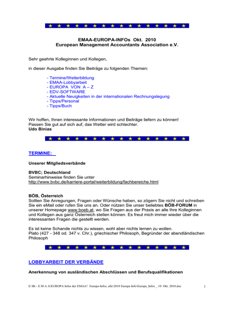 EMAA-EUROPA-INFOs Okt. 2010 European Management Accountants Association e.V. Sehr geehrte Kolleginnen und Kollegen, in dieser Ausgabe finden Sie Beiträge zu folgenden Themen: - Termine/Weiterbildung - EMAA-Lobbyarbeit - EUROPA VON A – Z - EDV-SOFTWARE - Aktuelle Neuigkeiten in der internationalen Rechnungslegung - Tipps/Personal - Tipps/Buch Wir hoffen, Ihnen interessante Informationen und Beiträge liefern zu können! Passen Sie gut auf sich auf, das Wetter wird schlechter. Udo Binias TERMINE: Unserer Mitgliedsverbände BVBC; Deutschland Seminarhinweise finden Sie unter http://www.bvbc.de/karriere-portal/weiterbildung/fachbereiche.html BÖB, Österreich Sollten Sie Anregungen, Fragen oder Wünsche haben, so zögern Sie nicht und schreiben Sie ein eMail oder rufen Sie uns an. Oder nützen Sie unser beliebtes BÖB-FORUM in unserer Homepage www.boeb.at, wo Sie Fragen aus der Praxis an alle Ihre Kolleginnen und Kollegen aus ganz Österreich stellen können. Es freut mich immer wieder über die interessanten Fragen die gestellt werden. Es ist keine Schande nichts zu wissen, wohl aber nichts lernen zu wollen. Plato (427 - 348 od. 347 v. Chr.), griechischer Philosoph, Begründer der abendländischen Philosoph LOBBYARBEIT DER VERBÄNDE Anerkennung von ausländischen Abschlüssen und Berufsqualifikationen E:\Bi - E M A A\EUROPA Infos der EMAA\' Europa-Infos, alle\2010 Europa Info\Europa_Infos _ 10 Okt. 2010.doc 1 Seit 1995 kämpft die EMAA um eine verbesserte und vor allem schnellere Anerkennung von ausländischen Abschlüssen. Nun ist es wohl endlich soweit, denn die deutsche Politik hat eine geradezu rasante Kehrtwende zu Gunsten von hunderttausenden Migranten vollzogen. Durch eine bessere Anerkennung von Berufsabschlüssen soll diesen Personen zu neuen Jobs verholfen werden. Natürlich steckt da viel Eigennutz dahinter. Die deutsche Volkswirtschaft kann sich auf bis zu 300.000 neue Fachkräfte freuen", sagte Bildungsministerin Annette Schavan (CDU) auf einer Pressekonferenz in der letzten Woche. Denn die Zahl der Migranten, deren Qualifikation in Deutschland mangels Anerkennung ungenutzt bleibt wird auf eben 300.000 geschätzt. " Dieses Potenzial soll nun genutzt werden. Zu diesem Personenkreis werden auch die vielen Buchhalter gehören, die in ihrem Heimatland eine entsprechende Prüfung abgelegt haben und Zeugnisse darüber vorweisen können. Schavan kündigte an, ein Gesetzentwurf aus ihrem Haus gebe jedem mit einer im Ausland erworbenen Ausbildung einen Anspruch darauf, seine Qualifikationen in Deutschland bewerten zu lassen. Die dafür zuständigen Kammern oder Behörden müssten die Anträge innerhalb von drei Monaten bearbeiten. Das von ihrem Haus dazu geplante Gesetz soll bald in Kraft treten. Die Regierung wird sich im Koalitionsausschuss am 18. November mit dem Fachkräftemangel befassen, erklärte dazu Regierungssprecher Steffen Seibert. Die EMAA wird dieses Thema intensiv weiter verfolgen und im Europa Info hierzu berichten sowie notwendige Unterstützung geben. Controlling-Ehrenpreis 2011 der BVBC-Stiftung Die BVBC-Stiftung zur Förderung von Rechnungswesen und Controlling treuhänderische gemeinnützige und mildtätige Stiftung verleiht auf dem BVBCKongress 2011 in Berlin einen Ehrenpreis für eine herausragende wissenschaftliche Arbeit aus dem Bereich des Controlling. Der Controlling-Ehrenpreis 2011 der BVBC-Stiftung sei, so berichtete die Treuhänderin der Stiftung Christel Fries, mit freundlicher Unterstützung der Verlage Beck und Vahlen mit einem Ehrenbetrag in Höhe von 650 Euro und einem zusätzlichen Buchpreis dotiert. Der Preisträgerin/Preisträger wird zudem eine Ehrenurkunde überreicht werden. Der Preisträger wird von den Mitgliedern der Fachjury der BVBC-Stiftung nach deren freiem Ermessen ausgewählt. Die von der BVBC-Stiftung ernannten Mitglieder der Fachjury sind: Renate Adler, BVBC Vizepräsidentin, Prof. Dr. Klaus Hahn, Prof. Dr. Klaus Deimel, Dr. Klaus Fiedler und Dr. K. Jan Schiffer. Hiermit ruft die BVBC-Stiftung durch ihre Treuhänderin, zur Einreichung preiswürdiger Arbeiten auf. Eingereicht werden können in 2010 und 2011 in Fachzeitschriften, Internetportalen oder Fachbüchern veröffentlichte Fachaufsätze und Fachbücher, die ein Thema aus dem Bereich Controlling wissenschaftlich behandeln. Bei den Fachbüchern kann es sich auch um eine in 2010 oder 2011 veröffentlichte Neuauflage handeln. Die entsprechenden Beiträge und Bücher sind in zweifacher Ausfertigung einzusenden an den Vorsitzenden der Fachjury, der auch für etwaige Rückfragen zur Verfügung steht: Herrn Rechtsanwalt Dr. K. Jan Schiffer c/o SP§P SCHIFFER & PARTNER Atriumhaus Mainzer Str. 47 D-53179 Bonn Einsendeschluss ist der 31.01.2011. Projekt im Studienschwerpunkt Projektmanagement und Controlling E:\Bi - E M A A\EUROPA Infos der EMAA\' Europa-Infos, alle\2010 Europa Info\Europa_Infos _ 10 Okt. 2010.doc 2 Professor Dr. Siegfried Seibert von der Hochschule Darmstadt berichtet zum Stand des Projektcontrolling in Theorie und Praxis (Projekt im SS 2010): Der Anteil der Projektarbeit an der betrieblichen und an der gesamtwirtschaftlichen Wertschöpfung ist während der letzten Jahre stark gestiegen. Nach einer aktuellen Untersuchung werden in Deutschland bereits mehr als ein Drittel aller Aufgaben von abteilungsübergreifenden Projektteams bearbeitet. Dieser hohe Anteil der Projektarbeit erfordert in immer stärkerem Umfang auch ein entsprechende betriebswirtschaftliche Planung, Überwachung und Steuerung. Allerdings ist das dazu erforderliche Projektcontrolling gegenüber den Aufgabengebieten Projektmanagement und Unternehmenscontrolling in Theorie und Praxis eher noch unterentwickelt. Im vorliegenden Projekt wurde dazu ein Überblick über den Stand des Projektcontrolling erarbeitet, der folgende Teilfragen umfasste: 1. Arbeitsmarkt: In welchem Umfang werden Stellen speziell für ProjektcontrollingFunktionen ausgeschrieben? In welchen betrieblichen Bereichen und in welchen Wirtsch