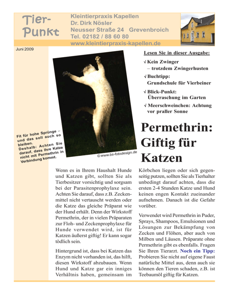 TierPunkt Kleintierpraxis Kapellen Dr. Dirk Nösler Neusser Straße 24 Grevenbroich Tel. 02182 / 88 60 80 www.kleintierpraxis-kapellen.de Juni 2009 Lesen Sie in dieser Ausgabe: √ Kein Zwinger – trotzdem Zwingerhusten √ Buchtipp: Grundschule für Vierbeiner nge – e Sprü h o h r ch so Fit fü soll au s a d und . Sie bleiben A c h t e n tze : b l a h Des re Ka dass Ih hrin in darauf, Permet it m t mt. nich ung kom Verbind .de -fotodesign © www.bs Wenn es in Ihrem Haushalt Hunde und Katzen gibt, sollten Sie als Tierbesitzer vorsichtig und sorgsam bei der Parasitenprophylaxe sein. Achten Sie darauf, dass z.B. Zeckenmittel nicht vertauscht werden oder die Katze das gleiche Präparat wie der Hund erhält. Denn der Wirkstoff Permethrin, der in vielen Präparaten zur Floh- und Zeckenprophylaxe für Hunde verwendet wird, ist für Katzen äußerst giftig! Er kann sogar tödlich sein. Hintergrund ist, dass bei Katzen das Enzym nicht vorhanden ist, das hilft, diesen Wirkstoff abzubauen. Wenn Hund und Katze gar ein inniges Verhältnis haben, gemeinsam im √ Blick-Punkt: Überraschung im Garten √ Meerschweinchen: Achtung vor praller Sonne Permethrin: Giftig für Katzen Körbchen liegen oder sich gegenseitig putzen, sollten Sie als Tierhalter unbedingt darauf achten, dass die ersten 2-4 Stunden Katze und Hund keinen engen Kontakt zueinander aufnehmen. Danach ist die Gefahr vorüber. Verwendet wird Permethrin in Puder, Sprays, Shampoos, Emulsionen und Lösungen zur Bekämpfung von Zecken und Flöhen, aber auch von Milben und Läusen. Präparate ohne Permethrin gibt es ebenfalls. Fragen Sie Ihren Tierarzt. Noch ein Tipp: Probieren Sie nicht auf eigene Faust natürliche Mittel aus, denn auch sie können den Tieren schaden, z.B. ist Teebaumöl giftig für Katzen. Kein Zwinger – trotzdem Zwingerhusten „Da ist es wieder!“ Die zehnjährige Laura ist ganz aufgeregt, denn ihre geliebte Schäferhündin Meike hustet in einer Tour. Es klingt heiser und ist wie ein Hustenanfall. Was kann das nur sein? oder in Tierpensionen, kann eine Ansteckung schnell erfolgen. Deshalb empfehlen Tierärzte je nach Lebenssituation des Hundes eine Impfung gegen Zwingerhusten. Erkrankung kann lebensgefährlich sein Zu den Erregern gehören eine ganze Reihe von Viren und Bakterien (z.B. Parainfluenzavirus oder Bakterium bronchiseptica), die eine Infektion der oberen Atemwege hervorrufen. Umweltfaktoren wie Stress, zu niedrige oder hohe Temperaturen können dazu beitragen, dass der Hund erkrankt. „Infektiöse Tracheobronchitis oder auch Zwingerhusten genannt“, diagnostiziert die Tierärztin. „Aber Meike lebt doch gar nicht im Zwinger, sondern bei uns im Haus!?“ Der Name ist irreführend, dennoch kann jeder Hund betroffen sein. Die Bezeichnung rührt daher, dass die Ansteckungsgefahr im Zwinger, wo sich mehrere Hunde aufhalten, besonders groß ist. Da die Übertragung durch Tröpfcheninfektion (Husten, Niesen, Beschnuppern) erfolgt, ist der Zwingerhusten unter Hunden äußerst ansteckend. Für den Menschen besteht keine Gefahr. Gerade an Orten, wo viele Hunde zusammenkommen, z.B. in Hundeschulen, auf Ausstellungen Ein direktes Heilmittel gibt es nicht. Bei Schäferhündin Meike setzt die Tierärztin Antibiotika und Hustenmittel ein, um die Anfälle zu kontrollieren. Bei dem Vierbeiner ist die Erkrankung dann nach einigen Wochen vergessen. Aber besonders bei älteren, sehr jungen oder geschwächten Tieren kann der Zwingerhusten lebensgefährlich werden, beispielsweise wenn sich im Anschluss eine Lungenentzündung entwickelt. Fragen Sie in Ihrer Tierarztpraxis, ob eine Impfung im individuellen Fall Ihres Vierbeiners sinnvoll ist oder nicht. Als allgemeine Prophylaxe gilt: Ausgewogene Ernährung und viel Bewegung an der frischen Luft, damit das Immunsystem gestärkt ist. Buchtipp: Grundschule für Vierbeiner „Mein Hund hört!“ lautet das Ziel. Mehr noch. Der Hund soll Spaß am Lernen und Erlernten haben und die Übungen mit Freude, Motivation und wachsender Sicherheit absolvieren. Ein „braver Hund“, der mit Druck, Strafen und Zwang erzogen wird, wird sich nichts mehr zutrauen, seinen Menschen nie vertrauen und womöglich durch Stress Verhaltensprobleme entwickeln. Deshalb ist Motivation und Geduld gefragt. Praxisnah und verständlich erklärt die Tierärztin und Verhaltensexpertin Karina Mahnke, wie Lernziele, z.B. Leinenführigkeit, Fuß, Sitz, Platz, Steh, aber auch der sichere Rückruf richtig zu üben sind. Jede Übung soll dazu beitragen, dass Mensch und Tier ein gutes Team werden. Kluge Tipps für Kinder mit anschaulichen Bildern enthält die Lektüre ebenfalls. „Grundschule für Hunde“ ist eine gute Basis, um mit seinem Vierbeiner entspannt den Alltag zu meistern. Buchtipp des Monats: Grundschule für Hunde von Karina Mahnke Eugen Ulmer Verlag, 7,90 Euro ISBN 978-3-80015445-6 Blick-Punkt: Überraschung im Garten Wenn ich ein Mensch wäre, hätte ich an diesem Tag bestimmt ein breites Grinsen im Gesicht: Ich schaue in den Garten und entdecke ein komisches Szenario. Was ist das? Die Menschen in meinem Garten kenne ich, aber was um Himmels Willen treiben sie da? Mit Spaten, Harke und Eimern sind sie voller Tatkraft im Erdreich zugange. Feuchte glänzende Gesichter haben Herrchen, Frauchen, meine Katzensitterin Lisa und ihr Mann Roland, als sie umgraben, Löcher buddeln, Pflanzen hineinsetzen und literweise Wasser anschleppen. Stundenlang im Garten buddeln – warum tun Menschen so etwas? Zwar haben sie mit den unnützen Pflanzen die meiste Arbeit, aber die „Katzen-Projekte“ sind sehenswert: duftige Kräuter, eine Tonröhre und ein Naturkratzbaum! Ich muss mich selber loben: Gut, dass Menschen an mich denken, so haben sie manchmal ganz nützliche Ideen . . . Kater Elvis beobachtet seine Menschen im Garten. Meerschweinchen: Achtung vor praller Sonne Da Meerschweinchen ursprünglich aus den Anden, dem Hochgebirge Südamerikas stammen, sind sie die kühleren Temperaturen gewohnt. Doch wenn es in un