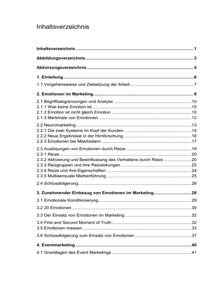 Inhaltsverzeichnis Inhaltsverzeichnis ............................................................................................... 1 Abbildungsverzeichnis ....................................................................................... 3 Abkürzungsverzeichnis ...................................................................................... 5 1. Einleitung ......................................................................................................... 6 1.1 Vorgehensweise und Zielsetzung der Arbeit ................................................... 7 2. Emotionen im Marketing................................................................................. 9 2.1 Begriffsabgrenzungen und Analyse .............................................................. 10 2.1.1 Was keine Emotion ist ................................................................................ 10 2.1.2 Emotion ist nicht gleich Emotion ................................................................ 10 2.1.3 Merkmale von Emotionen........................................................................... 12 2.2 Neuromarketing............................................................................................. 13 2.2.1 Die zwei Systeme im Kopf der Kunden ...................................................... 14 2.2.2 Neue Ergebnisse in der Hirnforschung....................................................... 16 2.2.3 Emotionen bei Mitarbeitern ........................................................................ 17 2.3 Auslösungen von Emotionen durch Reize .................................................... 19 2.3.1 Reize .......................................................................................................... 20 2.3.2 Aktivierung und Beeinflussung des Verhaltens durch Reize ...................... 20 2.3.3 Reizgruppen und ihre Reizwirkungen ........................................................ 22 2.3.4 Reize und ihre Eigenschaften .................................................................... 24 2.3.5 Multisensuale Markenführung .................................................................... 25 2.4 Schlussfolgerung ........................................................................................... 26 3. Zunehmender Einbezug von Emotionen im Marketing .............................. 28 3.1 Emotionale Konditionierung .......................................................................... 29 3.2 20 Emotionen ................................................................................................ 30 3.3 Der Einsatz von Emotionen im Marketing ..................................................... 32 3.4 First and Second Moment of Truth ................................................................ 32 3.5 Emotionen messen ....................................................................................... 33 3.6 Schlussfolgerung zum Einsatz von Emotionen ............................................. 37 4. Eventmarketing ............................................................................................. 40 4.1 Grundlagen des Event Marketings ................................................................ 41 2 4.1.1 Konstitutive Merkmale des Event-Marketing .............................................. 42 4.1.2 Abgrenzung von Eventmarketing und Erlebnismarketing ........................... 44 4.1.3 Positionierung des Eventmarketings .......................................................... 47 4.1.4 Formen des Event-Marketings ................................................................... 48 4.2 Gute Gründe für Event-Marketing ................................................................. 50 4.2.1 Involvement ................................................................................................ 50 4.2.2 Erlebniswelt ................................................................................................ 55 4.3 Einordnung und Einsatz des Instrumentes Event-Marketing ......................... 56 4.3.1 Event Marketing als “Sub-Instrument” ........................................................ 57 4.3.2 Event-Marketing als “Partial-Instrument” .................................................... 58 4.3.3 „Integriertes Event-Konzept“ als zentraler Bestandteil einer erlebnisorientierten Marketing-Strategie ............................................................. 59 4.4 Schlussfolgerung ........................................................................................... 62 5. Implikation von Emotionen im Eventmarketing ......................................... 64 5.1 Emotionale Konditionierung durch Event-Marketing ..................................... 65 5.2 Art der Emotionen ......................................................................................... 66 5.3 First and Second Moment of Truth ................................................................ 67 5.4 Emotionale Beeinflussung nach zwei Funktionsweisen ................................ 68 5.5 Schlussfolgerungen ....................................................................................... 69 6. Fazit ............................................................................................................. 71 6.1 Ergebnisse der Arbeit .................................................................................... 71 6.2 Zukunftsausblick ........................................................................................... 77 Literatur ............................................................................................................. 81 Selbstständigkeitserklärung ............................................................................ 85 Abbildungsverzeichnis 3 Abbildungsverzeichnis Abbildung 1: Evers, Anke 2011 in Anlehnung an Kranz, Marcel: „Was Liebe, Freude und Angst wirklich bewirken“, Absatzwirtschaft – Zeitschrift für Marketing, 6/2005 Abbildung 2: Evers, An
