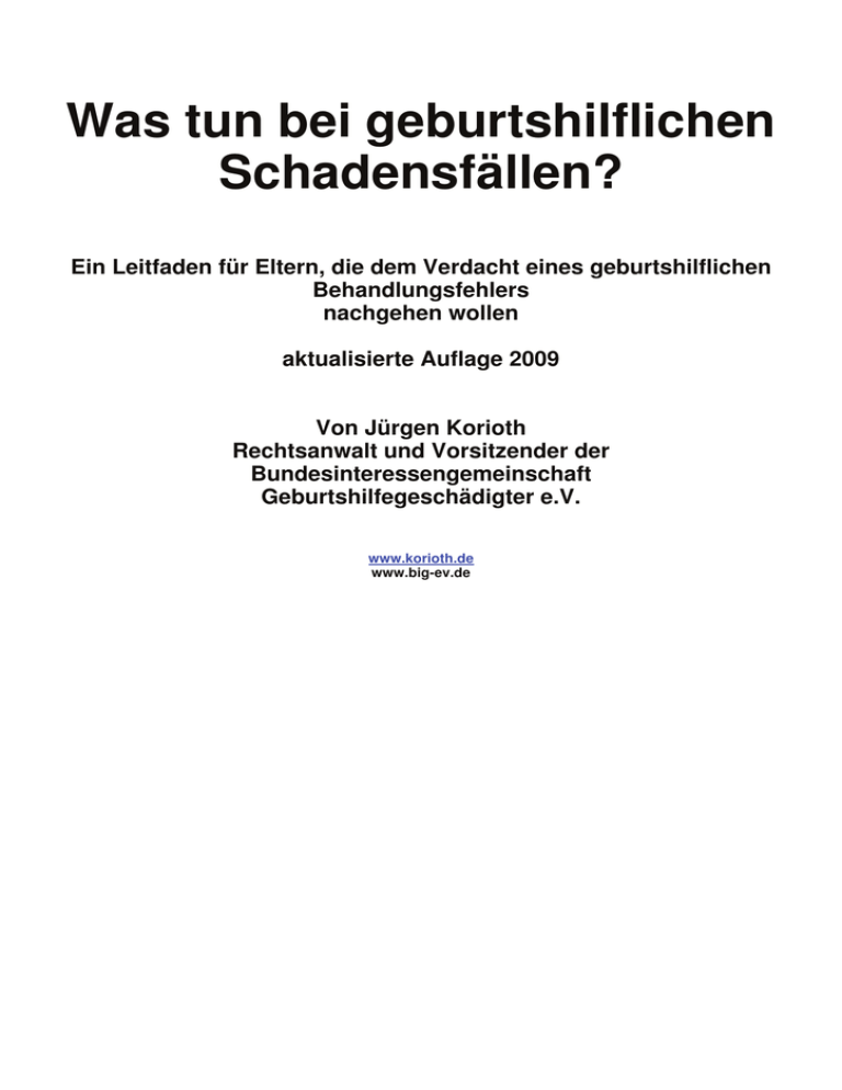 Was tun bei geburtshilflichen Schadensfällen? Ein Leitfaden für Eltern, die dem Verdacht eines geburtshilflichen Behandlungsfehlers nachgehen wollen aktualisierte Auflage 2009 Von Jürgen Korioth Rechtsanwalt und Vorsitzender der Bundesinteressengemeinschaft Geburtshilfegeschädigter e.V. www.korioth.de www.big-ev.de Inhaltsverzeichnis: Einleitung 5 I. Die außergerichtliche Interessenwahrnehmung 6 1. 1.1. 1.2. 1.3. Tatsachensicherung Gedächtnisprotokoll Sichern von Zeugenaussagen Sichern von Urkunden 6 7 7 8 2. 2.1. 2.2. 2.3. 2.4. Verjährungsfristen nach der Neuregelung ab dem 1.Januar 2002 Deliktische Ansprüche Altfälle Vertragliche Ansprüche Verfahren vor den Schlichtungsstellen und/oder Gutachterkommissionen 8 8 9 11 12 3. 3.1. 3.2. 3.3. 3.4. 3.5. 3.6. 3.7. Einsichtnahme in die Krankenunterlagen Das Recht auf Einsichtnahme Einsichtnahme in die Originale Übersendung von Kopien gegen angemessene Kostenerstattung Relevante Bestandteile der Krankenunterlagen Weitere notwendige Unterlagen in geburtshilflichen Schadensfällen Die Auskunftsklage Empfehlungen der DGGG zur Dokumentation 12 12 13 13 13 13 14 14 4. 4.1. 4.2. 4.3. 4.4. 4.5. Möglichkeiten der Feststellung geburtshilflicher Behandlungsfehler Auswertung der Krankenunterlagen durch die BIG Zusammenarbeit mit Krankenversicherern Gutachter- und Schlichtungsstellen Benennung und Einholung von Privatgutachten Beauftragung spezialisierte Anwälte 16 16 16 17 18 18 II. Geburtshilfliche Komplikationstypen 19 1. 1.1. 1.2. 1.3. 1.4. 1.5. 1.6. 1.7. Komplikationen in der Schwangerschaft Wachstumsretardierung EPH-Gestose, Hellp-Syndrom Gestationsdiabetes Vorzeitiger Blasensprung Frühgeburtsbestrebungen Übertragung Mehrlinge 19 19 20 22 23 25 26 26 2. 2.1. 2.2. 2.3. 2.4. 2,5. 2.6. 2.7. Komplikationen unter der Geburt Schulterdystokie Beckenendlagengeburt Vaginal-operative Entbindungen Abdominale Schnittentbindung (Sectio) Uterusruptur Komplikationen bei Frühgeburt Mehrlinge 26 26 32 38 41 43 43 45 III. Aufklärung und Einwilligung 45 IV. Behandlungsfehler, Kausalität und Beweislast 51 V. Die Schadenspositionen im Einzelnen 54 1. Der Schmerzensgeldanspruch 54 2 1.1. 1.2. 1.3. Schmerzensgeld bei schwerer Hirnschädigung und zu erwartender langer Überlebenszeit des Kindes 55 Schmerzensgeld bei kurzer Überlebenszeit 59 Eigenes Schmerzensgeld der Eltern bei alsbaldigem Tod des Kindes 62 VI. Der behinderungsbedingte Mehraufwand 64 1. 1.1. 1.2. 1.3. 1.4. Personeller Mehrbedarf Abgrenzung Vermögens-Nichtvermögensschaden Abzug für das fiktiv gesunde Kind (Ohnehinabzug) Marktgerechte Vergütung Abzug der Leistungen Dritter 64 65 66 67 67 2. 2.1. 2.2. 2.3. Der sachliche Mehraufwand Das behindertengerechte KFZ Das behindertengerechte Wohnen Ersatz von Fremdpflegekosten 67 67 68 69 3. Behindertenwerkstatt 69 4. Der Erwerbsschaden des geburtsgeschädigten Kindes 70 5. Der Verdienstentgang der Eltern bei Pflege des Kindes 70 6. Schadensrechtliche Gestaltungsmöglichkeiten 71 VII. Sozialrechtliche Aspekte 72 VIII. Wrongful life 81 IX. Steuerliche Auswirkungen von Schadensersatzleistungen bei Verletzung von Körper und Gesundheit 85 X. Anhang: Rechtsprechungsbeispiele 87 3 4 Einleitung Die Geltendmachung geburtshilflicher Schadensfälle nimmt mittlerweile im Schadensrecht der allgemeinen Arzthaftung einen dominanten Platz ein. Die Schadenssummen erreichen im Bereich des Schmerzensgeldes mittlerweile eine halbe Million Euro und darüber. Der materielle Schaden ist häufig noch weitaus höher. So sind nicht nur die Pflegeleistungen, die zumindest bei Kindern von den Eltern oder Angehörigen geleistet werden, zu ersetzen, sondern auch einzelne Positionen, wie behindertengerechtes Bauen und entsprechende Kfz-Kosten. Wenn Fremdpflege in Anspruch genommen wird, muss der Schädiger dieses Brutto ersetzen, ebenso den später anfallenden Verdienstausfallschaden des Kindes. Alles, was aufgrund einer schuldhaft verursachten Behinderung an Vermögensschaden entsteht, ist zu ersetzen. Darüber hinaus regressieren Leistungserbringer (z.B. Krankenund Pflegekasse) aufgrund übergegangenen Rechts. Das gesamte Schadensvolumen erreicht bei Schwerstschäden nicht selten fünf Millionen Euro und darüber. Es nimmt deshalb nicht Wunder, dass die Haftpflichtversicherer der Behandlungsseite alles versuchen, um Schadensersatzforderungen abzuwehren oder die Regulierung zu verschleppen. Sehr genaue Kenntnisse der medizinischen und juristischen Haftungsvoraussetzungen sind deshalb unabdingbar, um diese komplexen Sachverhalte kompetent zu beurteilen und haftungsrechtlich zum Erfolg zu führen. Dieser kleine Band soll Eltern und deren Berater in die Lage versetzen, den medizinisch-juristischen Sachverhalt in geburtshilflichen Schadensfällen und die Problemkreise „drumherum“ zu verstehen, damit sich zum medizinischen Schaden nicht noch Fehler bei der Durchsetzung von Schadensersatzansprüchen hinzugesellen. Die Mitarbeiter der Bundesinteressengemeinschaft, und auch der Verfasser dieses Heftes, sind jederzeit für spezielle Fragen ansprechbar. Weitere Informationen von Interesse sind auf den angegebenen Webseiten abrufbar. 5 I. Die außergerichtliche Interessenwahrnehmung In geburtshilflichen Schadensfällen haben Mutter und Kind gegenüber den Behandlern und dem Krankenhaus einen Anspruch auf bestmögliche Behandlung ent-sprechend den Regeln der ärztlichen Kunst. Geschuldet wird ein sorgfältiges kunstgerechtes Bemühen um einen Heilerfolg unter Berücksichtigung der anerkannten Regeln der medizinischen Wissenschaft. Dieser geschuldete ärztliche Standard ist gleichzusetzen mit der objektiv zu beurteilenden erforderlichen Sorgfalt, deren Unterschreiten zur Haftung führt, wenn der konkrete Gesundheitsschaden darauf beruht. Wir sprechen dann von einem ärztlichen Behandlungsfehler. Bei der Beurteilung des Sorgfaltsmaßstabes kommt es auf den Zeitpunkt der Behandlung und der faktischen Erreichbarkeit an, wobei in der Regel der sogenannte Facharztstandard geschuldet wird.