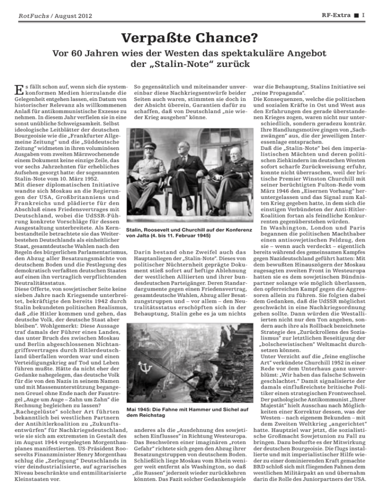 RF-Extra ■ I RotFuchs / August 2012 Verpaßte Chance? Vor 60 Jahren wies der Westen das spektakuläre Angebot der „Stalin-Note“ zurück E s fällt schon auf, wenn sich die system- So gegensätzlich und miteinander unver- war die Behauptung, Stalins Initiative sei konformen Medien hierzulande die einbar diese Nachkriegsentwürfe beider „reine Propaganda“. Gelegenheit entgehen lassen, ein Datum von Seiten auch waren, stimmten sie doch in Die Konsequenzen, welche die politischen historischer Relevanz als willkommenen der Absicht überein, Garantien dafür zu und sozialen Kräfte in Ost und West aus Anlaß für antikommunistische Exzesse zu schaffen, daß von Deutschland „nie wie- den Erfahrungen des gerade überstandenen Krieges zogen, waren nicht nur unternehmen. In diesem Jahr verfielen sie in eine der Krieg ausgehen“ könne. schiedlich, sondern geradezu konträr. sonst unübliche Schweigsamkeit. Selbst Ihre Handlungsmotive gingen von „Sachideologische Leitblätter der deutschen zwängen“ aus, die der jeweiligen InterBourgeoisie wie die „Frankfurter Allgeessenlage entsprachen. meine Zeitung“ und die „Süddeutsche Daß die „Stalin-Note“ bei den imperiaZeitung“ widmeten in ihren voluminösen listischen Mächten und deren politiAusgaben vom zweiten Märzwochenende schen Ziehkindern im deutschen Westen einem Dokument keine einzige Zeile, das sofort scharfe Zurückweisung erfuhr, vor sechs Jahrzehnten für erhebliches konnte nicht überraschen, weil der briAufsehen gesorgt hatte: der sogenannten tische Premier Winston Churchill mit Stalin-Note vom 10. März 1952. seiner berüchtigten Fulton-Rede vom Mit dieser diplomatischen Initiative März 1946 den „Eisernen Vorhang“ herwandte sich Moskau an die Regierungen der USA, Großbritanniens und untergelassen und das Signal zum Kalten Krieg gegeben hatte, in dem sich die Frankreichs und plädierte für den einstigen Verbündeten der Anti-HitlerAbschluß eines Friedensvertrages mit Koalition fortan als feindliche KonkurDeutschland, wobei die UdSSR-Führenten gegenüberstehen würden. rung konkrete Vorschläge für dessen Ausgestaltung unterbreitete. Als Kern- Stalin, Roosevelt und Churchill auf der Konferenz In Washington, London und Paris begannen die politischen Machthaber bestandteile betrachtete sie das Weiter- von Jalta (4. bis 11. Februar 1945) einen antisowjetischen Feldzug, den bestehen Deutschlands als einheitlicher sie – wenn auch verdeckt – eigentlich Staat, gesamtdeutsche Wahlen nach den Regeln des bürgerlichen Parlamentarismus, Darin bestand ohne Zweifel auch das bereits während des gemeinsamen Kampfes den Abzug aller Besatzungsmächte von Hauptanliegen der „Stalin-Note“. Dieses von gegen Nazideutschland geführt hatten: Mit deutschem Boden und die Festlegung des politischer Nüchternheit geprägte Doku- dem bewußten Hinauszögern der Moskau demokratisch verfaßten deutschen Staates ment stieß sofort auf heftige Ablehnung zugesagten zweiten Front in Westeuropa auf einen ihn vertraglich verpflichtenden der westlichen Alliierten und ihrer bun- hatten sie es dem sowjetischen Bündnisdesdeutschen Parteigänger. Deren Standar- partner solange wie möglich überlassen, Neutralitätsstatus. Diese Offerte, von sowjetischer Seite keine dargumente gegen einen Friedensvertrag, den opferreichen Kampf gegen die Aggressieben Jahre nach Kriegsende unterbrei- gesamtdeutsche Wahlen, Abzug aller Besat- soren allein zu führen. Sie folgten dabei tet, bekräftigte den bereits 1942 durch zungstruppen und – vor allem – den Neu- dem Gedanken, daß die UdSSR möglichst Stalin bekundeten politischen Realismus, tralitätsstatus erschöpften sich in der geschwächt in eine Nachkriegsordnung daß „die Hitler kommen und gehen, das Behauptung, Stalin gehe es ja um nichts gehen sollte. Dann würden die Westalliierten nicht nur den Ton angeben, sondeutsche Volk, der deutsche Staat aber dern auch ihre als Rollback bezeichnete bleiben“. Wohlgemerkt: Diese Aussage Strategie des „Zurückrollens des Soziatraf damals der Führer eines Landes, das unter Bruch des zwischen Moskau lismus“ zur letztlichen Beseitigung der „bolschewistischen“ Weltmacht durchund Berlin abgeschlossenen Nichtansetzen können. griffsvertrages durch HitlerdeutschUnter Verzicht auf die „feine englische land überfallen worden war und einen Art“ verkündete Churchill 1952 in einer Verteidigungskrieg auf Tod und Leben Rede vor dem Unterhaus ganz unverführen mußte. Hätte da nicht eher der blümt: „Wir haben das falsche Schwein Gedanke nahegelegen, das deutsche Volk geschlachtet.“ Damit signalisierte der für die von den Nazis in seinem Namen damals einflußreichste britische Poliund mit Massenunterstützung begangetiker einen strategischen Frontwechsel. nen Greuel ohne Ende nach der FaustreDer pathologische Antikommunist „Ihrer gel „Auge um Auge – Zahn um Zahn“ die Majestät“ hielt Ausschau nach MöglichRechnung begleichen zu lassen? „Rachegelüste“ solcher Art führten Mai 1945: Die Fahne mit Hammer und Sichel auf keiten einer Korrektur dessen, was der dem Reichstag bekanntlich bei westlichen Partnern Westen – nach eigenem Bekunden – mit dem Zweiten Weltkrieg „angerichtet“ der Antihitlerkoalition zu „Zukunftsentwürfen“ für Nachkriegsdeutschland, anderes als die „Ausdehnung des sowjeti- hatte. Hauptziel war jetzt, die sozialistiwie sie sich am extremsten in Gestalt des schen Einflusses“ in Richtung Westeuropa. sche Großmacht Sowjetunion zu Fall zu im August 1944 vorgelegten Morgenthau- Das Beschwören einer imaginären „roten bringen. Dazu bedurfte es der Mitwirkung planes manifestierten. US-Präsident Roo- Gefahr“ richtete sich gegen den Abzug ihrer der deutschen Bourgeoisie. Die flugs instalsevelts Finanzminister Henry Morgenthau Besatzungstruppen von deutschem Boden. lierte und mit imperialistischer Hilfe wieschlug die „Zerlegung“ Deutschlands in Schließlich liege Moskau vom Rhein weni- der 