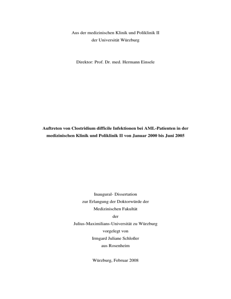 Aus der medizinischen Klinik und Poliklinik II der Universität Würzburg Direktor: Prof. Dr. med. Hermann Einsele Auftreten von Clostridium difficile Infektionen bei AML-Patienten in der medizinischen Klinik und Poliklinik II von Januar 2000 bis Juni 2005 Inaugural- Dissertation zur Erlangung der Doktorwürde der Medizinischen Fakultät der Julius-Maximilians-Universität zu Würzburg vorgelegt von Irmgard Juliane Schloßer aus Rosenheim Würzburg, Februar 2008 Referentin: Priv.–Doz. Dr. med. D. Krämer Koreferent: Prof. Dr. med. D. Drenckhahn Dekan: Prof. Dr. med. M. Frosch Tag der mündlichen Prüfung: 16. Juli 2008 Die Promovendin ist Ärztin Meiner Familie Inhaltsverzeichnis 1.Einleitung ..................................................................................................................... 1 1.1 Akute myeloische Leukämie ............................................................................... 1 1.1.1 Definition....................................................................................................... 1 1.1.2 Epidemiologie ............................................................................................... 2 1.1.3 Ätiologie......................................................................................................... 3 1.1.4 Pathogenese................................................................................................... 3 1.1.5 Klassifikation ................................................................................................ 4 1.1.6 Anamnese und klinische Symptomatik ...................................................... 6 1.1.7 Diagnostik ..................................................................................................... 8 1.1.8 Prognostische Faktoren ............................................................................... 8 1.1.9 Therapie ........................................................................................................ 9 1.2. Clostridium difficile .......................................................................................... 14 1.2.1 Definition.................................................................................................... 14 1.2.2 Vorkommen ................................................................................................ 14 1.2.3 Infektionsweg und Pathogenese ................................................................ 15 1.2.4 Klinik .......................................................................................................... 16 1.2.5 Diagnostik ................................................................................................... 18 1.2.6 Therapie ..................................................................................................... 18 1.2.7 Prävention und Prophylaxe....................................................................... 19 1.3 Fragestellung ...................................................................................................... 20 2.Patienten und Methoden ........................................................................................... 21 2.1 Patienten ............................................................................................................. 21 2.2 verwendete Chemotherapieschemata............................................................... 21 2.3 Nachweis von Clostridium difficile................................................................... 30 2.4 Bei Clostridium difficile Infektion angewendete Hygienemaßnahmen ....... 32 2.5 Antibiotikagabe bei Infektion ........................................................................... 33 2.6 Datenverarbeitung ............................................................................................ 33 3. Ergebnisse ................................................................................................................. 34 3.1 Vorkommen von Clostridium difficile Infektionen ........................................ 34 3.2 Antibiotikagabe vor Auftreten von Clostridium difficile Infektionen .......... 35 3.3 Vorkommen von Clostridium difficile Infektionen bei Patienten > 60 Jahre .................................................................................................................................... 36 3.4 Vorkommen von Clostridium difficile Infektionen bei Patienten ≤ 60 Jahre .................................................................................................................................... 37 3.5 Clostridium difficile Infektion in Abhängigkeit vom verwendeten Chemotherapieprotokoll. ........................................................................................ 38 3.5.1 Vergleich zwischen der Induktionstherapie mit Doppel-DA versus MAV-MAMAC.................................................................................................... 40 3.6 Wiederholtes Auftreten von Clostridium difficile Infektionen...................... 40 3.7 Infektionshäufigkeit nach Jahren..................................................................... 41 4. Diskussion.................................................................................................................. 44 5. Zusammenfassung .................................................................................................... 53 6. Literaturverzeichnis ................................................................................................. 55 1.Einleitung 1.1 Akute myeloische Leukämie 1.1.1 Definition Akuten Leukämien liegt die bösartige Entartung von frühen Vorläuferzellen der normalen Blutbildung zugrunde. Dabei verlieren leukämische Zellen die Fähigkeit der Ausreifung zu funktionsfähigen Blutzellen und entziehen sich den normalen Kontrollmechanismen von Zellwachstum und Differenzierung. Es kommt zur Expansion der leukämischen Zellpopulation und zur Verdrängung der normalen Blutbildung im Knochenmark (4,8). Die Folge