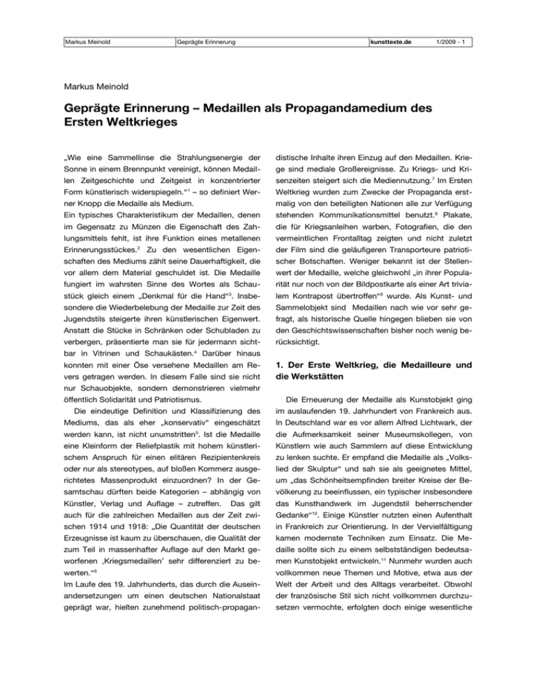 Markus Meinold Geprägte Erinnerung kunsttexte.de 1/2009 - 1 Markus Meinold Geprägte Erinnerung – Medaillen als Propagandamedium des Ersten Weltkrieges „Wie eine Sammellinse die Strahlungsenergie der distische Inhalte ihren Einzug auf den Medaillen. Krie- Sonne in einem Brennpunkt vereinigt, können Medail- ge sind mediale Großereignisse. Zu Kriegs- und Kri- len Zeitgeschichte und Zeitgeist in konzentrierter senzeiten steigert sich die Mediennutzung.7 Im Ersten Form künstlerisch widerspiegeln.“1 – so definiert Wer- Weltkrieg wurden zum Zwecke der Propaganda erst- ner Knopp die Medaille als Medium. malig von den beteiligten Nationen alle zur Verfügung Ein typisches Charakteristikum der Medaillen, denen stehenden Kommunikationsmittel benutzt.8 Plakate, im Gegensatz zu Münzen die Eigenschaft des Zah- die für Kriegsanleihen warben, Fotografien, die den lungsmittels fehlt, ist ihre Funktion eines metallenen vermeintlichen Frontalltag zeigten und nicht zuletzt Erinnerungsstückes.2 Zu den wesentlichen Eigen- der Film sind die geläufigeren Transporteure patrioti- schaften des Mediums zählt seine Dauerhaftigkeit, die scher Botschaften. Weniger bekannt ist der Stellen- vor allem dem Material geschuldet ist. Die Medaille wert der Medaille, welche gleichwohl „in ihrer Popula- fungiert im wahrsten Sinne des Wortes als Schau- rität nur noch von der Bildpostkarte als einer Art trivia- stück gleich einem „Denkmal für die Hand“3. Insbe- lem Kontrapost übertroffen“9 wurde. Als Kunst- und sondere die Wiederbelebung der Medaille zur Zeit des Sammelobjekt sind Medaillen nach wie vor sehr ge- Jugendstils steigerte ihren künstlerischen Eigenwert. fragt, als historische Quelle hingegen blieben sie von Anstatt die Stücke in Schränken oder Schubladen zu den Geschichtswissenschaften bisher noch wenig be- verbergen, präsentierte man sie für jedermann sicht- rücksichtigt. bar in Vitrinen und Schaukästen. 4 Darüber hinaus konnten mit einer Öse versehene Medaillen am Revers getragen werden. In diesem Falle sind sie nicht 1. Der Erste Weltkrieg, die Medailleure und die Werkstätten nur Schauobjekte, sondern demonstrieren vielmehr öffentlich Solidarität und Patriotismus. Die Erneuerung der Medaille als Kunstobjekt ging Die eindeutige Definition und Klassifizierung des im auslaufenden 19. Jahrhundert von Frankreich aus. Mediums, das als eher „konservativ“ eingeschätzt In Deutschland war es vor allem Alfred Lichtwark, der werden kann, ist nicht unumstritten5. Ist die Medaille die Aufmerksamkeit seiner Museumskollegen, von eine Kleinform der Reliefplastik mit hohem künstleri- Künstlern wie auch Sammlern auf diese Entwicklung schem Anspruch für einen elitären Rezipientenkreis zu lenken suchte. Er empfand die Medaille als „Volks- oder nur als stereotypes, auf bloßen Kommerz ausge- lied der Skulptur“ und sah sie als geeignetes Mittel, richtetes Massenprodukt einzuordnen? In der Ge- um „das Schönheitsempfinden breiter Kreise der Be- samtschau dürften beide Kategorien – abhängig von völkerung zu beeinflussen, ein typischer insbesondere Künstler, Verlag und Auflage – zutreffen. Das gilt das Kunsthandwerk im Jugendstil beherrschender auch für die zahlreichen Medaillen aus der Zeit zwi- Gedanke“10. Einige Künstler nutzten einen Aufenthalt schen 1914 und 1918: „Die Quantität der deutschen in Frankreich zur Orientierung. In der Vervielfältigung Erzeugnisse ist kaum zu überschauen, die Qualität der kamen modernste Techniken zum Einsatz. Die Me- zum Teil in massenhafter Auflage auf den Markt ge- daille sollte sich zu einem selbstständigen bedeutsa- worfenen ‚Kriegsmedaillen’ sehr differenziert zu be- men Kunstobjekt entwickeln.11 Nunmehr wurden auch werten.“ vollkommen neue Themen und Motive, etwa aus der 6 Im Laufe des 19. Jahrhunderts, das durch die Ausein- Welt der Arbeit und des Alltags verarbeitet. Obwohl andersetzungen um einen deutschen Nationalstaat der französische Stil sich nicht vollkommen durchzu- geprägt war, hielten zunehmend politisch-propagan- setzen vermochte, erfolgten doch einige wesentliche Markus Meinold Geprägte Erinnerung kunsttexte.de 1/2009 - 2 Erneuerungen in der Medaillenkunst. Starre Formen Freunde der deutschen Schaumünze gegründet, legte wurden zugunsten von Bewegung, Beschleunigung ein Editionsprogramm zum Thema „Weltkrieg“ auf. aufgegeben, entlehnt aus der Formensprache des Ju- Zum einen verfolgte Menadier das Ziel, die Medaillen- gendstils. Das Relief verschmolz mit der Grundfläche kunst neu zu beleben und durch einschlägige Motive zu einem harmonischen Ganzen. Avers- und Revers- den deutschen Patriotismus zu steigern. Zum anderen motive nahmen direkt aufeinander Bezug. Im Hinblick sollte ein Teil des Erlöses der Unterstützung von auf die Um- und Inschrift strebte man eine Symbiose Kriegsversehrten zukommen.15 Auch Hugo Grünthal, von Schrift und Bild an. Eigentümer der Berliner Münzhandlung Robert Ball Der Anteil dieser Form der Medaille an der Ge- Nachfolger, rief eine vergleichbare Edition ins Leben. samtproduktion jener Zeit ist allerdings sehr gering. Künstler wie Hans Schwegerle, Wilhelm Achtenhagen, Einen hohen „Marktwert“ besaßen hingegen vor allem Martin Götze, Theodor von Gosen und August Hum- mythologische Motive, die sich an den bekannten Ka- mel schufen zahlreiche Weltkriegsmedaillen. Ferner non aus Renaissance und Barock anschlossen. Die waren es die Berliner Bildhauer Rudolf Küchler und Popularität dieser Sujets zu Beginn des 20. Jahrhun- Hugo Kaufmann sowie nicht zuletzt Paul Sturm, Me- derts entsprach der Suche des Bildungsbürgertums, dailleur der Königlichen Münze, der bereits vor dem das die Jahre zwischen 1900 und 1910 als geistig- Ersten Weltkrieg auf ein weit reichendes Opus zurück- kulturelle Krise begriff, nach „wertebeständigen blicken konnte.16 Der Münchener Karl Goetz wirkte in künstlerischen Ausdrucksformen und Identifikations- seiner 40-jährigen Schaffensphase
