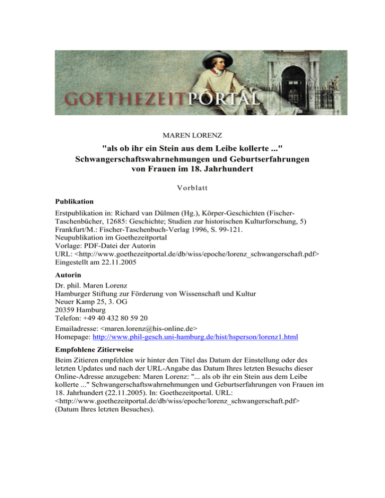 MAREN LORENZ "als ob ihr ein Stein aus dem Leibe kollerte ..." Schwangerschaftswahrnehmungen und Geburtserfahrungen von Frauen im 18. Jahrhundert Vorblatt Publikation Erstpublikation in: Richard van Dülmen (Hg.), Körper-Geschichten (FischerTaschenbücher, 12685: Geschichte; Studien zur historischen Kulturforschung, 5) Frankfurt/M.: Fischer-Taschenbuch-Verlag 1996, S. 99-121. Neupublikation im Goethezeitportal Vorlage: PDF-Datei der Autorin URL: <http://www.goethezeitportal.de/db/wiss/epoche/lorenz_schwangerschaft.pdf> Eingestellt am 22.11.2005 Autorin Dr. phil. Maren Lorenz Hamburger Stiftung zur Förderung von Wissenschaft und Kultur Neuer Kamp 25, 3. OG 20359 Hamburg Telefon: +49 40 432 80 59 20 Emailadresse: <[email protected]> Homepage: http://www.phil-gesch.uni-hamburg.de/hist/hsperson/lorenz1.html Empfohlene Zitierweise Beim Zitieren empfehlen wir hinter den Titel das Datum der Einstellung oder des letzten Updates und nach der URL-Angabe das Datum Ihres letzten Besuchs dieser Online-Adresse anzugeben: Maren Lorenz: "... als ob ihr ein Stein aus dem Leibe kollerte ..." Schwangerschaftswahrnehmungen und Geburtserfahrungen von Frauen im 18. Jahrhundert (22.11.2005). In: Goethezeitportal. URL: <http://www.goethezeitportal.de/db/wiss/epoche/lorenz_schwangerschaft.pdf> (Datum Ihres letzten Besuches). „als ob ihr ein Stein aus dem Leibe kollerte ...“ Schwangerschaftswahrnehmungen und Geburtserfahrungen von Frauen im 18. Jahrhundert, in: Richard van Dülmen (Hg.), Körper-Geschichten. Studien zur historischen Kulturforschung, Bd. V, Frankfurt/M. 1996, 99-121. © COPYRIGHT-HINWEIS ALLE INHALTE DIESER DATEI UNTERLIEGEN DEM INTERNATIONALEN URHEBERRECHTSSCHUTZ. DIE VERBREITUNG DER DATEI ZU PRIVATEN ZWECKEN (UNENTGELTLICH!) IST FREI. DIE GEWERBLICHE ODER AUF EINE ANDERE WEISE ENTGELTLICHE VERBREITUNG BZW. NUTZUNG ZUR HERSTELLUNG UND VERBREITUNG EINER PAPIERAUSGABE IST UNTERSAGT Maren Lorenz »... als ob ihr ein Stein aus dem Leibe kollerte...« Schwangerschaftswahrnehmungen und Geburtserfahrungen von Frauen im 18. Jahrhundert I. Im Sommer 1796 kam zum Göttinger Professor für Geburtshilfe und Direktor der dortigen Gebäranstalt, Osiander, »eine kleine, etwas schief gewachsene, dem Aussehen nach gesunde Bauersfrau von 39 Jahren, die seit mehreren Jahren im Ehestand lebt, [...] um sich wegen einer ihrer Meinung nach bereits zweyjährigen Schwangerschaft Raths zu erholen.1 Sie gab vor, daß Monatliche habe sie nie völlig ordentlich gehabt, und sie habe nie geboren noch einen Abortum erlitten. Vor zwey Jahren aber sei ihr das Monatliche ausgeblieben, sie sey dike geworden und habe zur rechten Zeit Geburtswehen verspüret, die seit der Zeit in Zwischenräumen von 8 bis 14 Tagen jedesmal wieder sich äußern, ohne daß jedoch eine Geburt erfolge. Bey diesen öfteren Bewegungen zur Geburt habe sie das Monatliche von Zeit zu Zeit unordentlich und gering. In ihrem Leibe lasse sich ein oftmaliges Kollern und Brudeln hören, besonders in der Magengegend, wobey der Leib krampfhaft zurückgezogen werde und sie öfters schmerzhafte Stösse bekomme. Oft bekomme sie ein freywilliges schleimichtes Erbrechen und zuweilen einen frieselartigen Ausschlag, der schnell verschwinde und eben so schnell wieder erscheine.« Der Mediziner, der die Bäuerin selbst vaginal untersuchte, bemerkte abgesehen von einem »dem Ende eines Regenwurms ähnliche(n) Körper«, der aus dem Muttermund heraushing, keine besonderen Auffälligkeiten. »Ich hielt ihren Zustand für nichts anderes als Hysterie, bey der vielleicht Eingeweidewürmer mit im Spiel sein könnten. Es wurden ihr daher Wurmmittel [...] verordnet.« Daraufhin gingen zwar keine Würmer ab, doch »ihre krampfhafte Bewegungen im Bauch verminderten sich bald bey dem Gebrauch dieser Mittel, demungeachtet hatte sich die Idee einer Schwangerschaft ihrer Einbildungskraft so bemächtiget, daß sie durchaus diesen Gedanken nicht fahren lassen wollte sondern so hartnäckig darauf beharrte, daß sie böse wurde wenn man ihr solches ausreden wollte [...].« Der Arzt kapitulierte und gestand der Frau 99 schließlich zu, daß sich ihre Wahrnehmungen auf eine festgesetzte Schwangerschaft außerhalb der Gebärmutter, vielleicht in einem Eierstock, zurückführen ließen. Die Aussagen der unverdächtigen Patientin wurden von ihm zunächst in eine glaubwürdige Symptombeschreibung und eine zu verwerfende laienhafte Selbstdiagnose unterteilt. Das hartnäckige Festhalten an der nicht widerlegbaren Selbstwahrnehmung ließ den Arzt letztlich eine »Täuschung der Natur« vermuten, die nur bei einer psychisch kranken Person längerfristig möglich sei. Schon dieses Beispiel zeigt: Der weibliche Körper des 18. Jahrhunderts unseres Kulturkreises war noch nicht der normierte und kontrollierte Körper des ausgehenden 20. Jahrhunderts.2 Das heute so selbstverständliche Sehen ins Körperinnere trübt uns den Blick für die Unsicherheit der Schwangerschaft einer Zeit vor dem Ultraschall und dem Schnelltest aus der Apotheke. Gegen Ende des 18. Jahrhunderts wurde Leiblichkeit von Frauen anders erfahren als heute. Die Vorgänge zwischen Zeugung und Geburt eines Kindes waren weitgehend unsichtbar, da sie hauptsächlich von den Empfindungen und der (auf eigener und/ oder fremder Empirie basierenden) Selbstbeobachtung der Schwangeren abhängig und darum bis zur Geburt zweifelhaft waren. Überlieferungen solcher Erfahrungen sind selten und nicht systematisch erfaßbar, mögen sie auch vereinzelt in autobiographischen Zeugnissen bürgerlicher oder adeliger Frauen auftauchen.3 Einen, wenn auch durch die männlich-akademische Brille gefilterten, breiteren Zugang bieten allerdings ärztliche Fallgeschichten, die zur fachinternen Fortbildung und medizinische Gutachten, die im Auftrag der Justiz verfaßt und später teilweise zu ihrer Belehrung publiziert wurden. In gerichtsoder allgemeinmedizinischen Fallsammlungen tauchen Hunderte rätselhafte Schwangerschaften, Aborte und Geburten auf, die das är