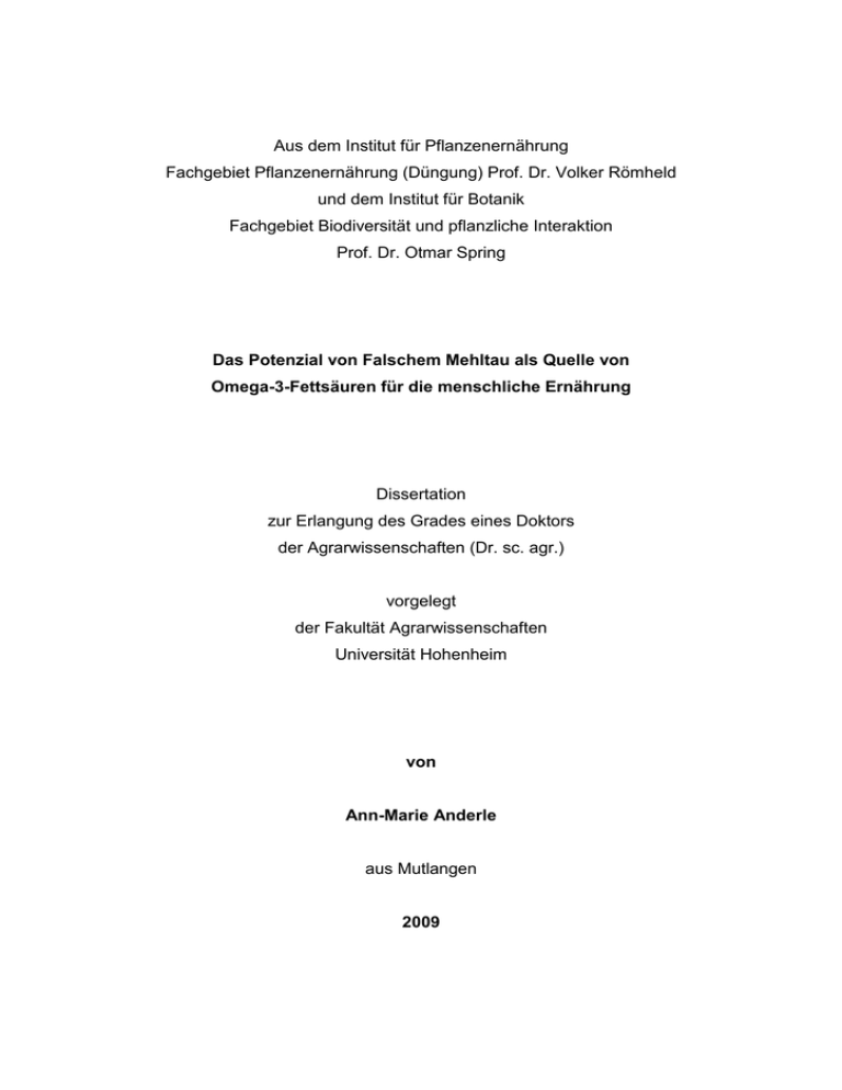 Aus dem Institut für Pflanzenernährung Fachgebiet Pflanzenernährung (Düngung) Prof. Dr. Volker Römheld und dem Institut für Botanik Fachgebiet Biodiversität und pflanzliche Interaktion Prof. Dr. Otmar Spring Das Potenzial von Falschem Mehltau als Quelle von Omega-3-Fettsäuren für die menschliche Ernährung Dissertation zur Erlangung des Grades eines Doktors der Agrarwissenschaften (Dr. sc. agr.) vorgelegt der Fakultät Agrarwissenschaften Universität Hohenheim von Ann-Marie Anderle aus Mutlangen 2009 Die vorliegende Arbeit wurde am 10. Juli 2009 von der Fakultät Agrarwissenschaften der Universität Stuttgart-Hohenheim als „Dissertation zur Erlangung des Grades eines Doktors der Agrarwissenschaften“ angenommen. Tag der mündlichen Prüfung: 30. Juli 2009 1. Prodekan: Prof. Dr. W. Bessei 1. Prüfer (Betreuer): Prof. Dr. O. Spring 2. Prüfer (Mitberichter): Prof. Dr. V. Römheld 3. Prüfer: Prof. Dr. K. Haas Eingereicht am 28.01.2009 Mündliche Prüfung am 30. Juli 2009 Für meine Familie Danksagung Ich bedanke mich ganz herzlich bei meinen 3 hervorragenden Betreuern, die sich gegenseitig optimal ergänzten. Zuallererst danke ich Herrn Professor Spring für die Annahme als Doktorandin und die Vergabe des höchst interessanten Themas. Er stand mir äußerst zuverlässig mit wissenschaftlichem und menschlichem Rat zur Seite. Er war der Hauptbetreuer und Förderer dieser Arbeit und führte alle notwendigen Korrekturen durch. Ganz herzlich bedanke ich mich auch bei Herrn Professor Haas für das stets entgegengebrachte Vertrauen, das freundschaftliche Arbeitsklima, seine praktischen Tipps sowie für die zur Verfügung gestellten Sachmittel und Freiräume für meine Arbeiten am GC. Herrn Professor Römheld danke ich ganz herzlich für seine Tätigkeit als Gutachter, die wissenschaftlichen Anregungen, seine stets motivierende Art und für die zur Verfügung gestellte Klimakammer während meiner Versuche am Institut für Pflanzenernährung. Mein Dank gilt auch besonders meinen Projektpartnern im „Nahrungskettenversuch“. Bei Herrn Professor Grashorn bedanke ich mich sehr herzlich für die Kooperation bei der Umsetzung der Idee. Ebenso danke ich seinen Mitarbeiterinnen und Mitarbeitern vom Unteren Lindenhof. Herrn Bässler von der Versuchsstation für Gartenbau danke ich für die Überlassung der Versuchsfläche für die Salatanzucht, Frau Tina Schuster und dem gesamten Gärtnerteam danke ich herzlich für ihre Arbeit und die sehr gute Zusammenarbeit während der gesamten Zeit bis zur Ernte. Herrn Blauhorn von der Staatsschule für Gartenbau danke ich für die vielen Fachgespräche über Salat und die Überlassung des infizierten Roten Eichblatt Salats für Futterzwecke. Ich bedanke mich herzlich bei Herrn Professor Müller und Herrn Dr. Heindl für die Benutzung des Hordentrockners am Institut für Agrartechnik. Ganz besonders bedanke ich mich bei Frau Amberg für die Trocknungsprozessführung und ihre engagierte Hilfe. Ich bedanke mich recht herzlich bei allen Kolleginnen und Kollegen der Institute für Botanik und für Pflanzenernährung, ganz besonders danke ich Herrn Reinhard Zipper, der mir stets zuverlässig mit praktischen Ratschlägen zur Seite stand und Frau Dr. Kania danke ich für die vielen Fachgespräche. Vor allem danke ich aber meinem Mann Marc Anderle, der psychologisch und materiell stets hinter mir stand und mich stets in Allem förderte. Ich danke meiner ganzen Familie, die mich immer bei meinen Vorhaben unterstützte. Inhaltsverzeichnis 1. Einleitung ........................................................................................................... 1 1.1. Omega-3-Fettsäuren in der menschlichen Ernährung und Nahrungsmittelproduktion ................................................................................................... 1 1.1.1. Chemische Definition der n-3-Fettsäuren ............................................. 2 1.1.2. Die medizinische Wirkung der n-3-Fettsäuren...................................... 3 1.2. Natürliche Quellen von n-3-Fettsäuren ......................................................... 5 1.2.1. Öle Höherer Pflanzen ........................................................................... 6 1.2.2. Tierische Quellen ................................................................................. 7 1.3. Problematik natürlicher Quellen.................................................................... 8 1.4. Alternative Quellen für EPA und DHA........................................................... 8 1.4.1. Öle Niederer Pflanzen als alternative Quellen für EPA und DHA ......... 8 1.4.2.Transgene Pflanzen ............................................................................10 1.5. Problematik alternativer Quellen.................................................................10 1.6. Aktueller Stand der Forschung und Zielsetzung der Arbeit.........................11 2. Qualitative FS-Zusammensetzung und EPA-Konzentrationen in Sporangien und infiziertem Pflanzengewebe ............................................................13 2.1. Materialien und Methoden ..........................................................................13 2.1.1 Infektionstechniken und Ernte .............................................................13 2.1.1.1. Keimlingsinfektion bei P. halstedii............................................14 2.1.1.2. Blattinfektion bei B. lactucae.......................................................... 15 2.1.1.3. Ernte und Lagerung von Sporangien und Pflanzenmaterial.....16 2.1.2. Aufbereitung der Fettsäuren für die GC-Analyse................................16 2.1.2.1. Extraktion der Fettsäuren ........................................................17 2.1.2.2. Säure-katalysierte Veresterung der Fettsäuren für die GCAnalyse ...................................................................................18 2.1.3. GC-FID Messtechnik ..................................................