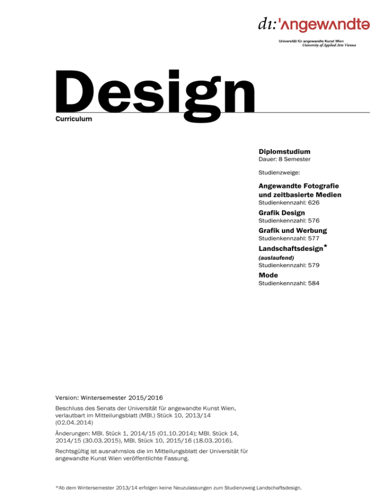 Design Curriculum Diplomstudium Dauer: 8 Semester Studienzweige: Angewandte Fotografie und zeitbasierte Medien Studienkennzahl: 626 Grafik Design Studienkennzahl: 576 Grafik und Werbung Studienkennzahl: 577 Landschaftsdesign* (auslaufend) Studienkennzahl: 579 Mode Studienkennzahl: 584 Version: Wintersemester 2015/2016 Beschluss des Senats der Universität für angewandte Kunst Wien, verlautbart im Mitteilungsblatt (MBl.) Stück 10, 2013/14 (02.04.2014) Änderungen: MBl. Stück 1, 2014/15 (01.10.2014); MBl. Stück 14, 2014/15 (30.03.2015), MBl. Stück 10, 2015/16 (18.03.2016). Rechtsgültig ist ausnahmslos die im Mitteilungsblatt der Universität für angewandte Kunst Wien veröffentlichte Fassung. *Ab dem Wintersemester 2013/14 erfolgen keine Neuzulassungen zum Studienzweig Landschaftsdesign. Design 2 Curriculum Inhaltsverzeichnis 1. 2. 3. 3.1. 3.2. 3.2.1. 3.2.2. 3.2.3. 3.2.4. 3.2.5. 4. 4.1. 4.2. 4.3. 4.4. 4.5. 4.6. Aufbau und Gliederung des Studiums Qualifikationsprofil Studienverlauf Erster Studienabschnitt Zweiter Studienabschnitt Angewandte Fotografie und zeitbasierte Medien Grafik Design Grafik und Werbung Landschaftsdesign (auslaufend)* Mode Prüfungsordnung Zulassungsprüfung Erste Diplomprüfung Zweite Diplomprüfung Diplomarbeit Lehrveranstaltungsprüfungen Anerkennung relevanter Praktika 2 2 4 4 5 5 7 9 11 13 15 15 15 17 17 18 18 1. Aufbau und Gliederung des Studiums Der Studienplan für das Diplomstudium der Studienrichtung Design an der Universität für angewandte Kunst Wien gliedert sich in zwei Studienabschnitte. Der erste Studienabschnitt umfasst zwei Semester (60 ECTS-Punkte), der zweite Studienabschnitt sechs Semester (180 ECTS-Punkte). Der zweite Studienabschnitt wird in folgenden Studienzweigen angeboten: − − − − − Angewandte Fotografie und zeitbasierte Medien Grafik Design Grafik und Werbung Landschaftsdesign (auslaufend)* Mode 2. Qualifikationsprofil Ziele An der Universität für angewandte Kunst Wien stehen Ideenfindung, Konzeption, Umsetzung und Präsentation im Zentrum des Studiums. Zentrales Anliegen ist die individuelle Entfaltung des künstlerischen/gestalterischen Potenzials der Studierenden. Das Verständnis von Design schließt das Bewusstsein gegenüber der Verantwortung für kulturelle, soziale, ökologische, ökonomische und politische Entwicklungen ein. Berufsfelder Die Absolventinnen und Absolventen arbeiten mit ihren erworbenen Qualifikationen unter anderem − als FotografInnen in allen Bereichen der angewandten Fotografie, wie zB. Werbe- und Produktfotografie, Fotojournalismus, Architektur- und Modefotografie und Film. Sie agieren als GestalterInnen, die den komplexen sich schnell entwickelnden Markt der Bildproduktion kritisch hinterfragen und durch die individuell entwickelte Handschrift und Haltung technisch auf höchstem Niveau für sich erschließen können. (Studienzweig Angewandte Fotografie und zeitbasierte Medien) Design 3 Curriculum − als GrafikdesignerInnen, Art DirectorInnen, TypografInnen, IllustratorInnen, FotografInnen und KünstlerInnen, freischaffend oder in Designagenturen, in Werbe- oder New Media-Agenturen, im Verlagswesen, in kulturellen Einrichtungen, für die Privatwirtschaft und die öffentliche Hand. Als Cross Media Player mit fundierten Kenntnissen in Kommunikationstheorie, Kulturwissenschaft und Designmanagement und mit der Verantwortung für gesellschaftliche, ökonomische und ökologische Zusammenhänge sind sie ausgebildet, Designlösungen für zeitbasierte Medien, interaktive Medien und Print zu entwickeln und umzusetzen. Dies umfasst u.a. Brand und Corporate Design, Story Telling, Interactive Design, Fotografie, Illustration, Typografie, Druckgrafik, Packaging, Informations- und Ausstellungsdesign, Sound Design. (Studienzweig Grafik Design) − als GrafikerInnen, LayouterInnen, TexterInnen, Art DirectorInnen, Advertising ManagerInnen in Werbeagenturen und in Werbeabteilungen von Unternehmen und sonstigen Organisationen. Mit fundierten Kenntnissen in Kommunikationstheorie, Kulturwissenschaften, Markt- und Motivationsforschung sind sie speziell ausgebildet, Werbekonzepte für gedruckte und elektronische Medien zu entwickeln und durchzuführen. (Studienzweig Grafik und Werbung) − als freischaffende LandschaftdesignerInnen und GartenkünstlerInnen, als KonsulentInnen für Gartenbaubetriebe, für Stadt- und Gemeindeverwaltungen, für Bildungseinrichtungen, Medien und private Auftraggeber. (Studienzweig Landschaftsdesign) − als ModedesignerInnen bei bestehenden nationalen und internationalen Labels und/oder Modehäusern, oder sie gründen eigene Modelabels. (Studienzweig Mode) Umsetzung in der Lehre Die Lehre im Bereich Design ist projektorientiert, die Betreuung der Studierenden erfolgt individuell. Bei der gemeinsamen Arbeit in Teams von Studierenden verschiedener Studienjahrgänge (vertikales Studio) profitieren die Studierenden voneinander. Wissen und Fertigkeiten werden in der Vermittlung auf den Designprozess bezogen, werden als Tools verstanden und gelangen unmittelbar zur Anwendung. Im analytischen und kreativen Prozess werden Aspekte kontextuell relevanter Disziplinen integriert. Hohe Praxisnähe der Ausbildung ist ebenso gewährleistet wie die Schulung der Fähigkeit zu fundierter wissenschaftlicher Reflexion des gesellschaftlichen Umfelds und des eigenen Handelns. Durch die Vielfalt der Studienangebote an der Universität für angewandte Kunst ist die Auseinandersetzung mit anderen Disziplinen im Kontext gegeben, ebenso die praktische Arbeit und die Umsetzung der Entwürfe im Rahmen der technologischen Möglichkeiten und personellen Kapazität der Universität für angewandte Kunst. Externe Expertinnen und Experten werden regelmäßig in die Lehre eingebunden. Studienprojekte werden auch in Kooperation mit Unternehmen/Organisationen durchgeführt. Praktika eröffnen Zugänge zu Expertisen außerhalb der Universität und ermöglichen Erfahrungen in Arbeitsfeldern von Design. Es wird empfohlen, im 