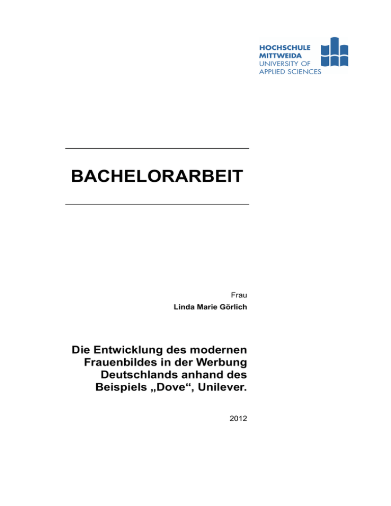 BACHELORARBEIT Frau Linda Marie Görlich Die Entwicklung des modernen Frauenbildes in der Werbung Deutschlands anhand des Beispiels „Dove“, Unilever. 2012 Fakultät Medien BACHELORARBEIT Die Entwicklung des modernen Frauenbild in der Werbung Deutschlands am Beispiel „Dove“, Unilever. Autorin: Frau Linda Marie Görlich Studiengang: Angewandte Medienwirtschaft Seminargruppe: AM09wK1-B Erstprüferin: Prof. Dr. Tamara Huhle Zweitprüfer: Maximilian Werner, B. Sc., MA Einreichung: Stuttgart, 31. Juli 2012 Faculty of Media BACHELOR THESIS The development of the modern image of women in german advertising, using the example of „Dove“, Unilever. author: Ms. Linda Marie Görlich course of studies: Applied Media Economics seminar group: AM09wK1-B first examiner: Prof. Dr. Tamara Huhle second examiner: Maximilian Werner, B. Sc., MA submission: Stuttgart, 31.07.2012 IV Bibliografische Angaben: Görlich, Linda Marie: Die Entwicklung des modernen Frauenbild in der Werbung Deutschlands anhand des Beispiels „Dove“, Unilever. The development of the modern image of women in German advertising, using the example of “Dove”, Unilever. 2012 - 89 Seiten Mittweida, Hochschule Mittweida (FH), University of Applied Sciences, Fakultät Medien, Bachelorarbeit, 2012 Abstract Die vorliegende Arbeit beschäftigt sich mit dem Frauenbild in der Werbung Deutschlands und untersucht, ob die Werbekampagne des KörperpflegemittelHerstellers „Dove“ dieses nachhaltig verändert hat. Der Schwerpunkt der Arbeit liegt bei der Analyse vierer Werbespots auf die darin verwendeten Rollenbilder und Stereotypen von Frauen. Dabei werden aktuelle Gesellschaftssituationen sowie vorangegangene Klischees der Frauen in der Werbung betrachtet und versucht, eine Prognose für die Zukunft zu stellen. V Inhaltsverzeichnis Abstract......................................................................................................................IV Abkürzungsverzeichnis...........................................................................................VII Abbildungsverzeichnis...........................................................................................VIII Tabellenverzeichnis...................................................................................................XI 1 Einführung ................................................................................................................1 2 Werbung ...................................................................................................................3 2.1 Definition............................................................................................................3 2.2 Einfluss auf die Gesellschaft..............................................................................5 2.3 Frauenbild in den Anfängen der Werbung.........................................................7 2.4 Heutige Rolle der Frau in der Werbung...........................................................10 2.4.1 Hausfrauen...........................................................................................10 2.4.2 Karrierefrauen.......................................................................................11 2.4.3 Sportlerinnen.........................................................................................12 2.4.4 Sexsymbol............................................................................................13 2.5 Frauen und ihr eigenes Rollenverständnis.......................................................15 2.6 Bedeutung der Frau als Konsumentin..............................................................17 2.7 Gender Ansatz.................................................................................................20 3 Gesellschaftliche Anforderungen.........................................................................23 3.1 Maslowsche Bedürfnispyramide......................................................................23 3.2 Gesellschaftliche Schönheitsideale..................................................................24 4 Frauen in der Körperpflegewerbung.....................................................................28 4.1 “Fa” aus dem Hause “Henkel”..........................................................................29 4.2 “Nivea” aus dem Hause “Beiersdorf”................................................................31 4.3 “Garnier” aus dem Hause “L'Oréal”..................................................................33 4.4 “Dove” aus dem Hause “Unilever” ...................................................................35 4.4.1 Die Marke “Dove”..................................................................................35 4.4.2 “Keine Models aber straffe Kurven”......................................................36 4.4.3 “Initiative für wahre Schönheit”.............................................................37 VI 4.4.4 Aktion für mehr Selbstwertgefühl..........................................................39 4.4.5 “Dove pro • age”....................................................................................41 4.4.6 “Die ganze Wahrheit über Schönheit”...................................................42 4.5 Reaktionen in der Gesellschaft........................................................................42 5 Analyse und Auswertung aktueller Spots............................................................44 5.1 “NutriSkin” der Marke “Fa”...............................................................................44 5.2 “Eternity” der Marke “Nivea”.............................................................................45 5.3 “Mineral Deodorant” der Marke “Garnier” ........................................................46 5.4 “Positives Körpergefühl” der Marke “Dove”......................................................47 5.5 Analyse-Matrix..............