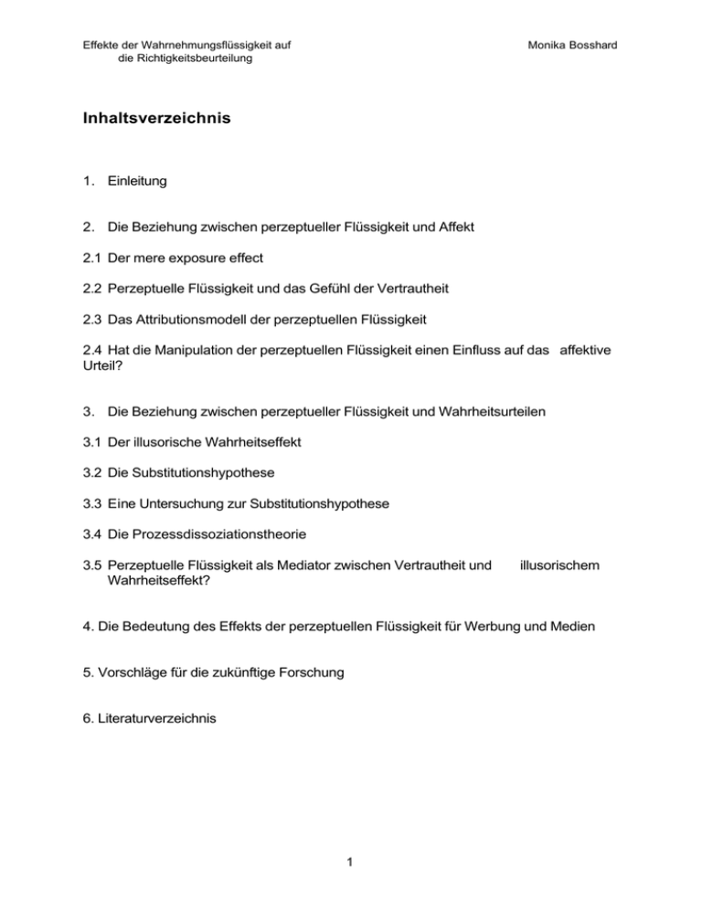 Effekte der Wahrnehmungsflüssigkeit auf die Richtigkeitsbeurteilung Monika Bosshard Inhaltsverzeichnis 1. Einleitung 2. Die Beziehung zwischen perzeptueller Flüssigkeit und Affekt 2.1 Der mere exposure effect 2.2 Perzeptuelle Flüssigkeit und das Gefühl der Vertrautheit 2.3 Das Attributionsmodell der perzeptuellen Flüssigkeit 2.4 Hat die Manipulation der perzeptuellen Flüssigkeit einen Einfluss auf das affektive Urteil? 3. Die Beziehung zwischen perzeptueller Flüssigkeit und Wahrheitsurteilen 3.1 Der illusorische Wahrheitseffekt 3.2 Die Substitutionshypothese 3.3 Eine Untersuchung zur Substitutionshypothese 3.4 Die Prozessdissoziationstheorie 3.5 Perzeptuelle Flüssigkeit als Mediator zwischen Vertrautheit und Wahrheitseffekt? illusorischem 4. Die Bedeutung des Effekts der perzeptuellen Flüssigkeit für Werbung und Medien 5. Vorschläge für die zukünftige Forschung 6. Literaturverzeichnis 1 Effekte der Wahrnehmungsflüssigkeit auf die Richtigkeitsbeurteilung Monika Bosshard 1. Einleitung Grundlage dieser Arbeit ist die Studie "Effects of perceptual fluency on judgments of truth" von R. Reber und N. Schwarz (1999). Die Autoren konnten in dieser Studie zeigen, dass durch die Manipulation der perzeptuellen Flüssigkeit Richtigkeitsbeurteilungen beeinflusst werden. In dieser Arbeit werden die theoretischen Hintergründe und einige Studien zum Thema erläutert. Zuerst wird die Beziehung zwischen perzeptueller Flüssigkeit und Affekt beschreiben, weil dieser Zusammenhang für die Studie von Reber und Schwarz (1999) von grundlegender Bedeutung ist. Im zweiten Teil der Arbeit werden theoretische und experimentelle Grundlagen der Studie von Reber und Schwarz (1999) näher beschreiben. Zudem wird dargestellt, welche Bedeutung der Effekt der perzeptuellen Flüssigkeit für Medien und Werbung hat und gezeigt, womit sich die zukünftige Forschung auseinandersetzen könnte. 2. Die Beziehung zwischen perzeptueller Flüssigkeit und Affekt 2.1 Der mere exposure effect Zajonc (1968) konnte in mehreren Studien zeigen, dass sich die Einstellung eines Individuums gegenüber einem Stimulus positiv verändert, wenn dieser Stimulus dem Individuum mehrfach dargeboten wird. Dieses Phänomen nannte Zajonc (1968) mere exposure effect. Unter mere exposure verstand er eine Bedingung, unter welcher der gegebene Stimulus der Wahrnehmung des Individuums leichter zugänglich gemacht wird. Unterstützung für die Hypothese des mere exposure effects fand Zajonc (1968) aus verschiedenen Richtungen: 1. Aufgrund einer eigenen wie auch mehreren Studien von anderen Forschern konnte Zajonc (1968) aufzeigen, dass zwischen der affektiven Konnotation eines Wortes sowie dessen Häufigkeit eine positive Korrelation besteht. Diese Korrelation bedeutet, dass Wörter mit positiver Bedeutung häufiger benutzt werden als Wörter mit negativer Bedeutung. Aufgrund der Korrelation kann jedoch noch nicht gesagt werden, ob Wörter mit positiver Bedeutung häufiger benutzt werden oder ob häufig benutzte Wörter allgemein positiver eingeschätzt werden. 2 Effekte der Wahrnehmungsflüssigkeit auf die Richtigkeitsbeurteilung Monika Bosshard 2. Je häufiger den Probanden eines Experiments die gleichen Symbole und sinnlosen Wörter dargeboten werden, desto stärker zeigen sie die Tendenz, diesen Wörtern und Symbolen eine positive Bedeutung zuzuschreiben (Zajonc, 1968). 3. In verschiedenen Studien konnte gezeigt werden, dass die wiederholte Präsentation eines Stimulus zu einer positiveren Einstellung des Probanden gegenüber dem Stimulus führt (Zajonc, 1968). Zajonc (1968) erklärt den mere exposure effect aus lerntheoretischer und evolutionsbiologischer Sicht: Begegnet ein Individuum zum ersten Mal einem Stimulus, zeigt es eine instinktive Angst- und Vermeidungsreaktion. Werden mit dem Stimulus jedoch keine negativen Konsequenzen assoziiert, schwächt sich die Vermeidungsreaktion mit jeder weiteren Begegnung ab. Mit der Zeit entwickelt das Individuum dem Stimulus gegenüber Vertrautheit und positive Gefühle. 2.2 Perzeptuelle Flüssigkeit und das Gefühl der Vertrautheit Whittlesea, Jacoby und Girard (1990) zeigten den Probanden einer Studie zuerst verschiedene Wörter in rascher Abfolge. Anschliessend präsentierten sie ihnen einige dieser Wörter mit Masken unterschiedlicher Intensität ein zweites Mal. Die Masken, welche aus sich bewegenden, auf die Wörter proijzierten Punkten bestanden, führten zu einer verminderten perzeptuellen Flüssigkeit. Die Probanden mussten angeben, ob sie das Wort wiedererkennen. Es zeigte sich, dass Wörter mit schwacher Maske signifikant häufiger als vertraut eingestuft werden als Wörter mit starker Maske. Wurden die Probanden jedoch darauf aufmerksam gemacht, dass die Wörter unterschiedlich gut lesbar sind, hatte die Intensität der Maske keinen Einfluss auf das Urteil der Probanden. Die Autoren sehen die Erklärung für diese Ergebnisse in unbewussten Attributionsprozessen. Suchten die Probanden nach einer Erklärung für die einfachere Verarbeitung eines Wortes, schrieben sie dies nicht der schwächeren Maske, sondern einem falschen Gefühl von Vertrautheit zu. Die Quelle der einfacheren Verarbeitung wurde in der Vergangenheit gesucht, wenn die Probanden nicht über die Manipulation der Wahrnehmungsflüssigkeit informiert waren. Folglich kann Wahrnehmungsflüssigkeit nur schwer vom Gefühl der Vertrautheit getrennt werden (Whittlesea, Jacoby & Girard, 1990). Zajonc (1968) ging davon aus, dass eine wiederholte Präsentation eines Stimulus zu einem positiven Gefühl der Vertrautheit führt. Die Ergebnisse der Studie von Whittlesea, Jacoby und Girard (1990) weisen jedoch darauf hin, dass der mere exposure effect nicht auf die Vertrautheit alleine, sondern vor allem auf die durch die Wiederholung verursachte perzeptuelle Flüssigkeit und einfachere Verarbeitung zurückzuführen ist. 2.3 Das Attributionsmodell der perzeptuellen Flüssigkeit Gemäss dem Attributionsmodell der perzeptuellen Flüssigkeit 
