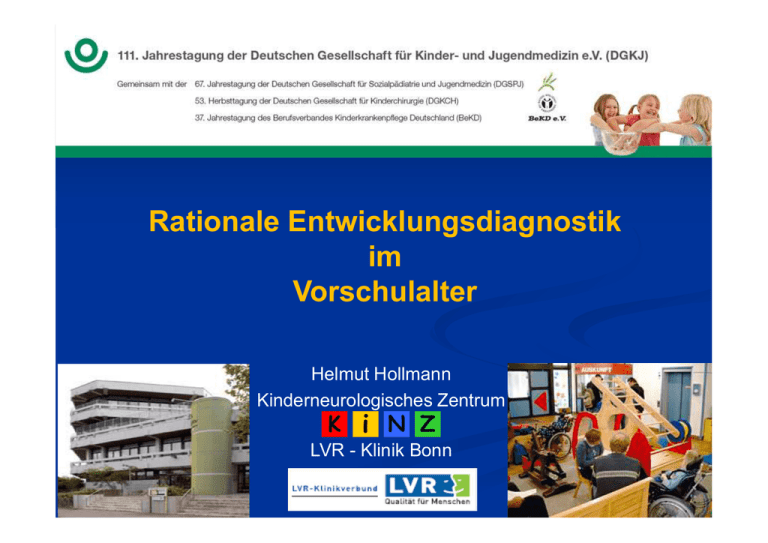 Rationale Entwicklungsdiagnostik im Vorschulalter Helmut Hollmann Kinderneurologisches Zentrum K i N Z LVR - Klinik Bonn Inhalt n n n n n n n n 1 – 12 13 – 66 67 – 73 74 – 107 108 – 116 117 – 148 149 – 169 170 – 194 Einleitung IVAN und Stufendiagnostik I – III konkret GOP allgemeine Hinweise Zusammenfassung Raster U7a Raster U10/U11 Interventionen, Therapie, Kinderbewusstsein 43. Herbst-Seminarkongress für Entwicklungs- und Sozialpädiatrie Brixen, 09. – 13. September 2015 Herzlich willkommen! In Kooperation mit der Deutschen Gesellschaft für Sozialpädiatrie und Jugendmedizin DGSPJ n n „Wenn Kinderärzte nichts von Entwicklung verstehen, besteht keine Notwendigkeit für sie in der Praxis. Impfungen, Husten und Mittelohrentzündung kann auch der Allgemeinarzt übernehmen.“ Remo H. Largo, 1996 Neue Morbiditäten Die 10 häufigsten Praxisvorstellungsanlässe Diagnosegruppe (n = 96.036) Proz. Husten mit/ohne Atemnot 28,89 % Fieber 12,81 % Neue Morbiditäten 11,05 % Haut / Nägel / Haare 8,83 % Durchfall und / oder Erbrechen 7,91 % Halsschmerzen, Mundschmerzen 5,54 % Rote und / oder verklebte Augen 4,30 % Ohrenschmerzen (mit oder ohne Fieber) 4,05 % Akute Schmerzen 3,97 % Hautausschlag 3,94 % Quelle: DAKJ-Versorgungsstudie 2012, Nentwich, Fegeler, Jäger-Roman / Universität Dresden M. Lang / N. Kniess EARLY INTERVENTION (Shonkoff & Meisels, 2000) “Early intervention consists of multidisciplinary services provided to children from birth to 5 years of age to promote child health and well-being, enhance emerging competencies minimize developmental delays, remediate existing or emerging disabilities, prevent functional deterioration and promote adaptive parenting and overall family functioning. These goals are accomplished by individualized developmental, educational and therapeutic services for children provided in conjunction with mutually planned support for their families.” Developmental Neurology Groningen Frühe Intervention “Frühe Intervention umfasst multiprofessionelle Dienste, die Kindern ab Geburt bis zum Alter von 5 Jahren zur Verfügung gestellt warden. Zielsetzung ist - die Unterstützung von Gesundheit und Wohlbefinden, - die Förderung der sich entwickelnden Kompetenzen, - die Minimalisierung von Entwicklungsverzögerungen, - die Zurückführung von bestehenden oder sich entwicklenden Behinderungen, … Developmental Neurology Groningen Frühe Intervention … Zielsetzung ist - die Prävention von Entwicklungsabweichungen und - die Beförderung von elterlicher Kompetenz sowie der Familienfunktion insgesamt. Diese Ziele werden erreicht durch individualiserte entwicklungsfördernde, erzieherische und therapeutische Maßnahmen für das Kind im Zusammenwirken mit regelmäßig adaptierter Unterstützung für seine Familie.” Developmental Neurology Groningen Themen der Früherkennungs-Untersuchung n n n n n n Entwicklung funktionell Motorik, grob und fein Sprache Lesen und Rechtschreibung, Rechnen Kognition / Intelligenz Verhalten Erziehung Familie Umgebung Makrosystem Wertvorstellungen Gesellschaft Ideologien Ökonomie Lebenswelt von Geschwistern Normen Medien Familie Exosystem Mesosystem Kultur Arbeitswelt der Eltern Schulsystem Schule Nachbarschaft Peer-Gruppe Eltern Mikrosystem Geschwister Verein Freunde Erzieher Individuum Lehrer Freizeit Wohnraum Ökologisches Modell BRONFENBRENNER, Uri (1977, 1986) Kirche KiGGS 2007: ca. 15 % aller Kinder und Jugendlichen betroffen von … … einem „Besonderen Versorgungsbedarf“ bei: Entwicklungsstörungen, chronischen Krankheiten und Behinderungen mit sehr unterschiedlicher Häufigkeit Diagnostik von Entwicklung und mögliche Versorgungsstrukturen in der Sozialpädiatrie Famoses EntwicklungsdiagnostikStufenschema Stufendiagnostik Kinder- / Jugendmedizin: n Screening in der Praxis ( 5- 10 Minuten) n Basisdiagnostik Praxis ( 15- 40 Minuten) n Differenzierte Diagnostik ( 2- 8 Stunden) Spezialdiagnostik zentralisiert (MRT, Genetik, Stoffwechsel, EVP u. a.) Differenzierte Verfahren eher institutionell geeignet (SPZ, KJP u.a.) modif. nach SCHMID RG, 2008 IVAN-Stufenkonzept Arbeitsphase 08-2012 bis 12-2014 IVAN = Interdisziplinäre Verbändeübergreifende Arbeitsgruppe Entwicklungsdiagnostik der DGSPJ, des BVKJ, der DGAAP, zur Behandlung von Entwicklungsauffälligkeiten in Praxis, Klinik und im SPZ Koordinator: Prof. Dr. med. Ronald G. Schmid, Altötting (BVKJ) Dr. Folkert Fehr, Sinsheim (DGAAP) Dr. Hedwig Freitag, Berlin (DGSPJ, BAG-Psychologen) Dr. Helmut Hollmann, Bonn (DGSPJ) Susanne Kleuker, Essen (DGSPJ, BAG-Psychologen) Dr. Norbert Knieß, Ingolstadt (DGAAP) Manfred Mickley, Berlin (DGSPJ, BAG-Psychologen) Dr. Andreas Oberle, Stuttgart (DGSPJ) Armin Wegener, Düsseldorf (DGSPJ, BAG-Psychologen) Pädiatrische Basis: Früherkennungsuntersuchungen n n n n n n n Körperliche Gesundheit Hören und Sehen Wachstum (Länge, Gewicht, BMI; Kopfumfang !!) Identifikation und Behandlung von -chron.- Krankheiten Impfungen laut STIKO Seelische Gesundheit: Verhalten und Psyche Kindeswohl: Einschätzung der Versorgung und Interaktion EntwicklungsdiagnostikStufenschema Stufendiagnostik Kinder- / Jugendmedizin: n Screening in der Praxis ( 10- 30 Minuten) n Basisdiagnostik Praxis ( 25- 50 Minuten) n Differenzierte Diagnostik (SPZ, KJP u. a.) ( 4- 10 Stunden, ggf. auch mehr) Spezialdiagnostik zentralisiert (MRT, Genetik, Stoffwechsel, EVP u. a.) IVAN-Stufendiagnostik, Stand 2015-03-13 Stufe I: Screening n n n Ziel: zuverlässige Identifikation von Entwicklungsauffälligkeiten im Rahmen der „U“Früherkennungsuntersuchungen Zeitkorridor: 10 – 30 Minuten Entwicklungsdiagnostische Maßnahmen ausgerichtet auf 10. – 5. Perzentile Bei Abweichungen oder primär bei Globaler Entwicklungsstörung: Stufe II Screening, Raster Orientierende Beurteilung der Entwicklung 3. – 10. Lebenstag (U2) 4.–6. Lebenswoche (U3) 3.–4. Lebensmonat (U4) 6.–7. Lebensmonat (U5) 10.–12. Lebensmonat (U6) 21.–24. Lebensmonat (U7) 33.–36.