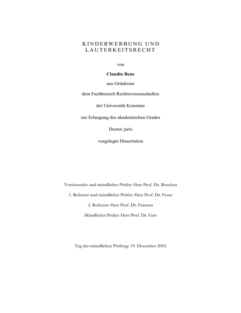 K I N D E RW E R B U N G U N D LAUTERKEITSRECHT von Claudia Benz aus Grünkraut dem Fachbereich Rechtswissenschaften der Universität Konstanz zur Erlangung des akademischen Grades Doctor juris vorgelegte Dissertation Vorsitzender und mündlicher Prüfer: Herr Prof. Dr. Boecken 1. Referent und mündlicher Prüfer: Herr Prof. Dr. Fezer 2. Referent: Herr Prof. Dr. Franzen Mündlicher Prüfer: Herr Prof. Dr. Geis Tag der mündlichen Prüfung: 19. Dezember 2002 DANKSAGUNG Die Verfasserin dankt Herrn Prof. Fezer für seine Betreuung, und für die Erstellung des Erstgutachtens. Dank gebührt auch Herrn Prof. Franzen für die Übernahme des Zweitgutachtens, sowie allen Firmen und Organisationen, die mir durch Auskünfte und Informationsmaterial geholfen haben. Mein Dank gilt hier insbesondere dem Zentralverband der Deutschen Werbewirtschaft e. V., dem Deutschen Zentralinstitut für soziale Fragen, dem Deutschen Spendenrat e. V., sowie der Ferrero OHG m.b.H. und der Masterfoods GmbH. Ganz besonders bedanken möchte ich mich bei meinem Mann und meiner Mutter, ohne deren Unterstützung diese Arbeit nicht zustandegekommen wäre. INHALTSVERZEICHNIS Einleitung A.: Ansatz B.: Eingrenzung C .: Begriffsbestimmungen I.: Kinder II.: Werbung D.: Gang der Darstellung 1 1 2 2 2 2 Kapitel 1: Tatsachen A.: Werbung für Kinder I.: Wirtschaftswerbung 1.) Allgemeine Merkmale a) Medien aa) Fernsehen bb) Zeitschriften und Comics cc) Video und Computer dd) Kundenclubs b) Gestaltung c) Werbeziel Markenbindung 2.) Kinder als Kunden 3.) Kinder als Kaufmotivatoren a) Prinzip b) Einfluß der Kinder 4.) Werbewirkungsforschung II.: Mitgliederwerbung 4 4 5 5 5 6 6 7 7 8 8 9 9 10 12 13 B.: Kinder in der Werbung I.: Einsatzformen II.: Strategien 1.) Wirtschaftswerbung a) Für Kinder b) Für Erwachsene aa) „Heile Welt“ bb) „Kleine Provokateure“ 2.) Nichtkommerzielle Werbung a) Spenden b) Politik c) Sport 14 14 14 14 14 15 15 16 17 17 18 18 C.: Zusammenfassung 18 ii Kapitel 2: Spezialregelungen A.: Vorschriften im einzelnen I.: Gesetz über die Verbreitung jugendgefährdender Schriften und Medieninhalte 1.) Sittliche Gefährdung 2.) Das Indizierungsverfahren 3.) Werbeverbote II.: Gesetz zum Schutze der Jugend in der Öffentlichkeit 1.) § 6 JÖSchG 2.) § 11 Satz 2 und 4 JÖSchG III.: Strafgesetzbuch 1.) § 184 I Nr. 5 StGB 2.) § 184 III Nr. 3 StGB IV.: § 11 Nr. 12 Heilmittelwerbegesetz V.: § 22 II Nr. 1 b) Lebensmittel – und Bedarfsgegenständegesetz 1.) Kein totales Werbeverbot 2.) Richtlinien der Zigarettenindustrie VI.: Jugendarbeitsschutzgesetz 1.) Altersstufen 2.) Arbeitnehmerähnliche Beschäftigung 3.) Ausnahmebewilligung VII.: Rundfunkrecht 1.) Struktur im Überblick 2.) Regelungen zur Kinderwerbung a) § 7 Satz 2 & 3 RfStV aa) Richtlinien und Verhaltensregeln bb) Werbung für Alkoholika cc) Dauerwerbesendungen b) §§ 14 I, 44 I RfStV c) § 3 RfStV 3.) Europarecht VIII.: Selbstverpflichtungen 1.) Wirtschaft 2.) Andere Bereiche 19 24 25 26 26 26 27 27 28 28 29 29 30 30 31 32 32 33 34 34 34 B.: Zusammenfassung 35 19 19 20 20 21 21 22 23 23 23 23 Kapitel 3: Spezialvorschriften und Wettbewerbsrecht A.: Gesetze I.: Werthaltige Normen II.: Wertneutrale Normen III.: Verstöße gegen werthaltige Normen 1.) Wettbewerbliche Relevanz 2.) Zulässige Abwehr IV.: Besonderheiten im Rundfunkbereich 36 36 37 38 38 39 39 iii B.: Rundfunkrichtlinien 40 C.: Branchenabkommen I.: Keine Außenseiterbindung II.: Konkretisierung der Verkehrsanschauung 40 40 41 D.: Zusammenfassung 43 Kapitel 4: Verfassungsrechtliche Vorgaben A.: Art. 5 GG I.: Meinungsfreiheit II.: Presse-, Film- und Rundfunkfreiheit III.: Allgemeine Gesetze und Jugendschutzgesetze IV.: Kunstfreiheit 1.) Geltung für Werbung 2.) Schranken 44 44 45 46 48 48 49 B.: Art. 6 II Satz 1 GG I.: Elternrecht II.: Werbliche Einflüsse 1.) Latenter Einfluß 2.) Konkreter Einfluß a) Lerneffekte b) Ausbeutung des Eltern – Kind –Verhältnisses III.: Erkennbarkeit der Werbung 50 50 50 51 51 51 52 53 C.: Kinderschutz als Postulat der Verfassung I.: Entwicklungsschutz 1.) Vorgaben 2.) Kompetenzen des Rechtsanwenders II.: Aktueller Schutz 1.) Schutzbedürfnis 2.) Schutzrichtungen a) Werbung für Kinder b) Werbung mit Kindern c) Bedeutung im Rahmen des UWG 54 54 54 55 56 56 57 57 58 59 D.: Zusammenfassung 59 Kapitel 5: Wertreklame A.: Allgemeines 61 B.: Ausnutzung des Spiel – und Sammeltriebs I.: Spieltrieb und Gewinnlust II.: Stand der Rechtsprechung 61 61 62 iv C.: Relevanz kindlicher Wertvorstellungen 63 D.: Zugaben I.: Alte Rechtslage 1.) § 1 II a) ZugabeVO a) Geringwertigkeit b) Kleinigkeit 2.) Kopplungsgeschäfte II.: Neue Rechtslage 1.) Allgemeines 2.) Kinderwerbemarkt III.: Einzelne Varianten 1.) Sammlungen a) Gutscheinsysteme aa) Täuschung der Kinder bb) Käufe über Bedarf cc) Ergebnis b) Sammelzugaben aa) Kinder als Kunden bb) Kinder als Kaufmotivatoren 65 65 65 65 66 66 67 67 68 68 68 68 69 70 71 71 72 73 E.: Verpackungen mit Zweitnutzen I.: Beschreibung II.: Rechtliche Einordnung 1.) Unter der ZugabeVO 2.) Neue Rechtslage III.: Besonderheiten bei Geschenkpackungen 1.) Kaufzwang 2.) Familiäres Vertrauen 74 74 75 75 76 76 76 76 F.: Gewinnspiele I.: Praktischer Kaufzwang 1.) Aufforderung zum Selbermachen 2.) Preisfragen 3.) Telefonauskunft 4.) Warenbezug und Gewinnchance II.) Psychischer Kaufzwang 1.) Kinder als Kunden 2.) Eltern als Kunden III.: Übertriebenes Anlocken 77 78 79 79 80 80 81 82 82 83 G.: Videospiele 85 H.: Zusammenfassung 86 v Kapitel 6: Autoritätsmißbrauch A.: Allgemeines 87 B.: Anwendbarkeit des UWG I.: Wettbewerbsförderungsabsicht II.: Keine Vermutung der Absicht 88 88 88 C.: Zwang I.: Autoritärer Druck II.: Gruppenzwang 89 89 90 D.: Vertrauensmißbrauch I.: Kindergarten und Schule 1.) Duldung von Werbung 2.) Zulässiger Vertrauensgebrauch ? a) Schulrecht b) Kindergarten c) Ergebnis 3.) Abgrenzung Gebrauch / Mißbrauch a) Erwartungen aa) Eltern bb) Kinder b) Irreführung aa) Wettbewerbsabsicht bb) Sachgerechte Prüfung cc) Gleichbehandlung dd