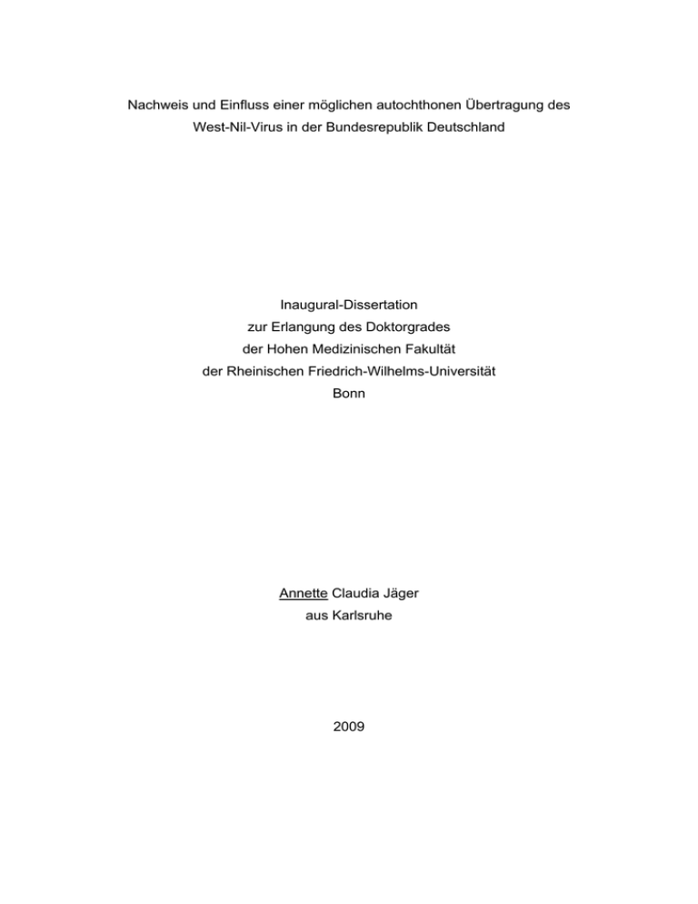 Nachweis und Einfluss einer möglichen autochthonen Übertragung des West-Nil-Virus in der Bundesrepublik Deutschland Inaugural-Dissertation zur Erlangung des Doktorgrades der Hohen Medizinischen Fakultät der Rheinischen Friedrich-Wilhelms-Universität Bonn Annette Claudia Jäger aus Karlsruhe 2009 -2- Anfertigung mit Genehmigung der Medizinischen Fakultät der Universität Bonn 1. Gutachter: Prof. Dr. Michael Faulde 2. Gutachter: Prof. Dr. Martin Exner Tag der Mündlichen Prüfung: 17.03.2009 Zentrales Institut des Sanitätsdienstes der Bundeswehr Koblenz Leiter: Flottenarzt Dr. Heinz Bergmann Diese Dissertation ist auf dem Hochschulschriftenserver der ULB Bonn unter http://hss.ulb.uni-bonn.de/diss_online elektronisch publiziert. -3- Für meinen Vater -4- -5- Inhaltsverzeichnis Abkürzungsverzeichnis .................................................................................................................... 7 Abkürzungsverzeichnis Nordamerikanische Bundesstaaten........................................................ 9 Abkürzungsverzeichnis Kanadische Territorien .......................................................................... 9 Abbildungsverzeichnis................................................................................................................... 10 Tabellenverzeichnis........................................................................................................................ 12 1. Einleitung ................................................................................................................................... 13 1.1 Arboviren ............................................................................................................................. 17 1.1.1 Systematische Einteilung .............................................................................................. 17 1.1.2 Infektionsketten............................................................................................................. 19 1.2 West-Nil-Virus (WNV)........................................................................................................ 21 1.2.1 Erreger und Erkrankungsbild ........................................................................................ 21 1.2.2. Epidemiologie .............................................................................................................. 27 1.2.2.1 Europa .................................................................................................................... 27 1.2.2.2 Afghanistan ............................................................................................................ 29 1.2.2.3 USA........................................................................................................................ 29 1.2.2.4 Kanada.................................................................................................................... 31 1.3 Andere Flaviviren................................................................................................................. 33 1.3.1 FSME-Virus .................................................................................................................. 33 1.3.2 Dengue-Virus ................................................................................................................ 39 1.4 Vektoren für WNV............................................................................................................... 45 1.4.1 Culex ............................................................................................................................. 47 1.4.2 Aedes............................................................................................................................. 50 1.4.3 Anopheles...................................................................................................................... 51 1.5 WNV-Reservoire.................................................................................................................. 51 1.5.1 Pferde ............................................................................................................................ 51 1.5.2 Andere Säugetiere als Naturreservoire für WNV ......................................................... 54 1.5.3 Vögel als WNV-Reservoir ............................................................................................ 56 1.6 Iatrogene Übertragung ......................................................................................................... 60 1.6.1 Bluttransfusion .............................................................................................................. 60 1.6.1.1 Blutspendedienst der Bundeswehr ......................................................................... 63 1.6.2 Organtransplantation ..................................................................................................... 65 1.7 Monitoring von Meningitiden in Deutschland..................................................................... 67 1.7.1 Monitoring von Meningitiden und Enzephalitiden bei der Bundeswehr ...................... 69 1.8 Immunreaktion ..................................................................................................................... 71 1.9 Impfwesen ............................................................................................................................ 73 1.9.1 Impfempfehlung des Robert Koch-Institutes ................................................................ 73 1.9.2 Impfwesen der Bundeswehr.......................................................................................... 75 2. Material und Methoden .............................................................................................................. 77 2.1 Material ................................................................................................................................ 77 2.1.1 Blutgruppenbestimmung der Bundesw