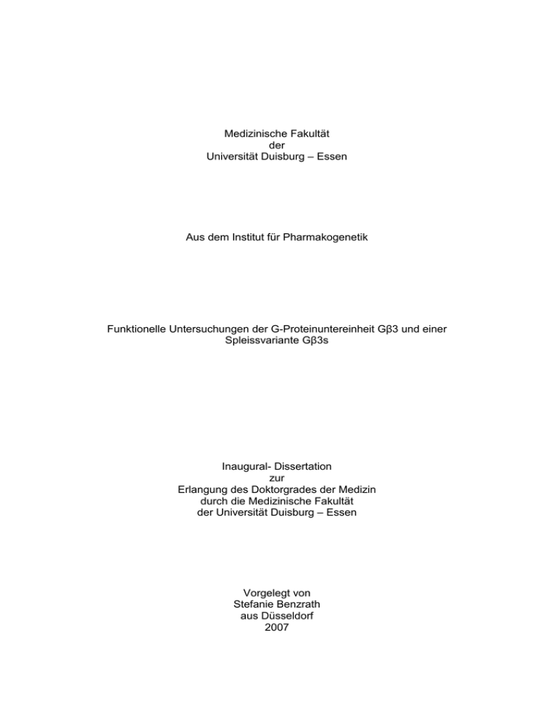 Medizinische Fakultät der Universität Duisburg – Essen Aus dem Institut für Pharmakogenetik Funktionelle Untersuchungen der G-Proteinuntereinheit Gβ3 und einer Spleissvariante Gβ3s Inaugural- Dissertation zur Erlangung des Doktorgrades der Medizin durch die Medizinische Fakultät der Universität Duisburg – Essen Vorgelegt von Stefanie Benzrath aus Düsseldorf 2007 Dekan: 1. Gutachter: 2. Gutachterin: Herr Univ.-Prof. Dr. rer. nat. K.-H. Jöckel Herr Univ.-Prof. Dr. med. W. Siffert Frau Univ.-Prof. Dr. rer. nat. V. Jendrossek Tag der mündlichen Prüfung: 4. September 2008 Inhaltsverzeichnis Inhaltsverzeichnis 1. Einleitung .......................................................................................................... 6 1.1 Signaltransduktion und die Rolle von G-Protein-gekoppelten Rezeptoren6 1.1.1 Signaltransduktion von Zellen ................................................................ 6 1.1.2 Klassifizierung der G-Proteine................................................................ 6 1.1.3 Aufbau und Funktion G-Protein-gekoppelter Rezeptorsysteme ............. 7 1.1.4 Struktur und Funktion der G-Proteine..................................................... 7 1.1.4.1 Die Gα-Untereinheit ............................................................................ 9 1.1.4.2 Die Gβ/γ-Untereinheit .......................................................................... 9 1.2 Der C825T Polymorphismus und seine Auswirkungen ............................... 10 1.3 Das Sf9-Zellsystem.................................................................................... 13 1.4 Muskarine Acetylcholin-Rezeptoren ........................................................... 14 1.5 Fragestellung .............................................................................................. 16 2. Material und Methoden .................................................................................. 17 2.1 Material ...................................................................................................... 17 2.1.1 Geräte .................................................................................................. 17 2.1.2 Chemikalien ......................................................................................... 17 2.1.3 Antikörper............................................................................................. 19 2.1.4 Enzyme ................................................................................................ 20 2.1.5 Primer................................................................................................... 20 2.1.6 Vektoren............................................................................................... 20 2.1.7 Materialien für die Zellkultur: ................................................................ 21 2.1 8 KIT........................................................................................................ 21 2.2 Methoden.................................................................................................... 21 2.2.1 Zellkultur............................................................................................... 21 2.2.2 cDNA-Herstellung................................................................................. 22 2.2.2.1. RNA-Extraktion ............................................................................. 22 2.2.2.2. Polymerase-Kettenreaktion (PCR)................................................ 22 3 Inhaltsverzeichnis 2.2.3 PCR-Amplifikation der spezifischen Sequenz ...................................... 23 2.2.4 Gel-Elektrophorese ............................................................................. 24 2.2.5 Ligation in pcDNA 3.1........................................................................... 25 2.2.6 Transformation in DH5α-Zellen und Amplifikation................................ 26 2.2.7 Sequenzierung ..................................................................................... 26 2.2.8 Restriktion ............................................................................................ 26 2.2.9 Klonierung in pFastBac ........................................................................ 27 2.2.10 Baculovirusherstellung ....................................................................... 31 2.2.11 Einzelklonselektionierung................................................................... 31 2.2.12 Nachamplifikationen ........................................................................... 31 2.2.13 Plaque Assay ..................................................................................... 32 2.2.14 Identitätsnachweis.............................................................................. 35 2.2.14.1 Membranpräparation ................................................................... 35 2.2.14.2 Proteinbestimmung...................................................................... 37 2.2.14.3 Western Blot - SDS- Polyacrylamidgel- Elektrophorese .............. 38 2.2.14.4. Elektrotransfer ............................................................................ 41 2.2.14.5. Immunogischer Nachweis von Proteinen auf einer Nitrozellulosemembran .............................................................................. 42 2.2.15 Infektion der Sf9-Zellen ...................................................................... 43 2.2.16 Calcium-Messung............................................................................... 43 2.2.16.1 Puffer und Lösungen für die Einzelzellfluorimetrie....................... 44 2.2.16.2 Durchführung der Calcium-Messung ........................................... 45 2.2.17 Statistik und Grafik ............................................................................. 46 3. Ergebnisse ...................................................................................................... 47 3.1 Nachweis der Expression rekombinanter Proteine 