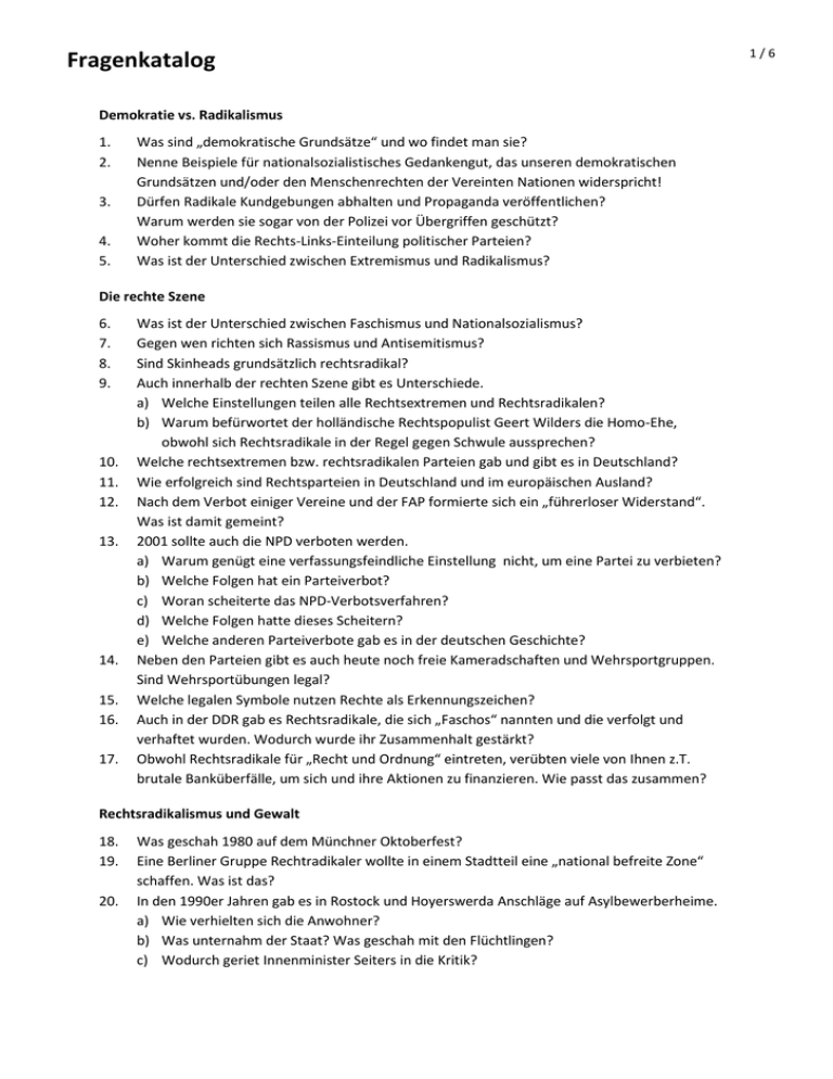 Fragenkatalog Demokratie vs. Radikalismus 1. 2. 3. 4. 5. Was sind „demokratische Grundsätze“ und wo findet man sie? Nenne Beispiele für nationalsozialistisches Gedankengut, das unseren demokratischen Grundsätzen und/oder den Menschenrechten der Vereinten Nationen widerspricht! Dürfen Radikale Kundgebungen abhalten und Propaganda veröffentlichen? Warum werden sie sogar von der Polizei vor Übergriffen geschützt? Woher kommt die Rechts-Links-Einteilung politischer Parteien? Was ist der Unterschied zwischen Extremismus und Radikalismus? Die rechte Szene 6. 7. 8. 9. 10. 11. 12. 13. 14. 15. 16. 17. Was ist der Unterschied zwischen Faschismus und Nationalsozialismus? Gegen wen richten sich Rassismus und Antisemitismus? Sind Skinheads grundsätzlich rechtsradikal? Auch innerhalb der rechten Szene gibt es Unterschiede. a) Welche Einstellungen teilen alle Rechtsextremen und Rechtsradikalen? b) Warum befürwortet der holländische Rechtspopulist Geert Wilders die Homo-Ehe, obwohl sich Rechtsradikale in der Regel gegen Schwule aussprechen? Welche rechtsextremen bzw. rechtsradikalen Parteien gab und gibt es in Deutschland? Wie erfolgreich sind Rechtsparteien in Deutschland und im europäischen Ausland? Nach dem Verbot einiger Vereine und der FAP formierte sich ein „führerloser Widerstand“. Was ist damit gemeint? 2001 sollte auch die NPD verboten werden. a) Warum genügt eine verfassungsfeindliche Einstellung nicht, um eine Partei zu verbieten? b) Welche Folgen hat ein Parteiverbot? c) Woran scheiterte das NPD-Verbotsverfahren? d) Welche Folgen hatte dieses Scheitern? e) Welche anderen Parteiverbote gab es in der deutschen Geschichte? Neben den Parteien gibt es auch heute noch freie Kameradschaften und Wehrsportgruppen. Sind Wehrsportübungen legal? Welche legalen Symbole nutzen Rechte als Erkennungszeichen? Auch in der DDR gab es Rechtsradikale, die sich „Faschos“ nannten und die verfolgt und verhaftet wurden. Wodurch wurde ihr Zusammenhalt gestärkt? Obwohl Rechtsradikale für „Recht und Ordnung“ eintreten, verübten viele von Ihnen z.T. brutale Banküberfälle, um sich und ihre Aktionen zu finanzieren. Wie passt das zusammen? Rechtsradikalismus und Gewalt 18. 19. 20. Was geschah 1980 auf dem Münchner Oktoberfest? Eine Berliner Gruppe Rechtradikaler wollte in einem Stadtteil eine „national befreite Zone“ schaffen. Was ist das? In den 1990er Jahren gab es in Rostock und Hoyerswerda Anschläge auf Asylbewerberheime. a) Wie verhielten sich die Anwohner? b) Was unternahm der Staat? Was geschah mit den Flüchtlingen? c) Wodurch geriet Innenminister Seiters in die Kritik? 1/6 Fragenkatalog 21. 22. Nach Anschlägen in Mölln und Solingen sprach Bundeskanzler Helmut Kohl von „assozialer Gewalt“, die es überall gebe. Bundespräsident Richard von Weizsäcker reagierte nicht so. Was sagte er? Rechtsradikale verübten über Jahre eine Mordserie, die unter dem Begriff „Döner-Morde“ durch die Medien ging. a) Wer waren die Opfer? b) Wer steckte hinter den Morden? c) Welche (gravierenden) Fehler wurden bei der Aufklärung der Mordserie gemacht? d) Zu der Mordserie gibt es ein Bekennervideo. Wie werden darin die Morde dargestellt und wie wirkt das Video? Die Herrschaft der Nationalsozialisten 23. 24. 25. 26. 27. 28. 29. Hitler überzeugte viele Menschen mit der Senkung der Arbeitslosigkeit. a) Wie veränderte sich die Arbeitslosenquote, nachdem Hitler an die Macht kam? b) Wodurch erreichte er dies? c) Welche Folgen hat es für einen Staat, wenn er dauerhaft Arbeitsbeschaffungsmaßnahmen bereit stellt? Deutschland musste laut dem Versailler Vertrag hohe Reparationszahlungen leisten. a) Was sind Reparationszahlungen? b) Welche Folgen hatte das für den Staat und wie nutzte Hitler die Situation? Wie ging / geht Propaganda mit auftretenden Problemen, sachlichen Informationen und Argumenten um? Welche Merkmale hatten typische Wahlplakate der Nazis? Kam Hitler legal an die Macht? Welche Erziehungsziele verfolgte Hitler? Wie stellte er sich die Jugend vor? Die Nationalsozialisten verfolgten die sog. „Rassenlehre“. a) Wie sah darin der perfekte Mensch aus und wie nannte man ihn? b) Inwiefern entsprach Hitlerselbst diesem Ideal? c) Wie passte der Antisemitismus der Nationalsozialisten in deren Rassenlehre? d) Was geschah mit politischen Gegnern, Andersdenkenden, Juden, Behinderten, …? Nach dem Krieg 30. 31. 32. 33. 34. 35. Den Deutschen wird oft eine Kollektivschuld am Zweiten Weltkrieg zugeschrieben. a) Was versteht man darunter? b) Warum wird sie von vielen Menschen heute als ungerecht empfunden? Wie entwickelte sich die Arbeitslosigkeit in den 1950ern, den sog. „Wirtschaftswunderjahren“? Rechte Parteien behaupten oft, die Gastarbeiter, die seit den 1960er Jahren nach Deutschland kamen, hätten den Deutschen Arbeitsplätze weggenommen. Stimmt das? Warum führt eine hohe Arbeitslosenquote häufig dazu, dass extreme Parteien bei Wahlen mehr Stimmen erhalten? In Bundestag sitzen derzeit die CDU/CSU, die SPD, die Grünen, die FDP und die Linke. a) Wo sind diese im Rechts-Links-Spektrum einzuordnen? b) Wohin gehören Parteien wie die DKP, die Republikaner und die NPD? Welche Ziele verfolgte die „Ich bin anders“-Aktion? Was hatte die Aktion mit Toleranz und Gleichberechtigung zu tun? 2/6 Fragenkatalog Antwortmöglichkeiten Demokratie vs. Radikalismus 1. 2. 3. 4. 5. Zu den demokratischen Grundsätzen zählen u.a. Menschenwürde, Freiheit, Rechtsstaatlichkeit, Gleichheit vor dem Gesetz, Glaubens- und Gewissensfreiheit, freie Meinungsäußerung und Pressefreiheit, Versammlungsfreiheit, Vereinigungsfreiheit, Briefgeheimnis, Freizügigkeit, Recht auf Eigentum. Sie finden sich z.B. in den ersten Artikeln des Grundgesetzes und in der Menschenrechtscharta der Vereinten Nationen. Rassendiskriminierung widerspricht der Gleichheit vor dem Gesetz. Diskriminierung aufgrund der Zugehörigkeit zu einer Religion widerspricht der Religionsfreiheit. Ghettoisierung der Juden widerspricht der Fre