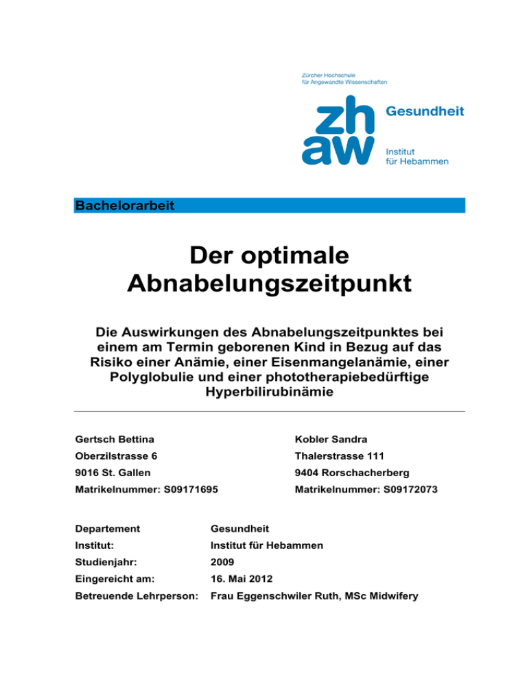 Bachelorarbeit Der optimale Abnabelungszeitpunkt Die Auswirkungen des Abnabelungszeitpunktes bei einem am Termin geborenen Kind in Bezug auf das Risiko einer Anämie, einer Eisenmangelanämie, einer Polyglobulie und einer phototherapiebedürftige Hyperbilirubinämie Gertsch Bettina Kobler Sandra Oberzilstrasse 6 Thalerstrasse 111 9016 St. Gallen 9404 Rorschacherberg Matrikelnummer: S09171695 Matrikelnummer: S09172073 Departement Gesundheit Institut: Institut für Hebammen Studienjahr: 2009 Eingereicht am: 16. Mai 2012 Betreuende Lehrperson: Frau Eggenschwiler Ruth, MSc Midwifery Bachelorarbeit 2011/ 2012 Gertsch Bettina – Kobler Sandra Inhaltsverzeichnis Abstract.................................................................................................................. 5 1. Die Auswirkungen des Abnabelungszeitpunktes bei einem am Termin geborenen Kind in Bezug auf das Risiko einer Anämie, einer Eisenmangelanämie, einer Polyglobulie und einer phototherapiebedürftige Hyperbilirubinämie................................................................................................ 6 1.1 Begründung der gewählten Thematik ............................................................... 6 1.2 Problemstellung................................................................................................. 6 1.3 Themeneingrenzung ......................................................................................... 7 1.4 Zielsetzung und Relevanz für die Praxis ........................................................... 8 1.5 Fragestellung zum Zeitpunkt der Abnabelung................................................... 9 2. Methodisches Vorgehen................................................................................. 10 2.1 Ein- und Ausschlusskriterien ........................................................................... 10 2.2 Datensammlung .............................................................................................. 11 2.3 Begründung der Auswahl der Studien............................................................. 12 2.4 Vergleich der Studien untereinander............................................................... 13 3. Theoretischer Hintergrund ............................................................................. 15 3.1 Die verschiedenen Abnabelungszeitpunkte und aktuelle Empfehlungen aus der Grundlagenliteratur ......................................................................................... 15 3.2 Praktisches Vorgehen bei der Abnabelung eines Neugeborenen................... 16 3.3 Die Umstellung des fetalen Herzkreislaufs...................................................... 18 3.4 Blutvolumen und Atmung ................................................................................ 22 3.5 Blutzusammensetzung .................................................................................... 22 3.5.1 Hämoglobin............................................................................................ 23 3.5.2 Hämatokrit.............................................................................................. 23 3.6 Anämie ............................................................................................................ 23 3.6.1 Hypochrome mikrozytäre Anämien........................................................ 24 3.6.2 Hyperchrome makrozytäre Anämien ...................................................... 24 3.6.3 Normochrome normozytäre Anämien..................................................... 25 3.7 Eisenmangelanämie........................................................................................ 26 Seite 2 von 95 Bachelorarbeit 2011/ 2012 Gertsch Bettina – Kobler Sandra 3.8 Polyglobulie ..................................................................................................... 27 3.9 Erythrozytenabbau .......................................................................................... 28 3.9.1 Hyperbilirubinämie .................................................................................. 29 3.9.2 Phototherapie......................................................................................... 32 4. Qualitätsbeurteilung und Ergebnisse der verwendeten Studien................ 33 4.1 Effect of delayed versus early umbilical cord clamping on neonatal outcomes and iron status at 4 months: a randomised controlled trial (Andersoon et al., 2011) .............................................................................................................................. 33 4.1.1 Qualität der Studie von Andersoon et al. (2011).................................... 34 4.1.2 Ergebnisse der Studie Andersoon et al. (2011)...................................... 35 4.2 Timing of umbilical cord clamping and neonatal haematological status (Jaleel et al., 2009) ........................................................................................................... 36 4.2.1 Qualität der Studie von Jaleel et al. (2009)............................................ 37 4.2.2 Ergebnisse der Studie Jaleel et al. (2009) ............................................. 38 4.3 Effect of Timing of Umbilical Cord Clamp on Newborns’ Iron Status and its Relation to Delivery Type (Shirvani et al., 2010) ................................................... 38 4.3.1 Qualität der Studie von Shirvani et al. (2010) ........................................ 39 4.3.2 Ergebnisse der Studie Shirvani et al. (2010) ......................................... 40 4.4 Effect of timing of umbilical cord clamping of term infats on maternal and neonatal outcomes (McDonald & Middleton, 2009) .............................................. 41 4.4.1 Qualität des Reviews von McDonald & Middleton (2009)...................... 42 4.4.2 Ergebnisse des Reviews McDonald & Middleton (2009) ....................... 43 4.5 Late vs early clamping of the umbilical cord in full-term neonates (Hutton & Hassan, 2007) .....